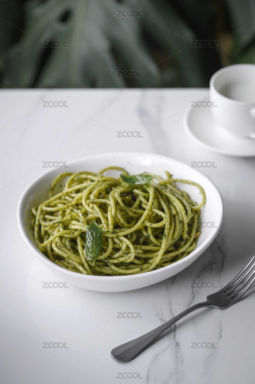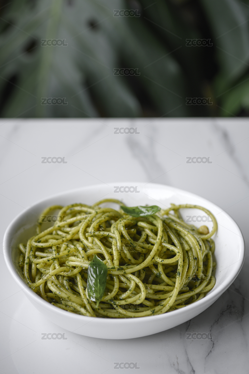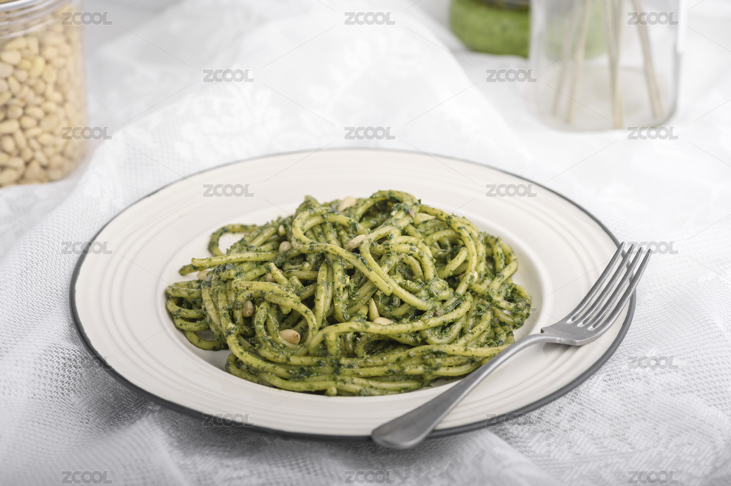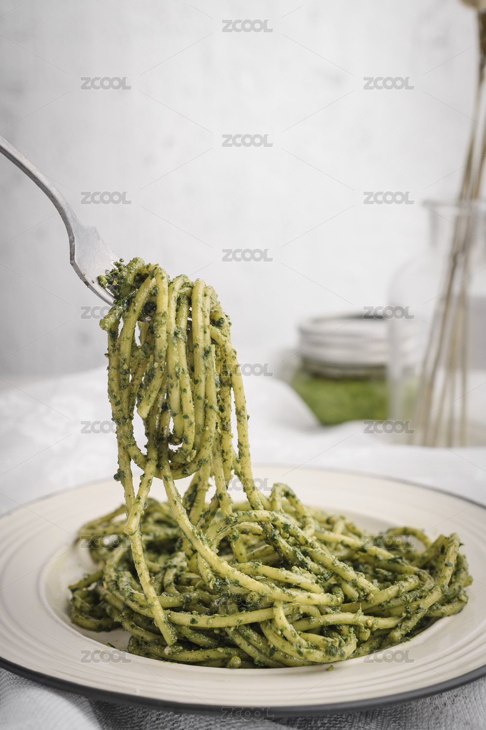 白色盤子里的青醬意大利面