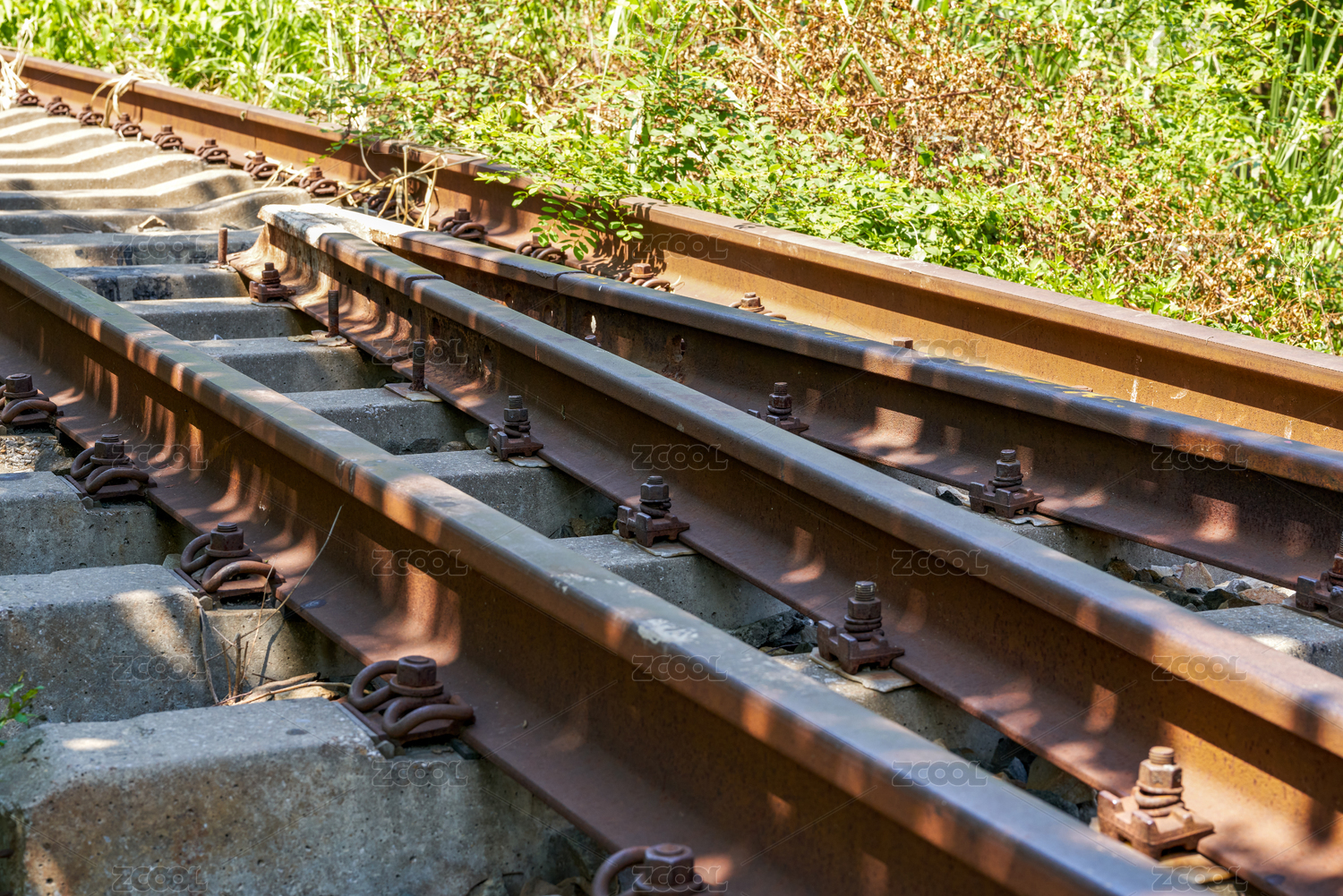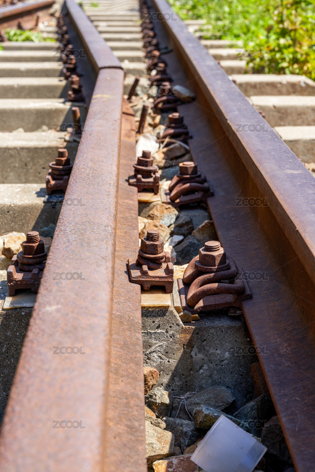 野外老舊生銹的鐵路分叉鐵軌和鉚釘特寫