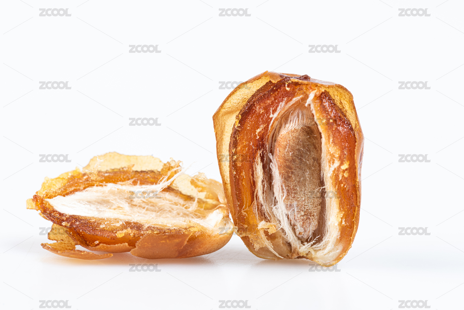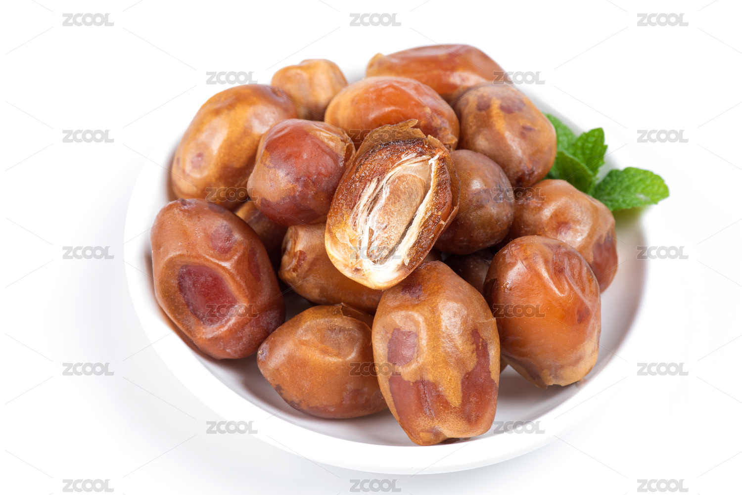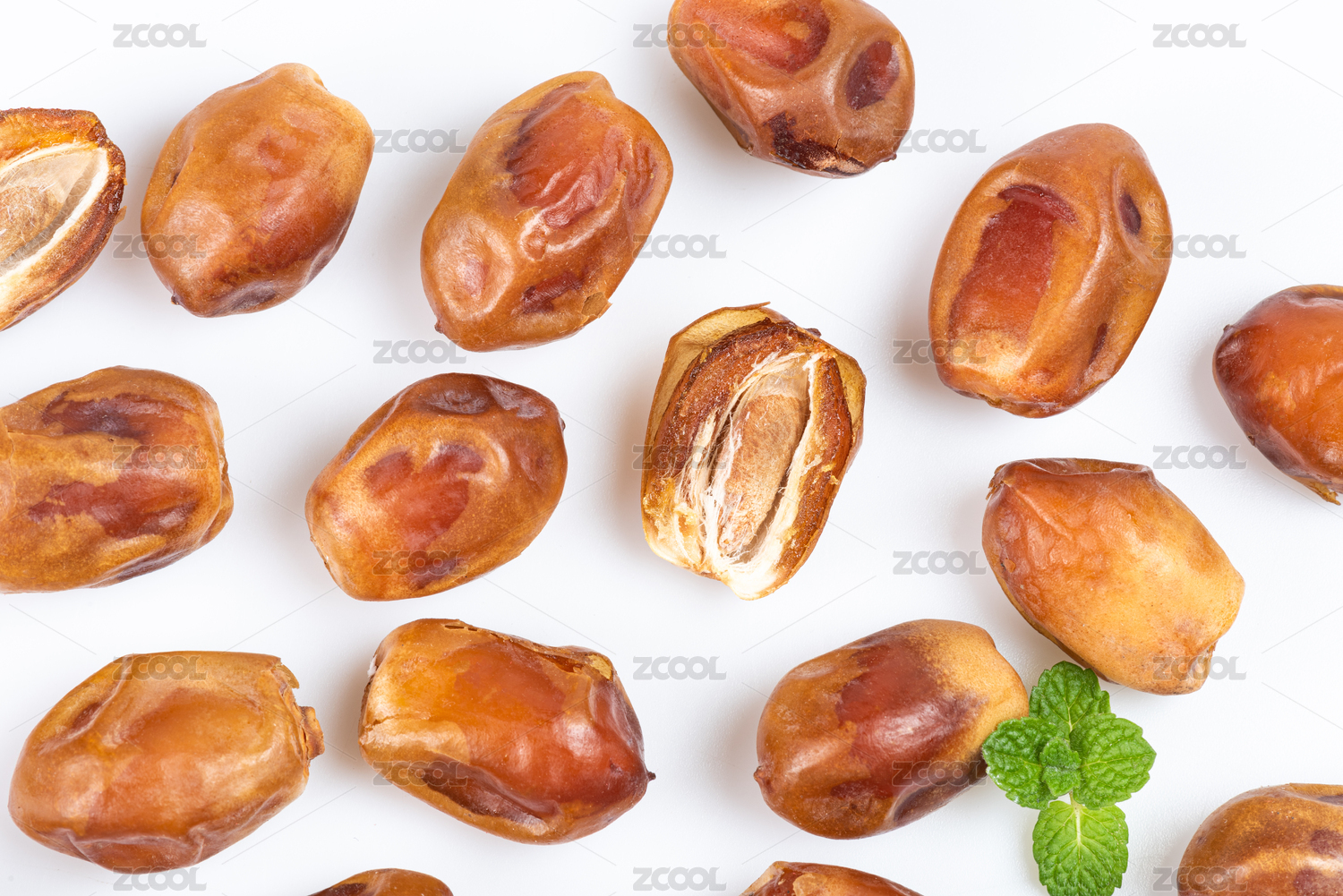 白底上放著兩個完整的黃金椰棗和半邊椰棗
