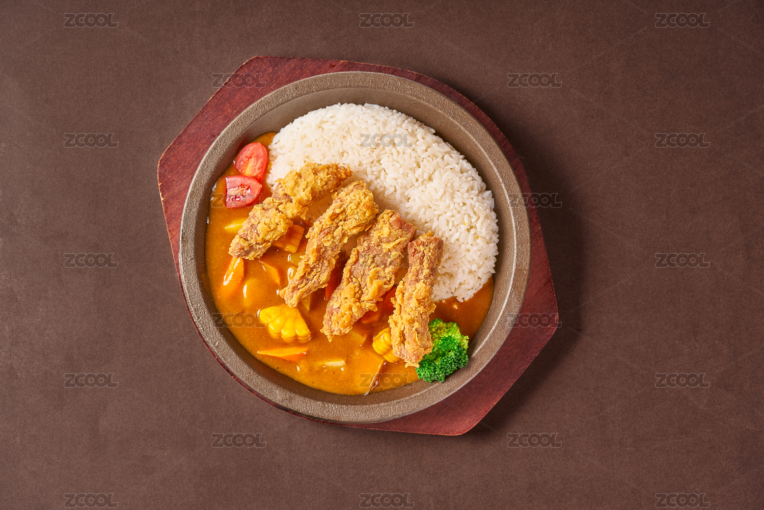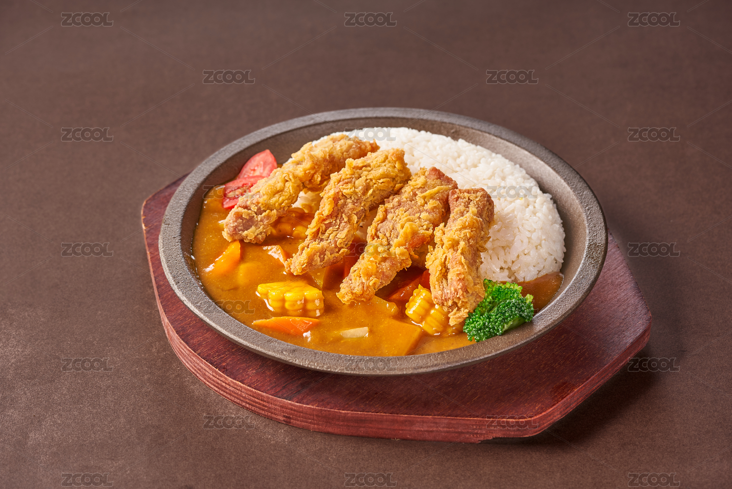 放在鐵盤里的無(wú)骨炸雞咖喱鐵板飯