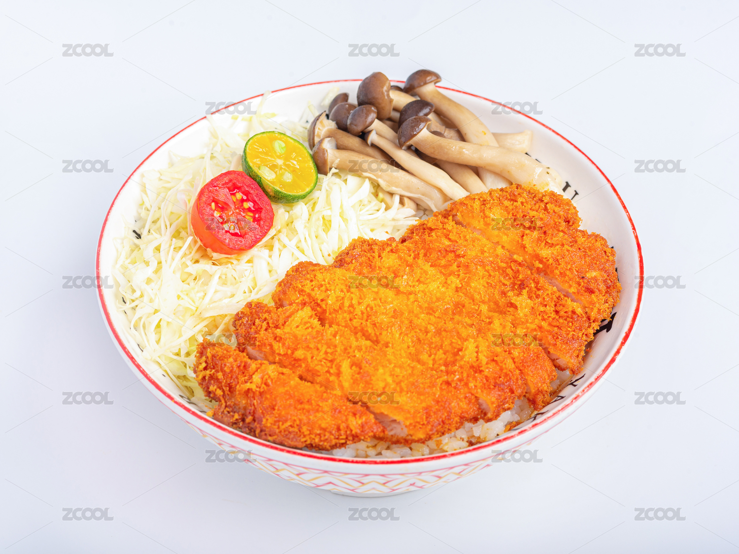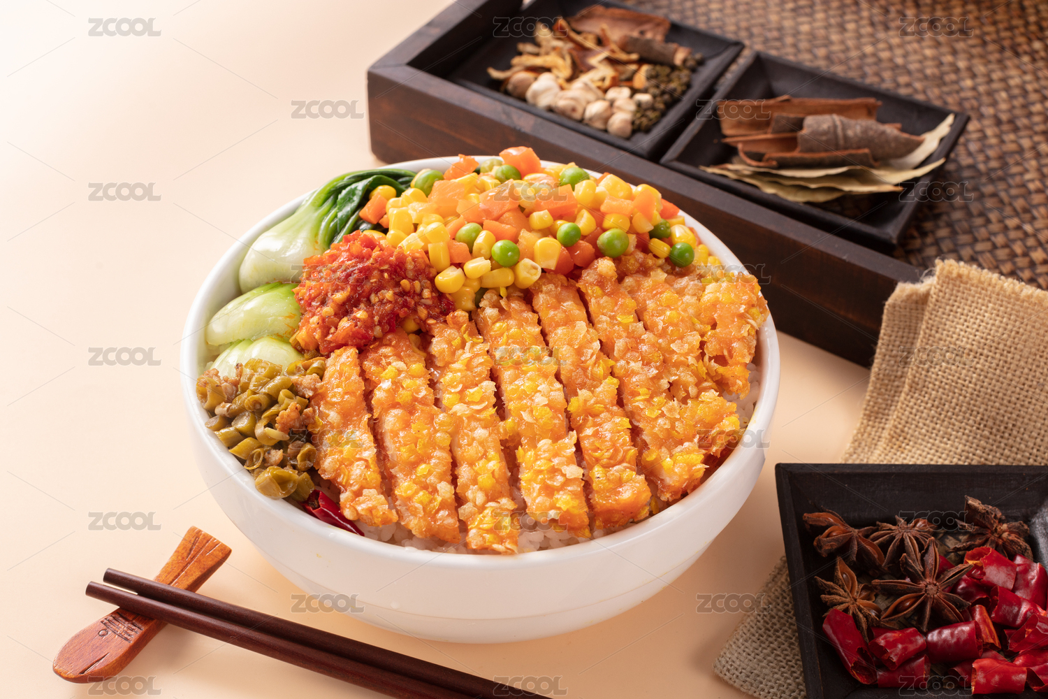 白色碗里的炸雞排彩色玉米套飯