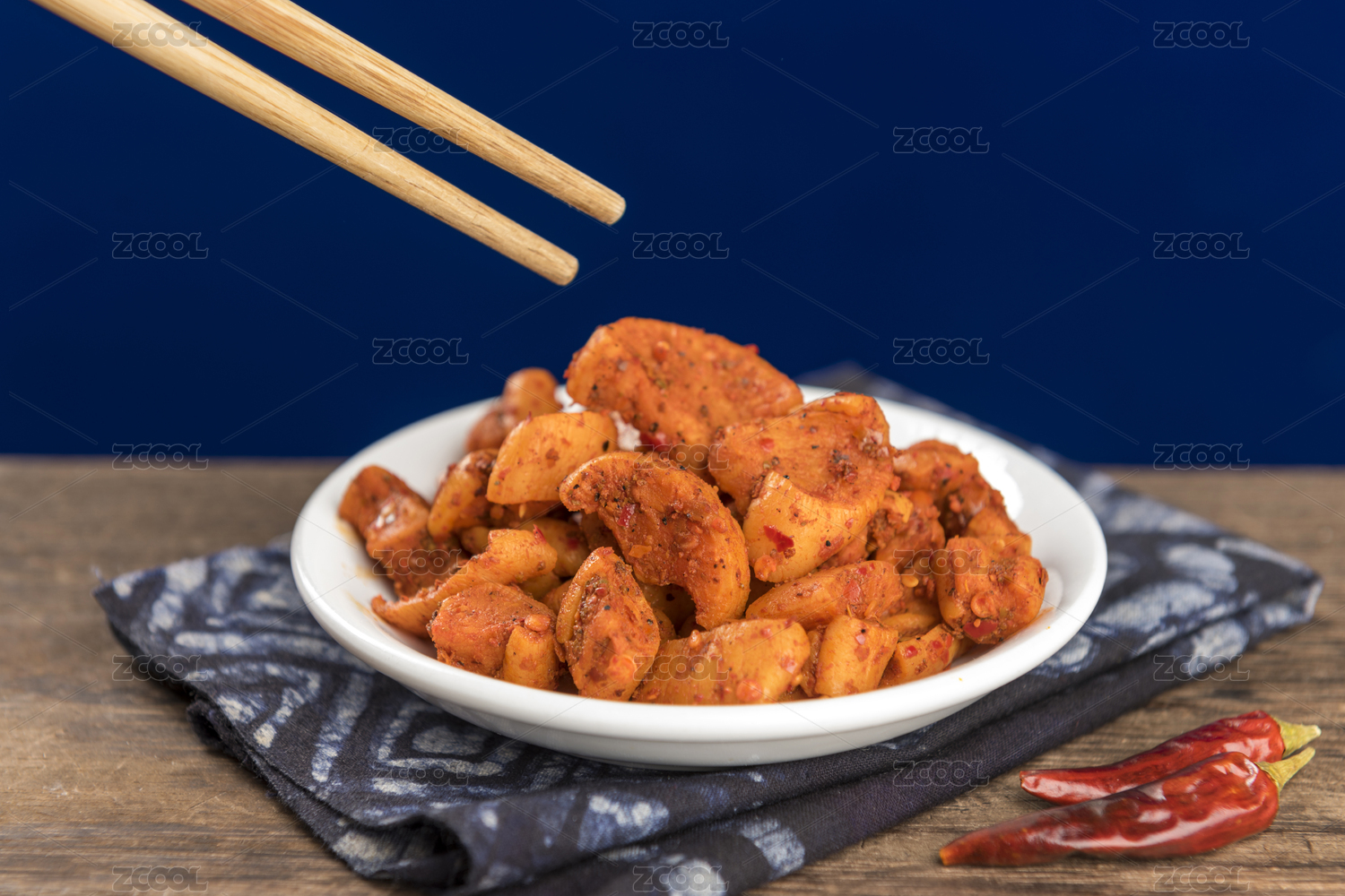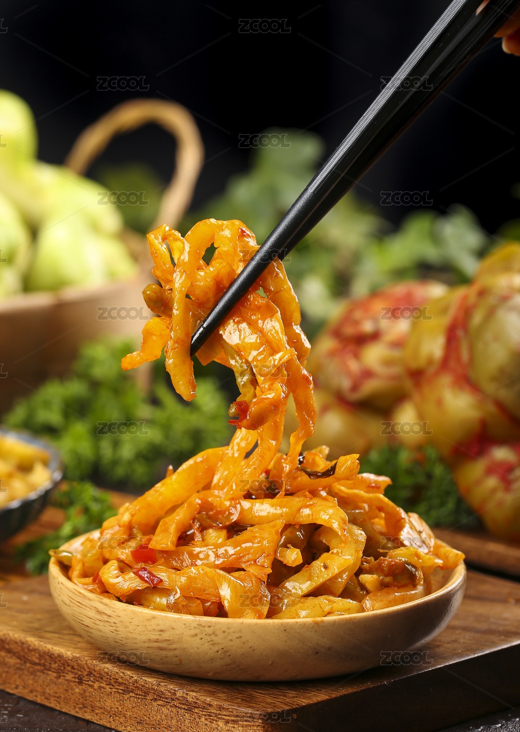 木板上放著一盤香辣蘿卜干和筷子上夾著蘿卜