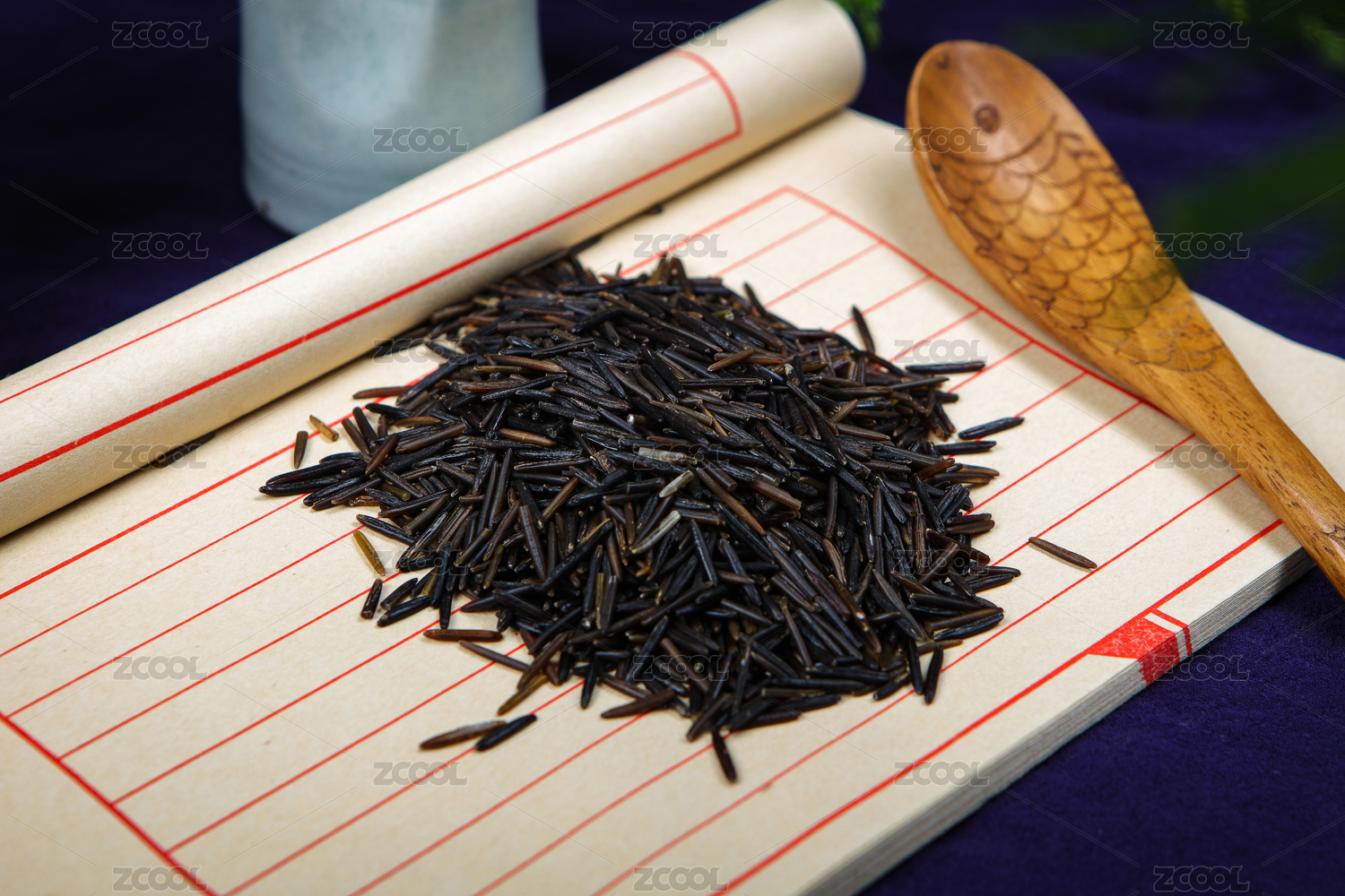 傳統(tǒng)中式復(fù)古場景中裝在木盤中的菰米俯拍
