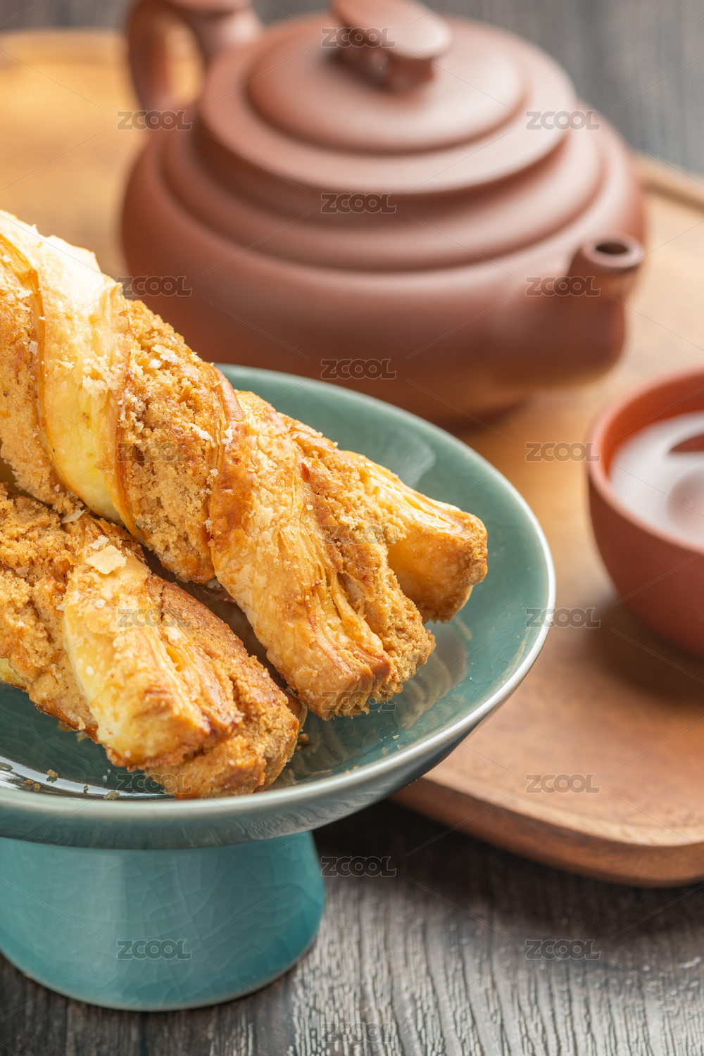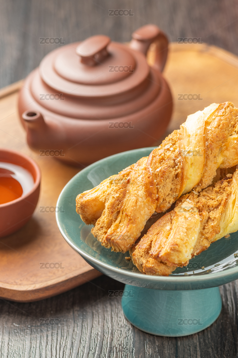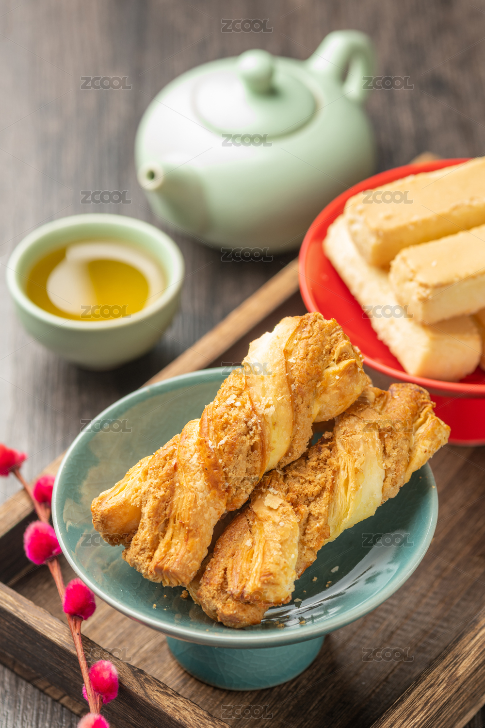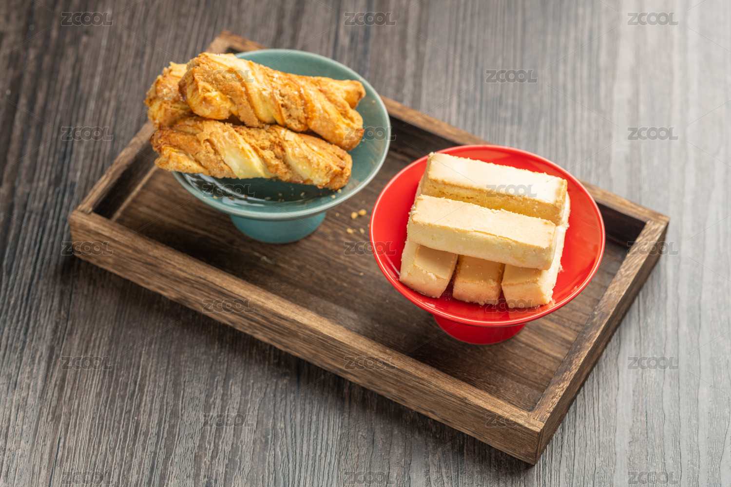 奶皮酥與麻醬酥擺放在木托盤上特寫
