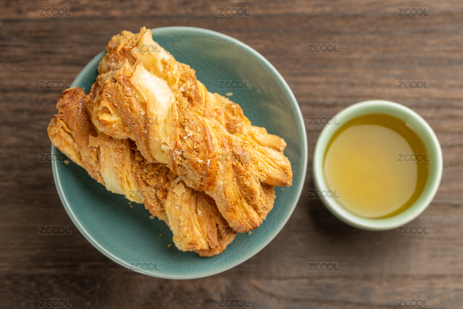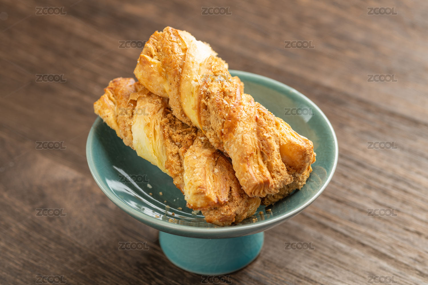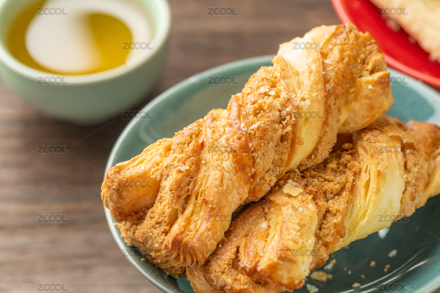一盤麻醬酥擺放在木桌面上特寫