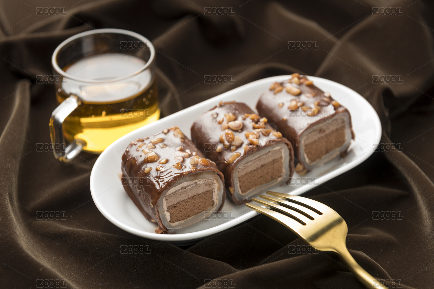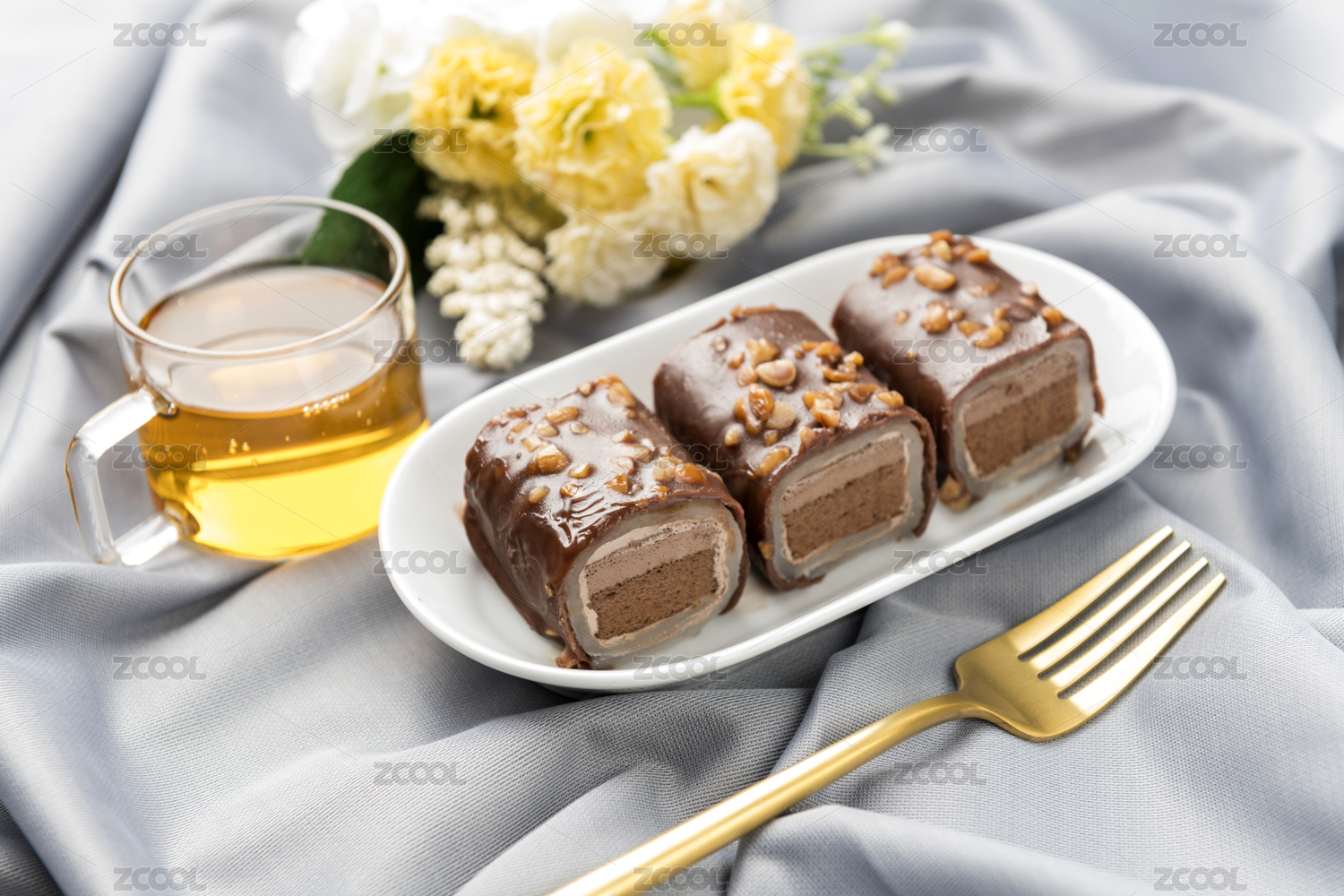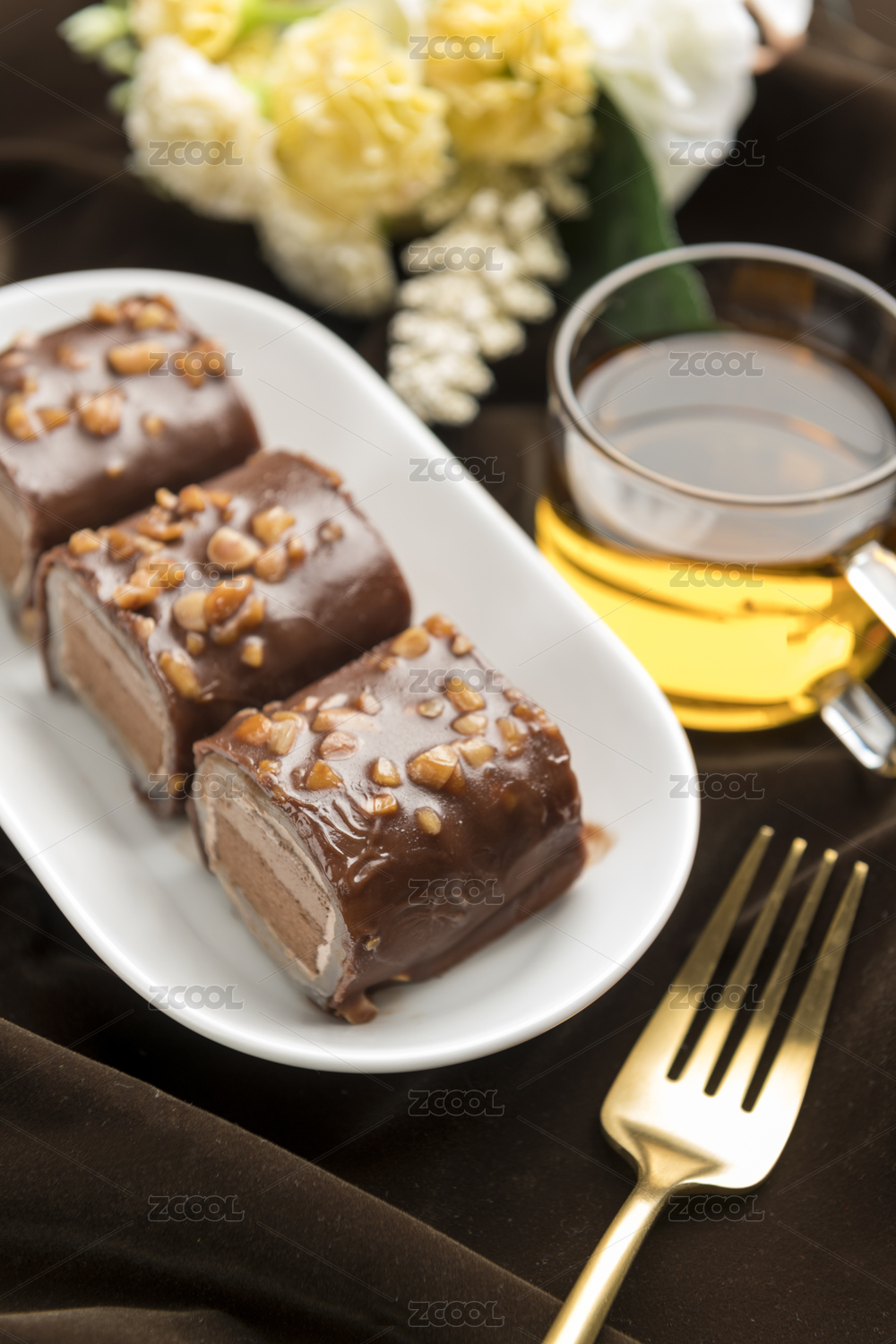 一盤巧克力脆皮蛋糕卷與咖啡奶茶特寫