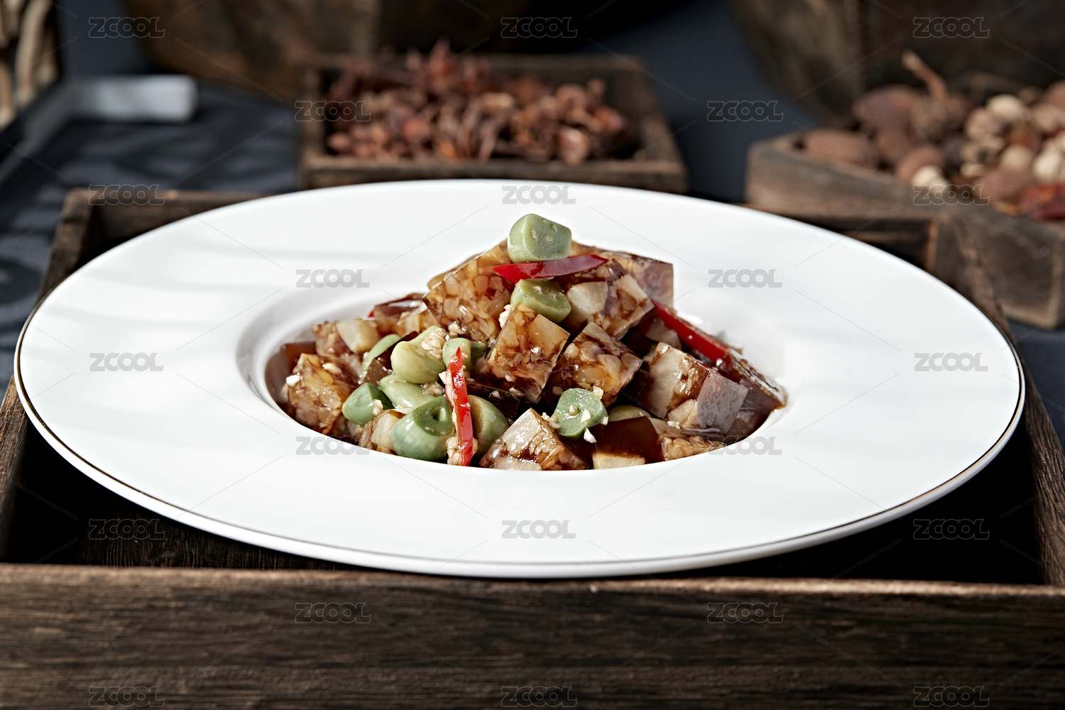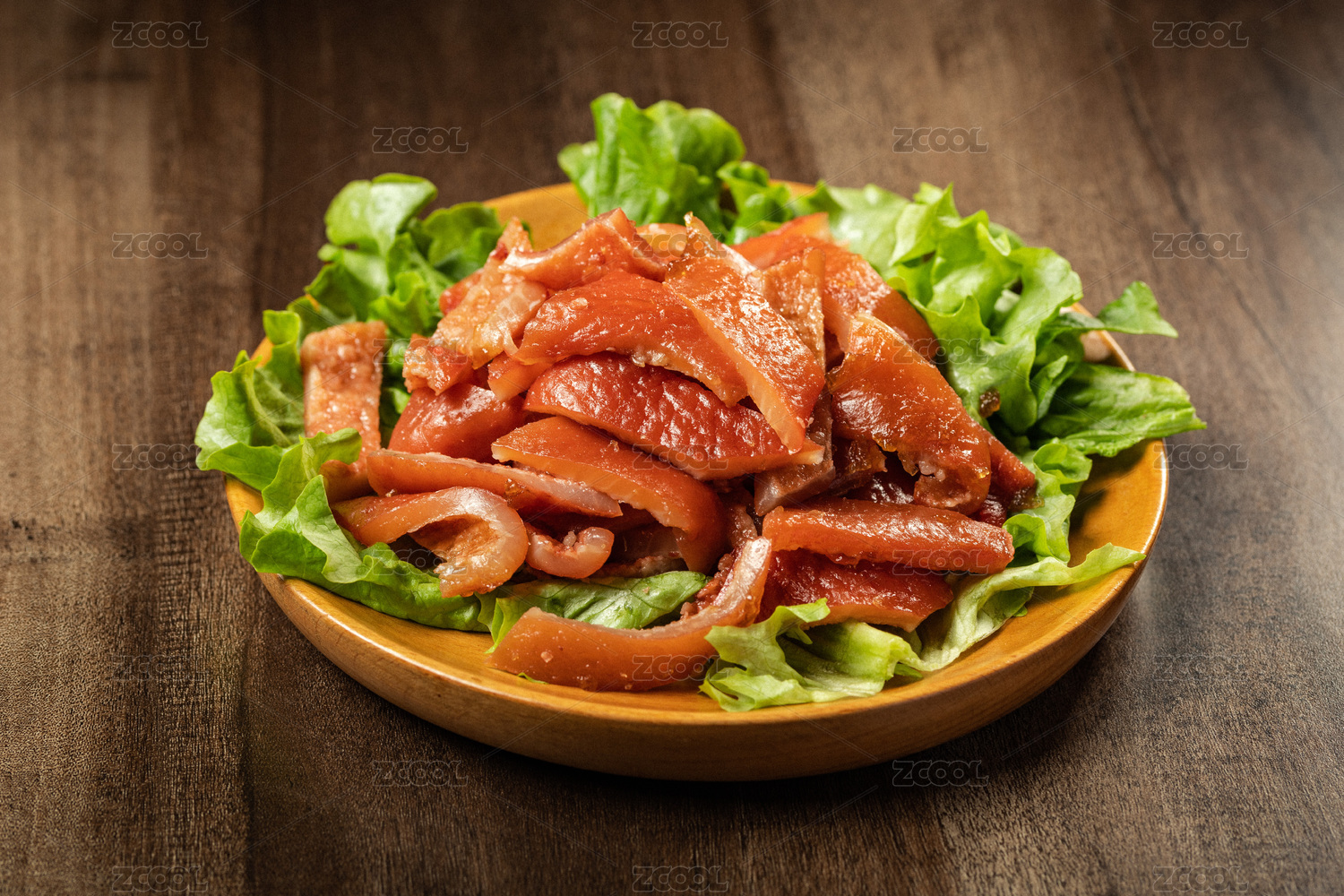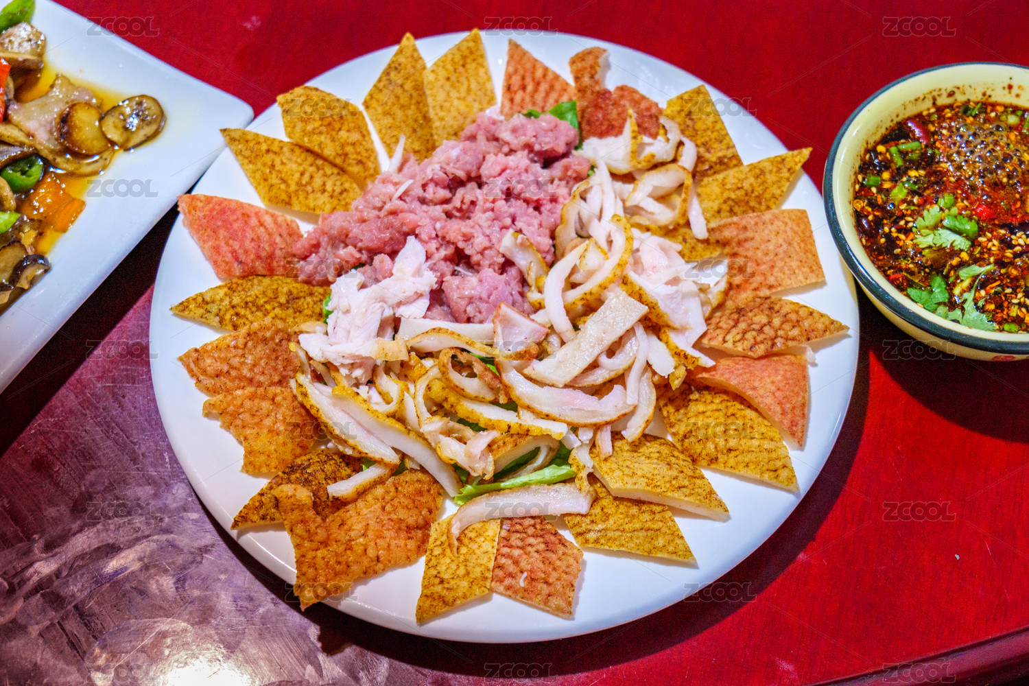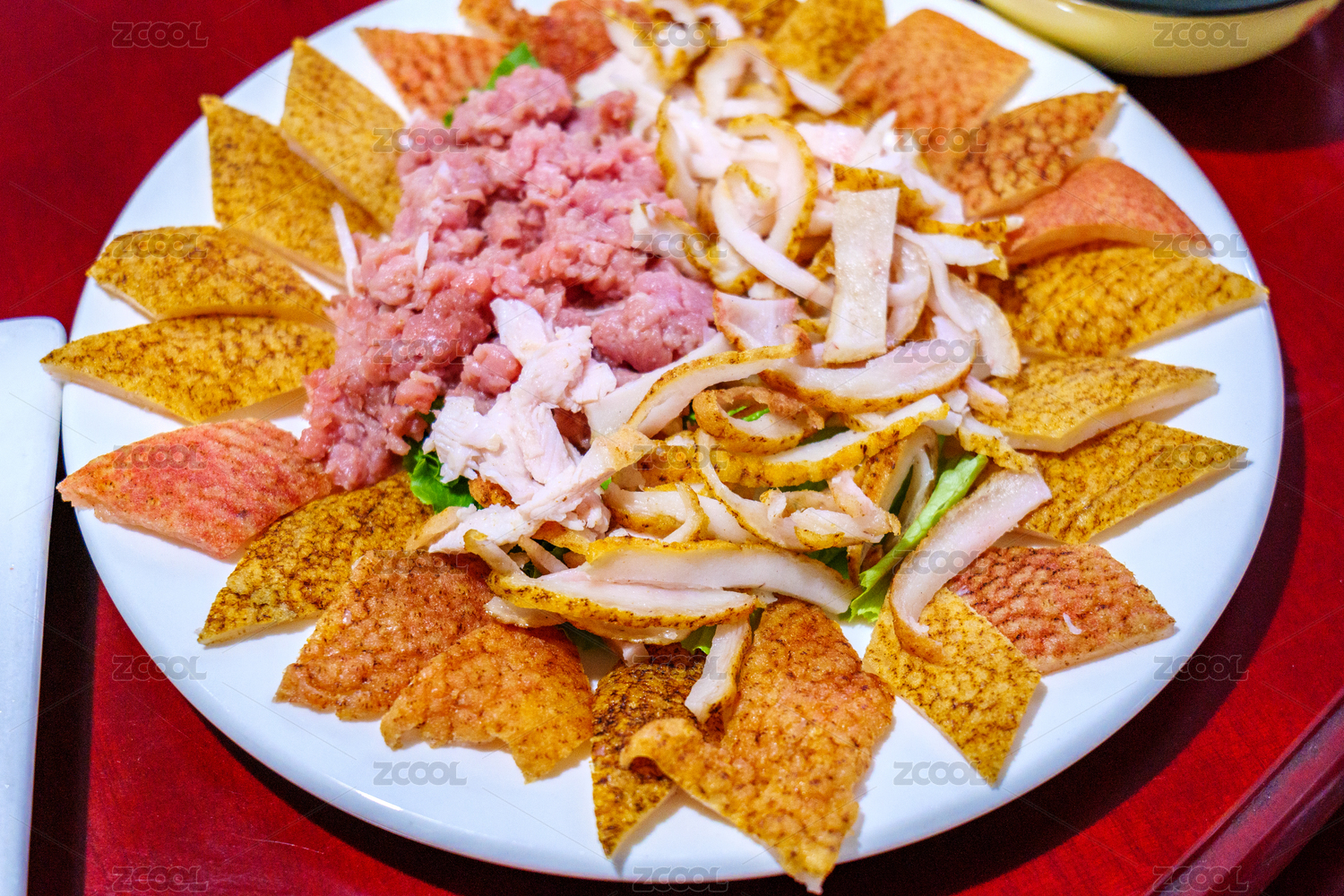 木紋桌上面有一盤涼拌豬皮