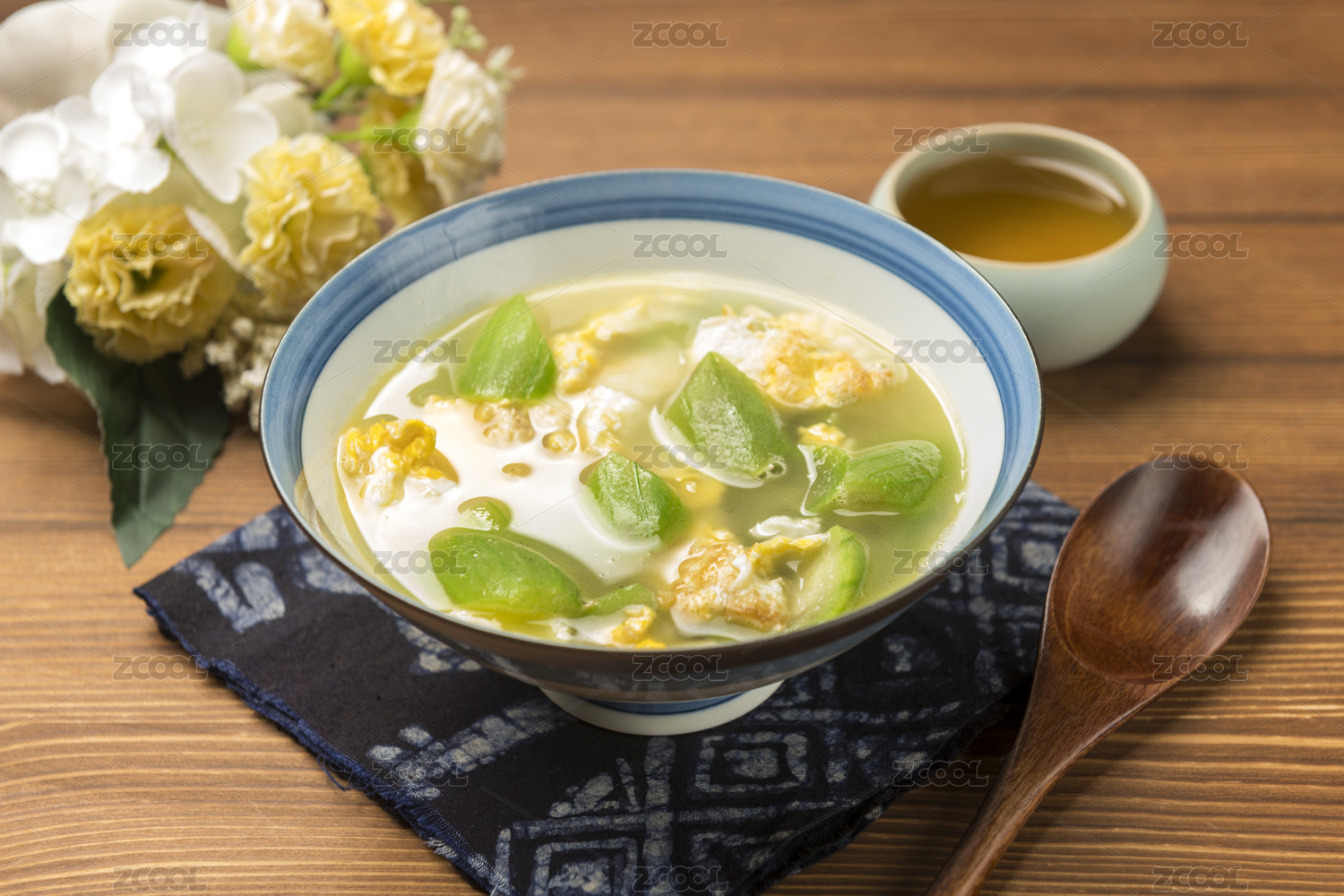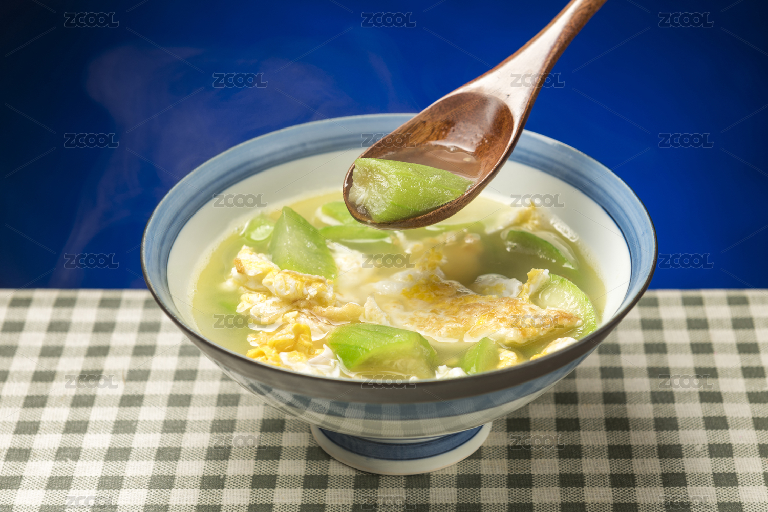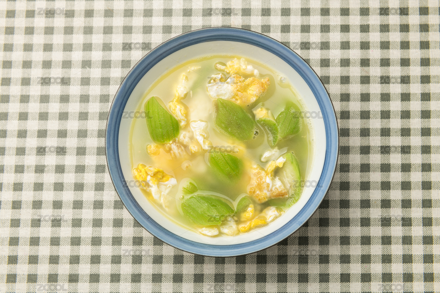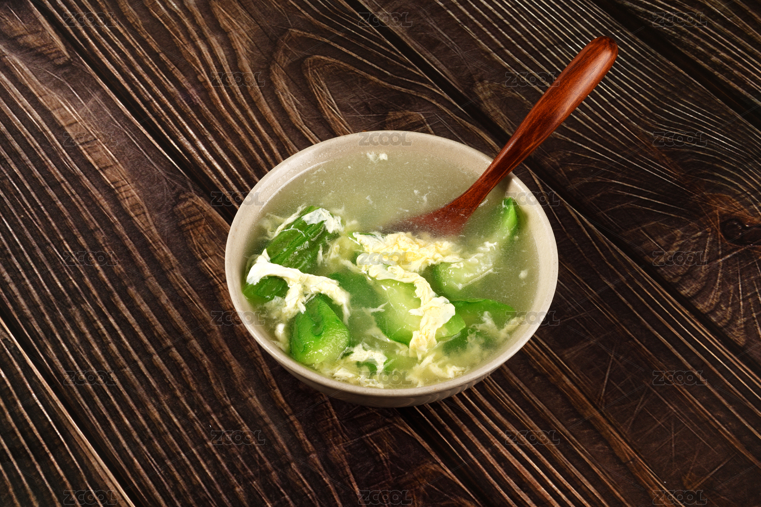 一碗絲瓜雞蛋湯擺放在桌面上特寫