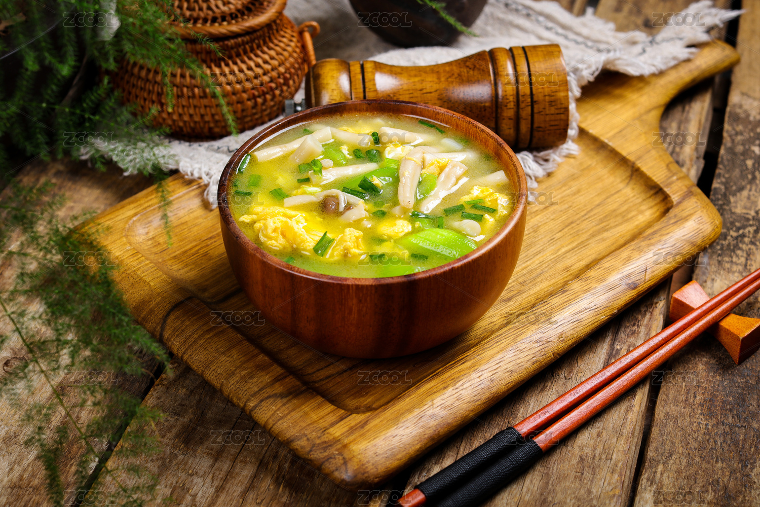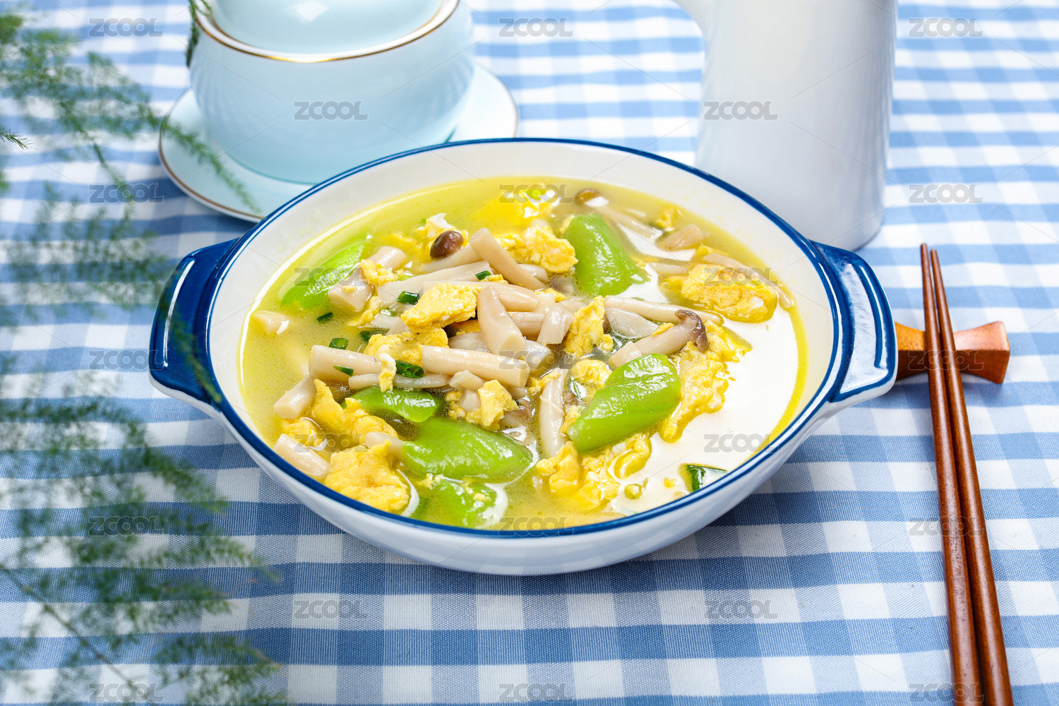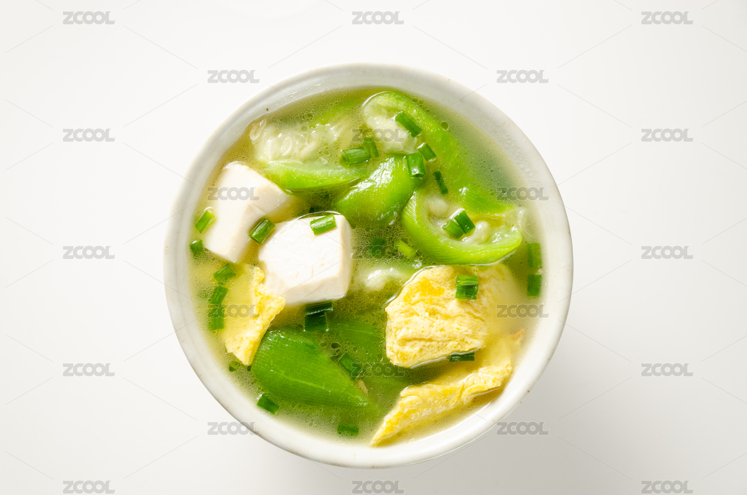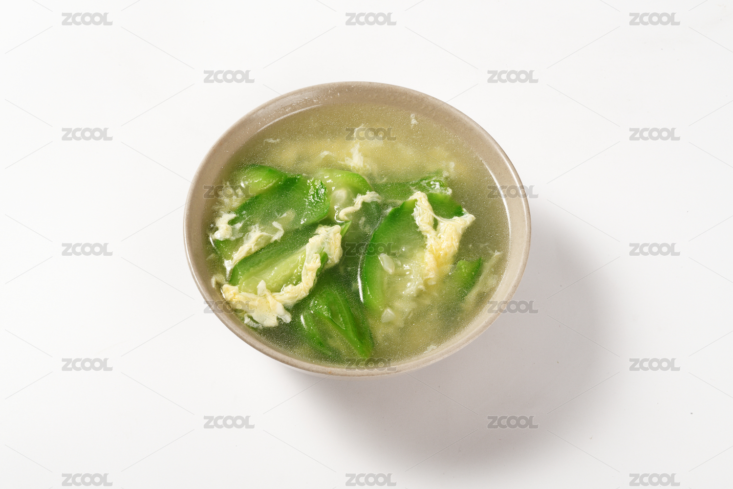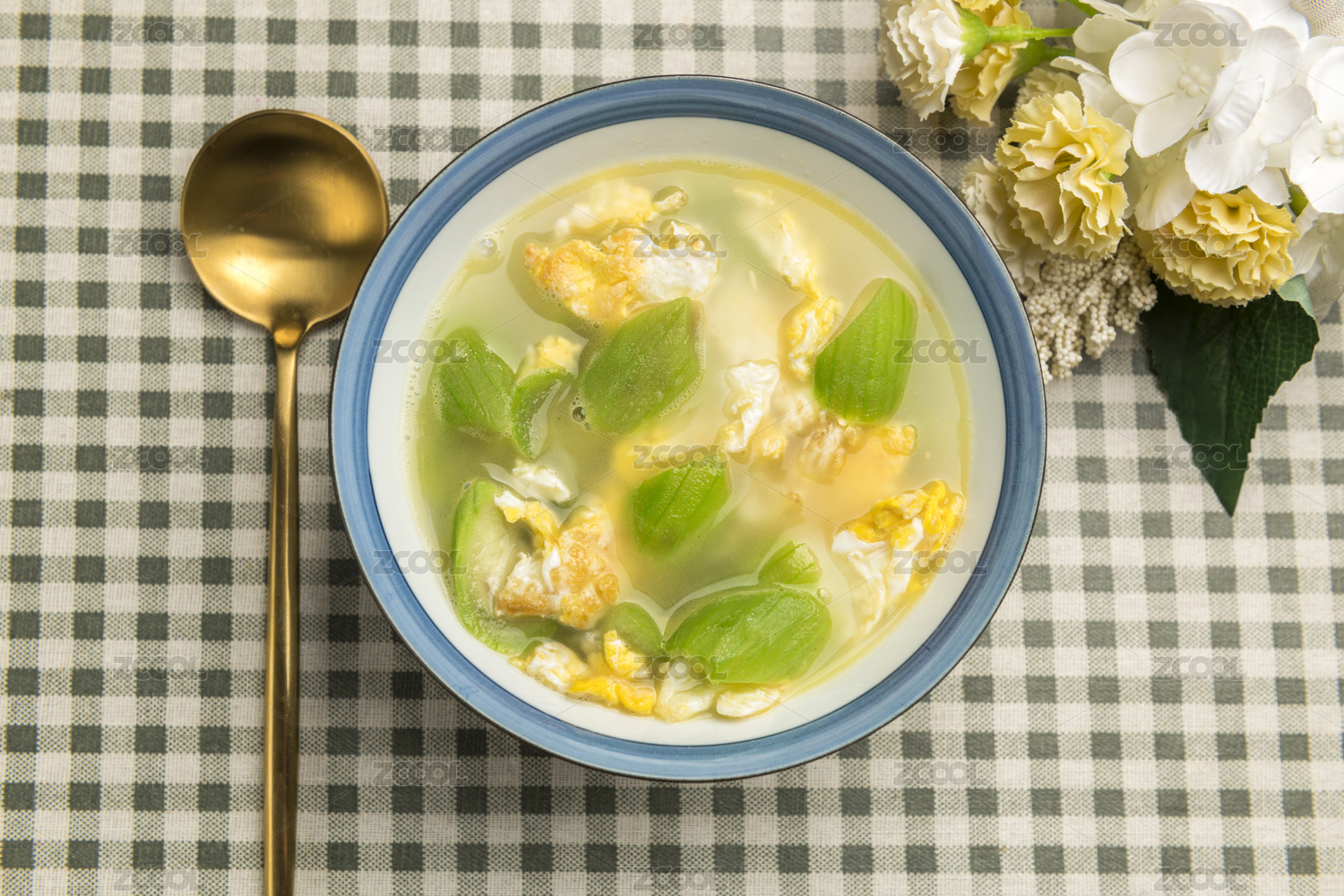一碗絲瓜雞蛋湯擺放在桌面上特寫