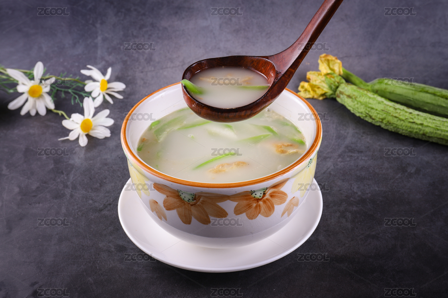 放在深色背景上碗里用木勺舀起來的絲瓜蛋湯