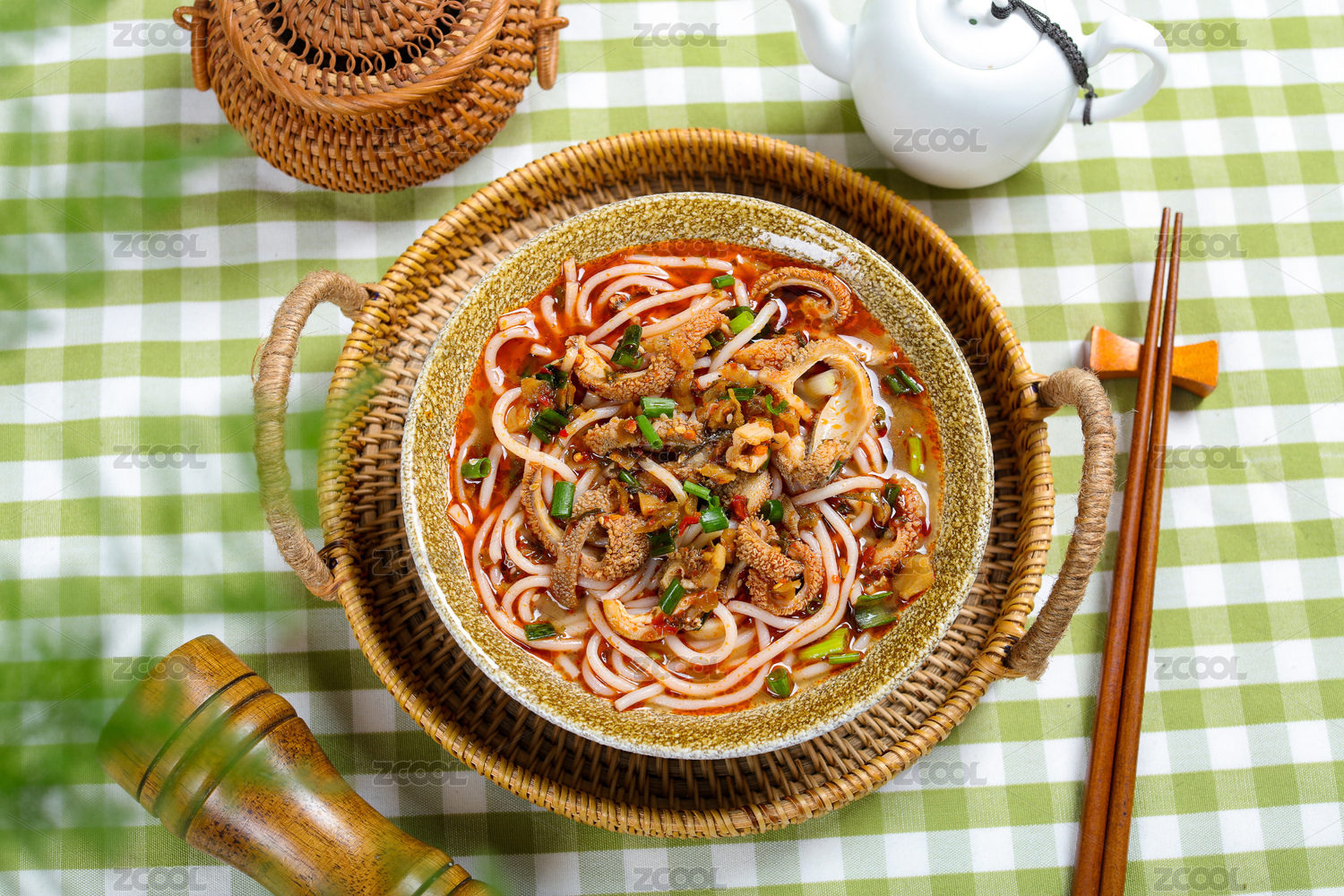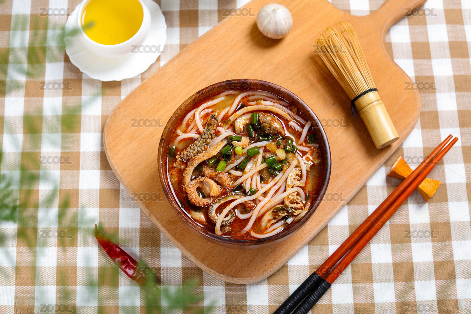大碗里的四鮮米線筷子挑著清湯羊雜米線