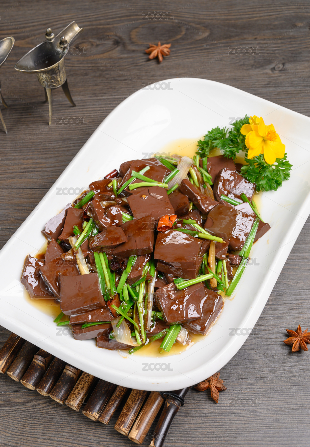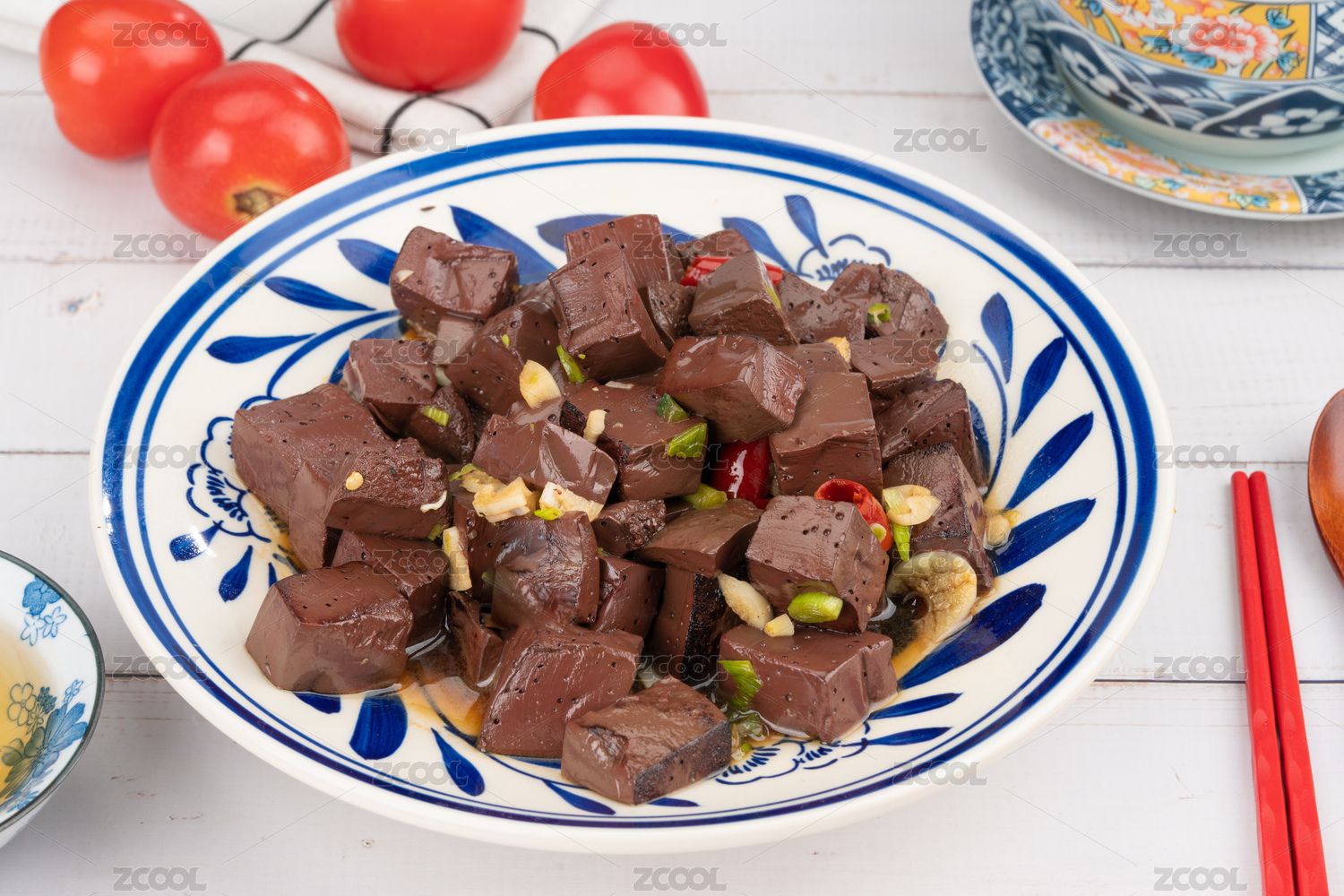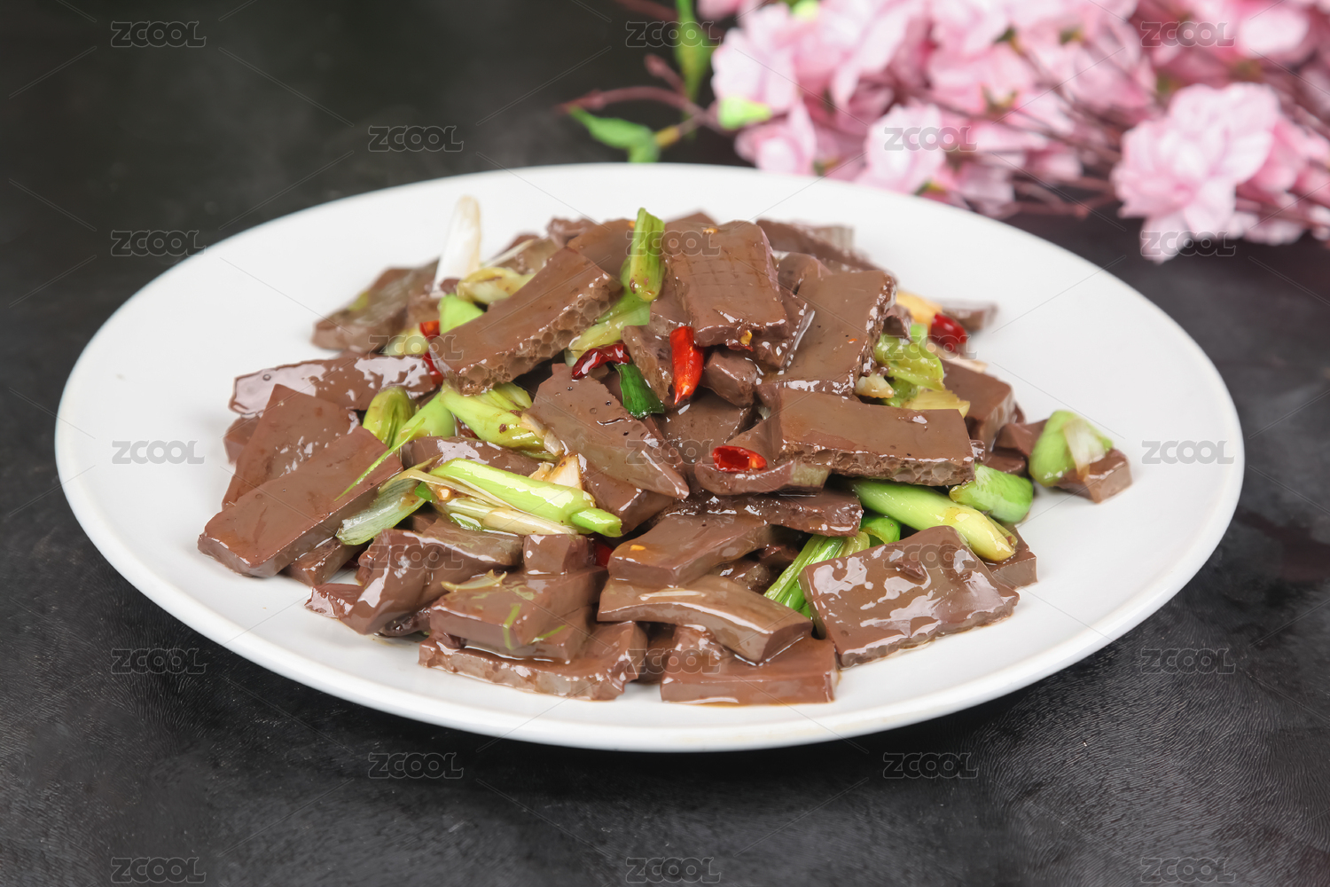用餐盤(pán)裝著的菜肴蒜苗炒血豆腐