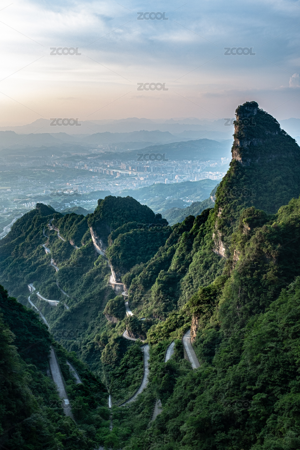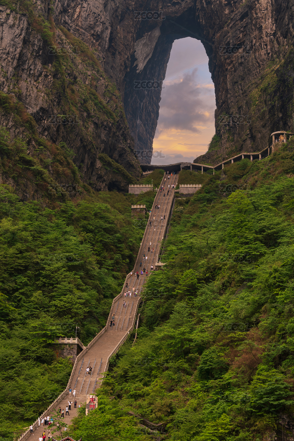 夕陽(yáng)下的湖南張家界天門(mén)山景點(diǎn)的天門(mén)洞和天梯風(fēng)光