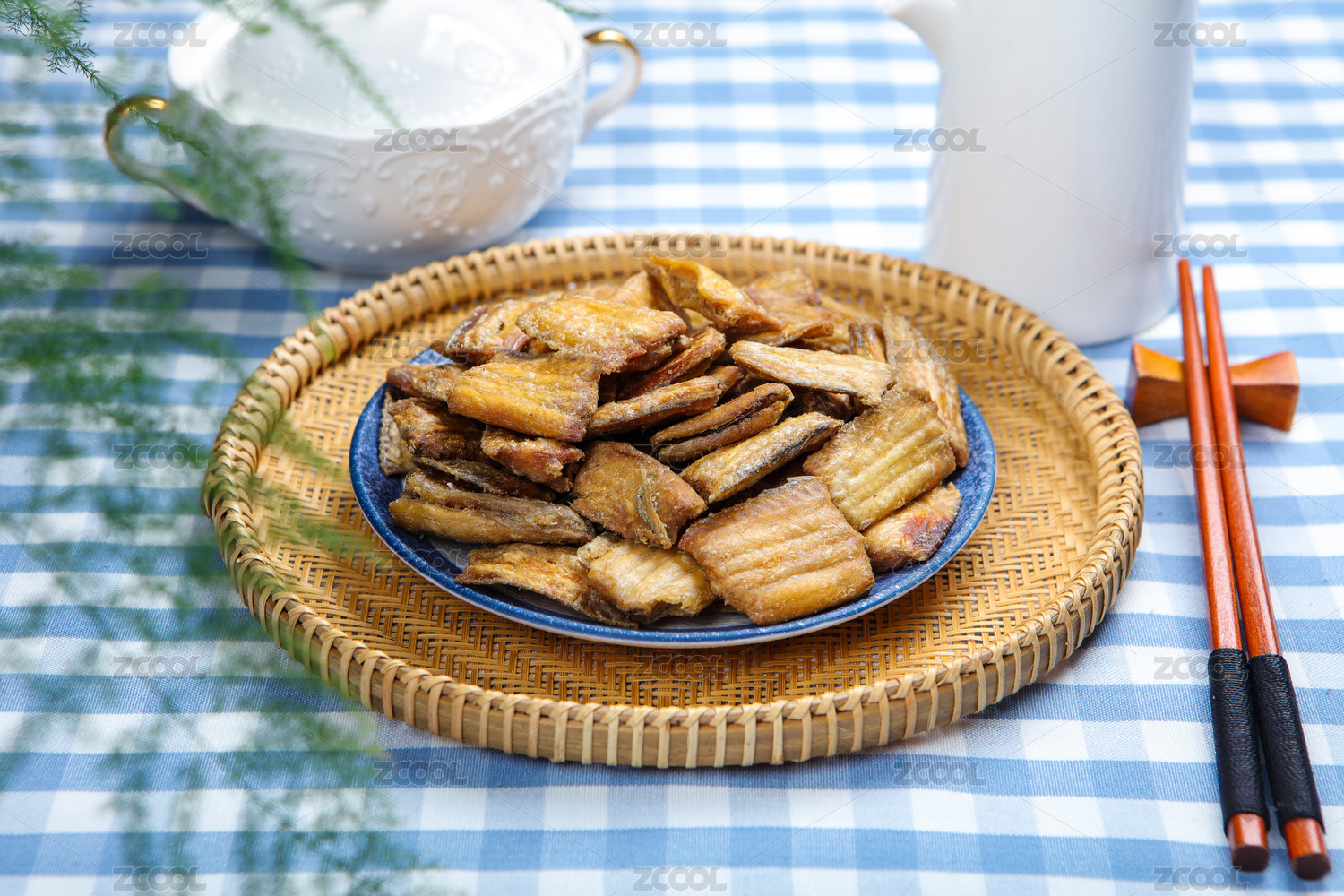 木板上放著一盤香酥帶魚和筷子上夾著帶魚