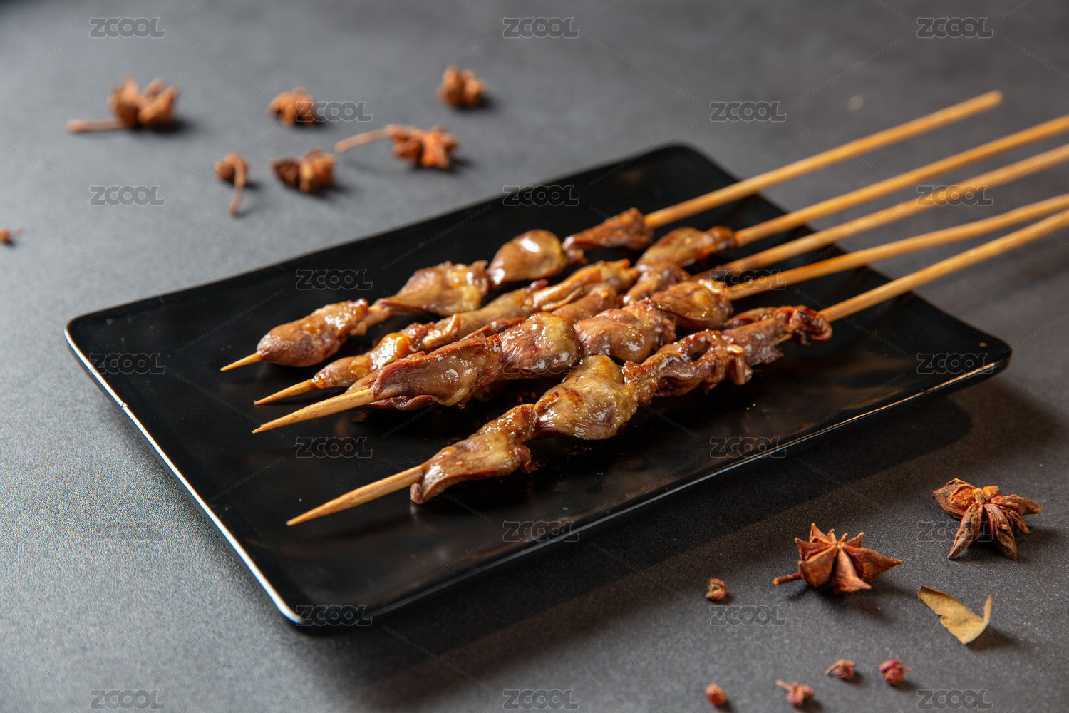 室內(nèi)黑色桌子上的一盤燒烤雞心