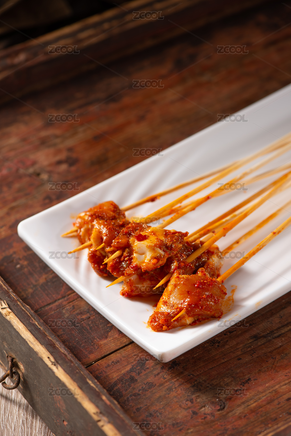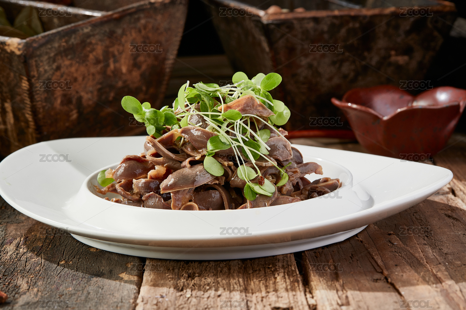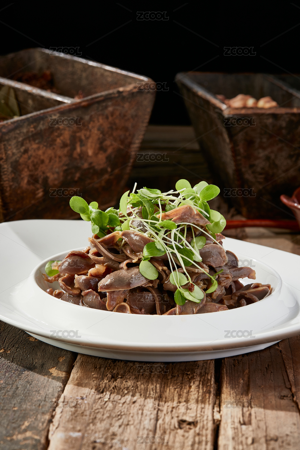 木桌上白盤里的重慶火鍋菜品雞胗郡花
