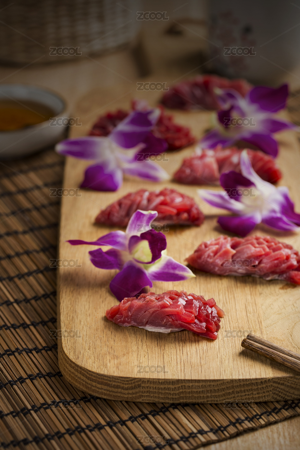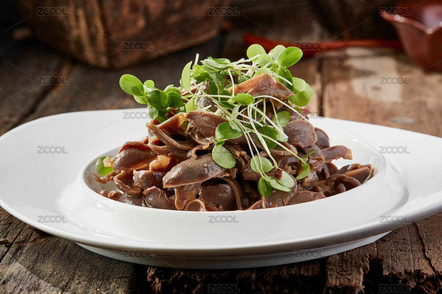 木桌上白盤里的重慶火鍋菜品郡花雞胗鴨郡