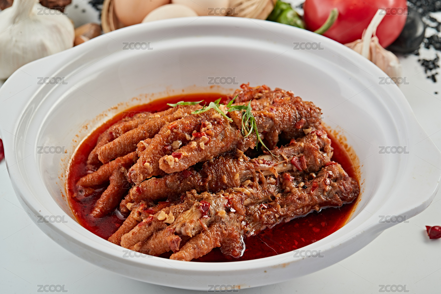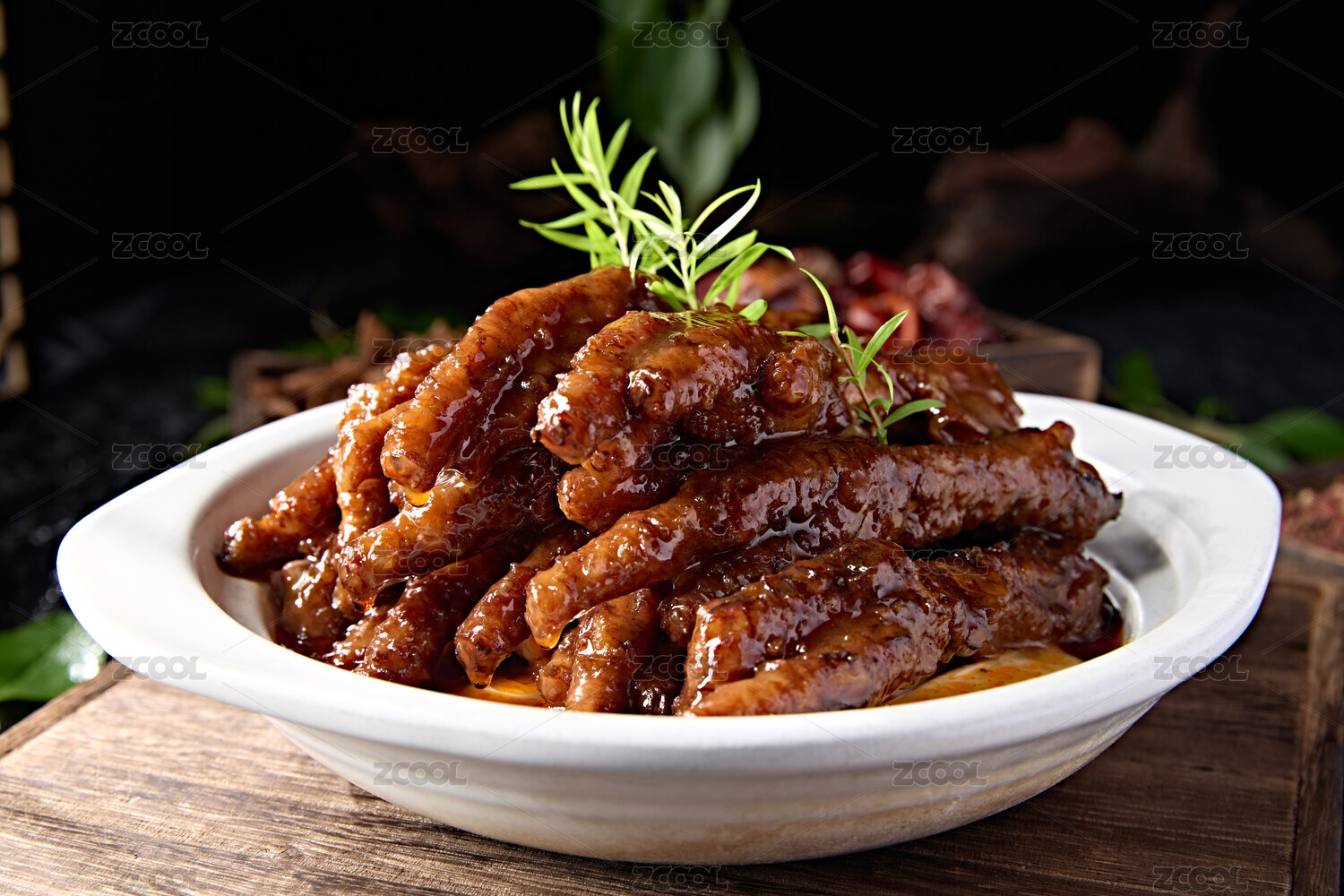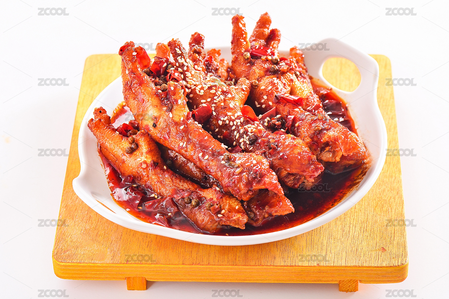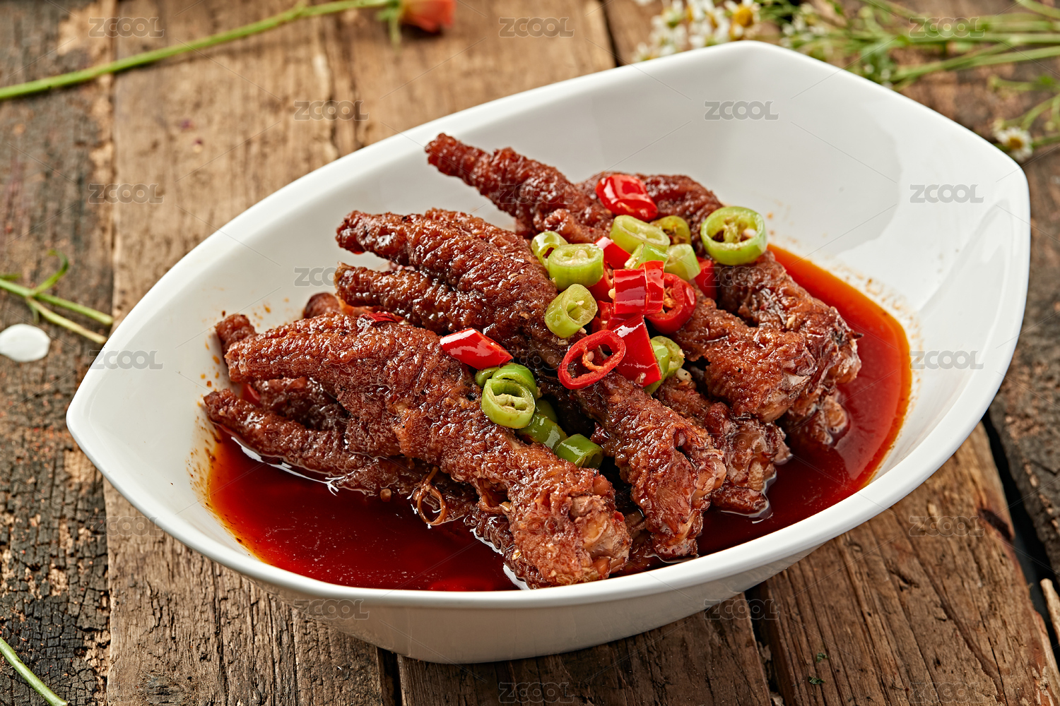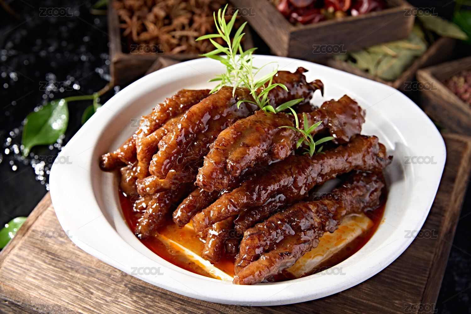 一盤紅色紅燒舉爪子放在木質(zhì)托盤上