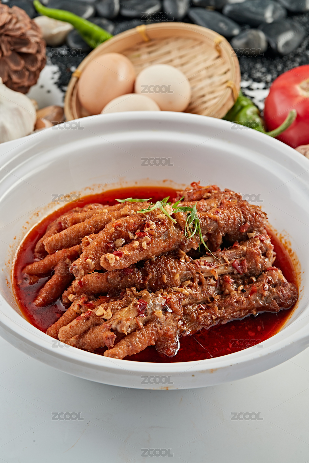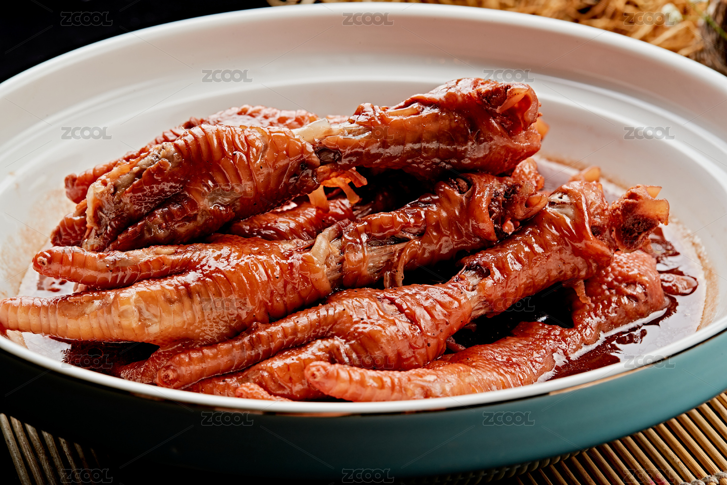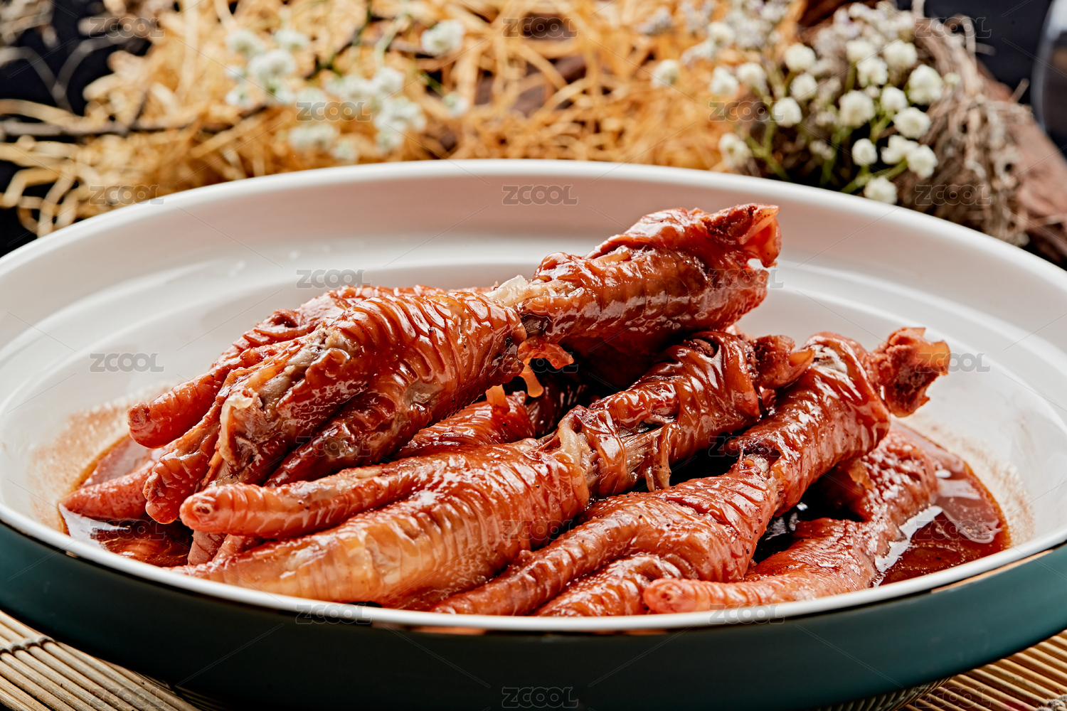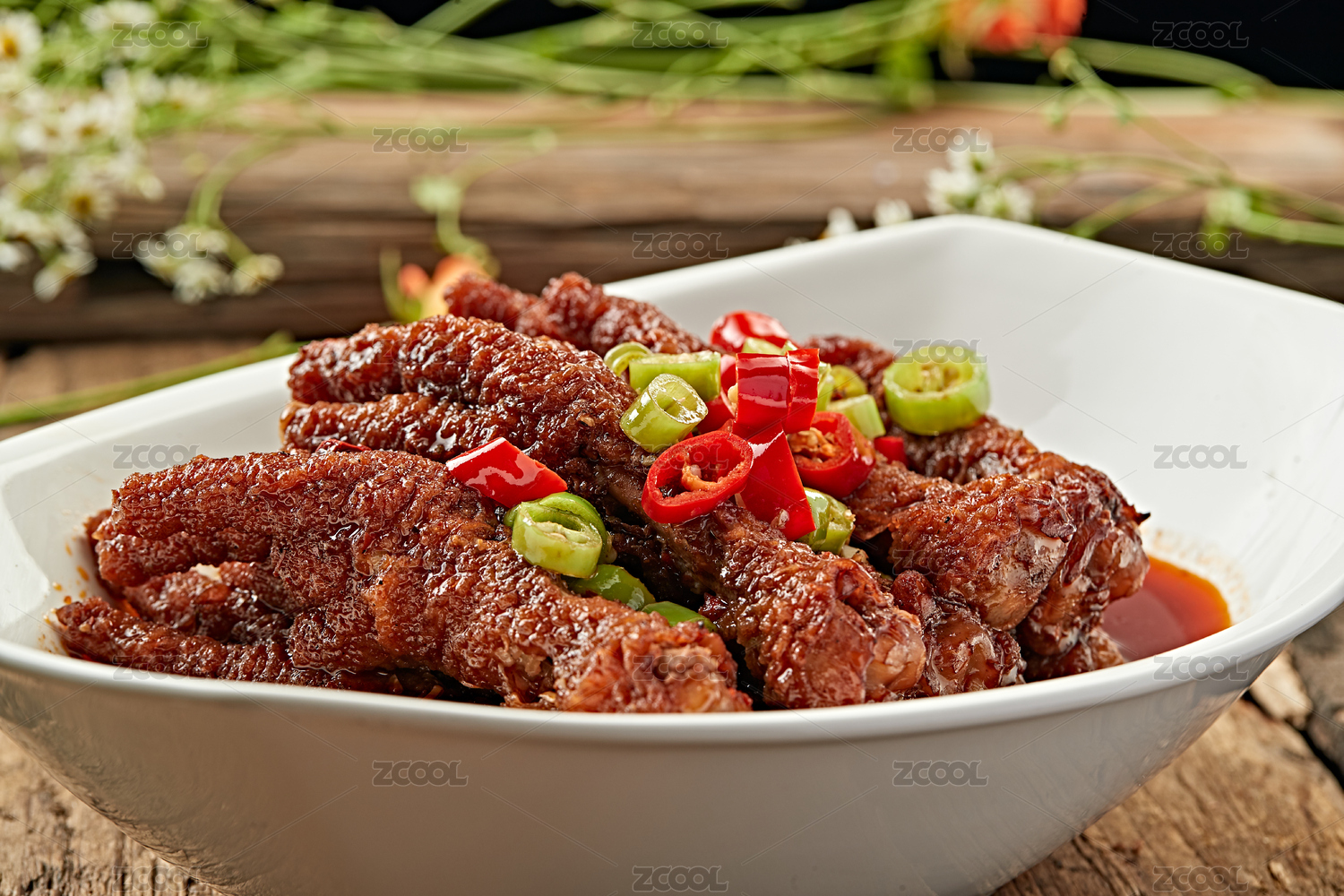 一盤紅色紅燒舉爪子放在木質(zhì)托盤上
