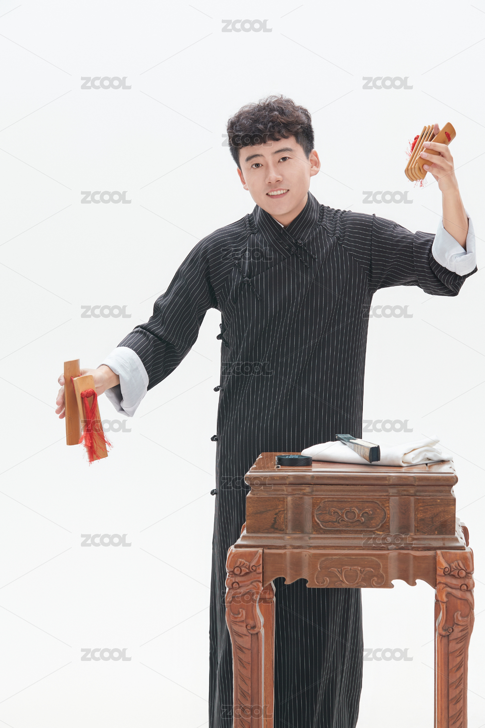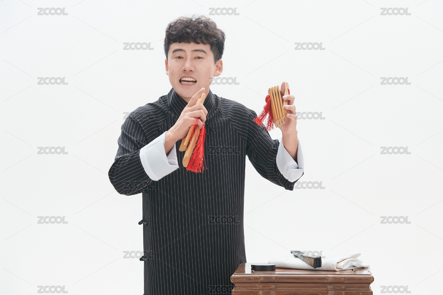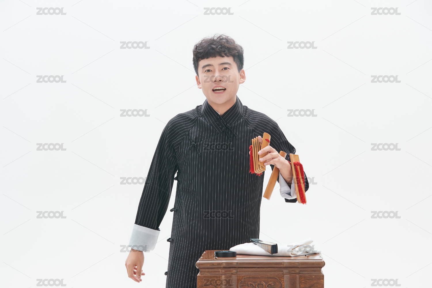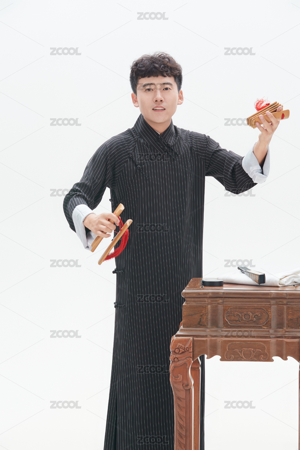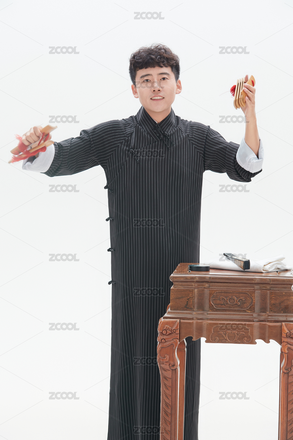 身穿大褂的曲藝演員正在演奏快板書特寫