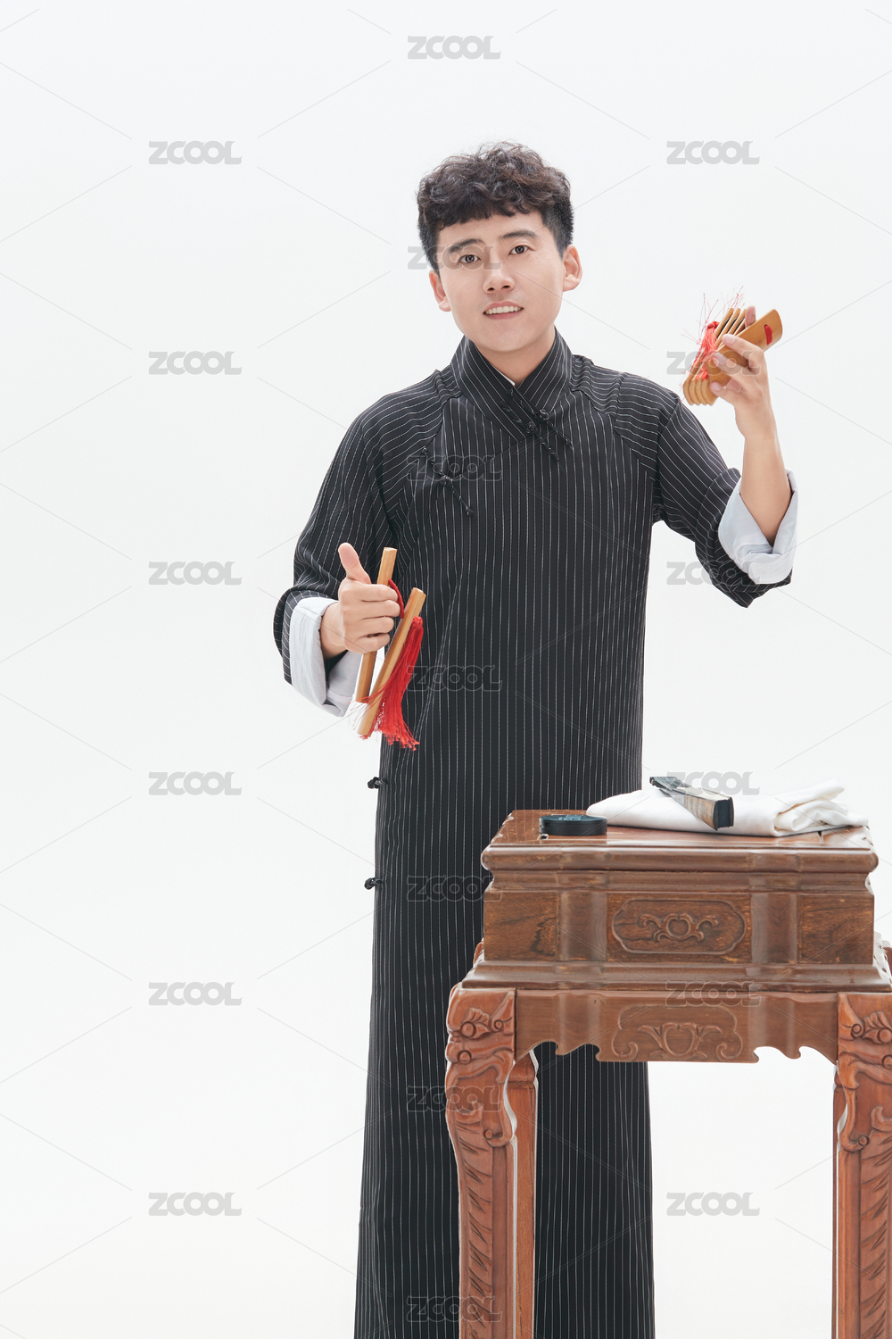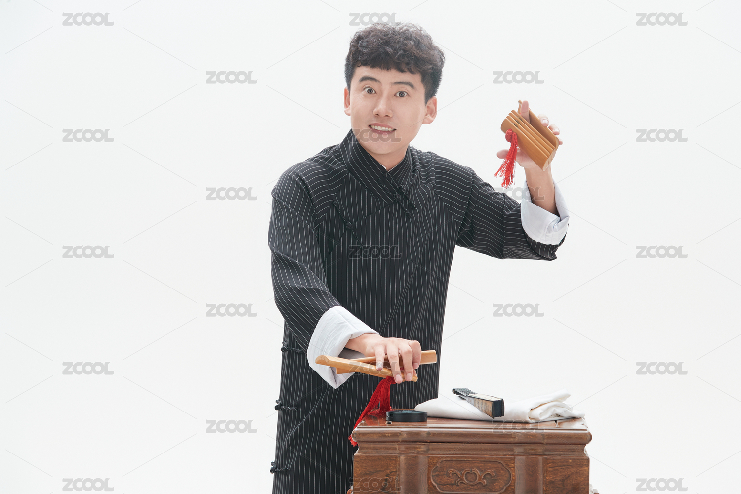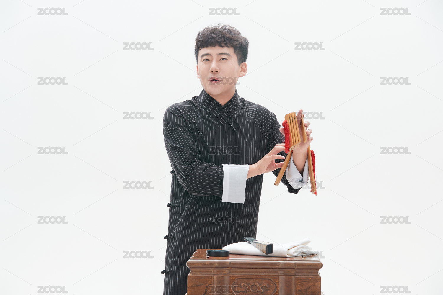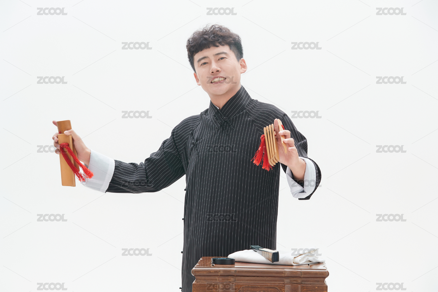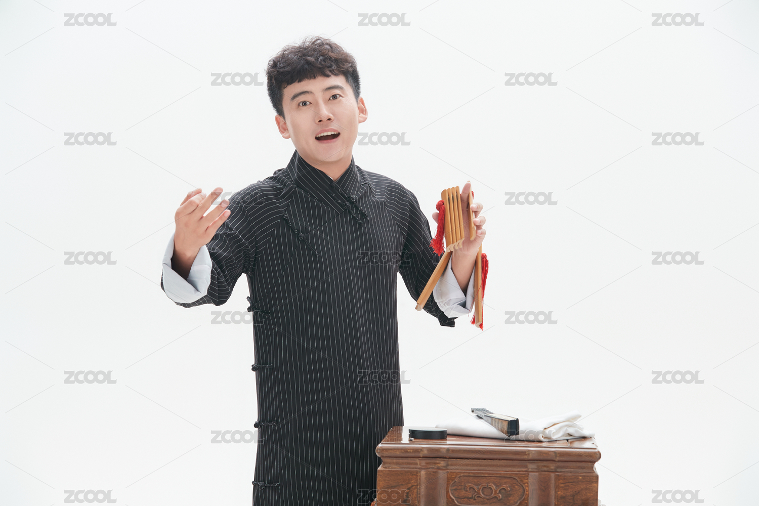 身穿大褂的曲藝演員正在演奏快板書特寫
