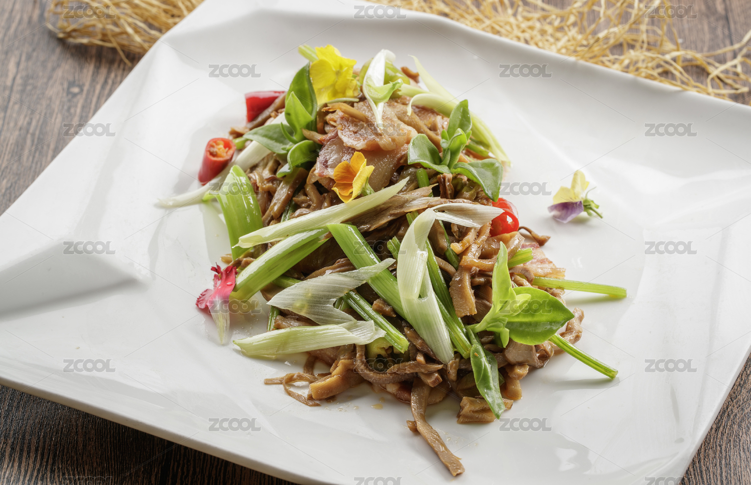 方形花瓷盤裝的大蔥爆羊肉擺放在樟木砧板上