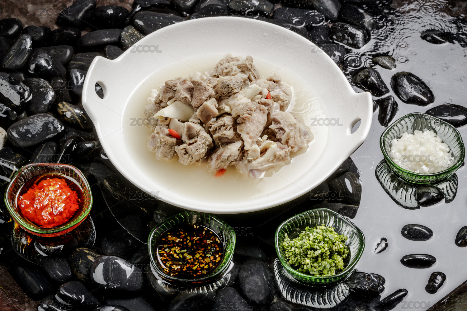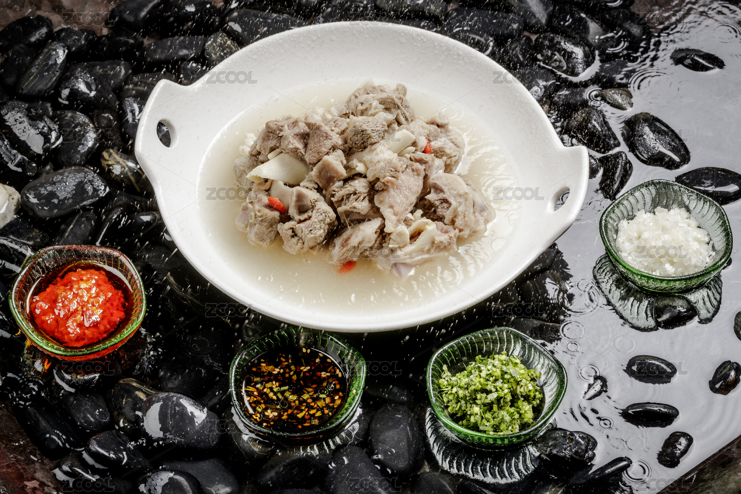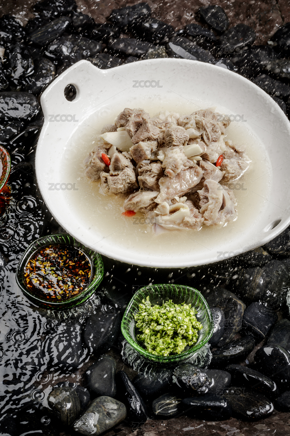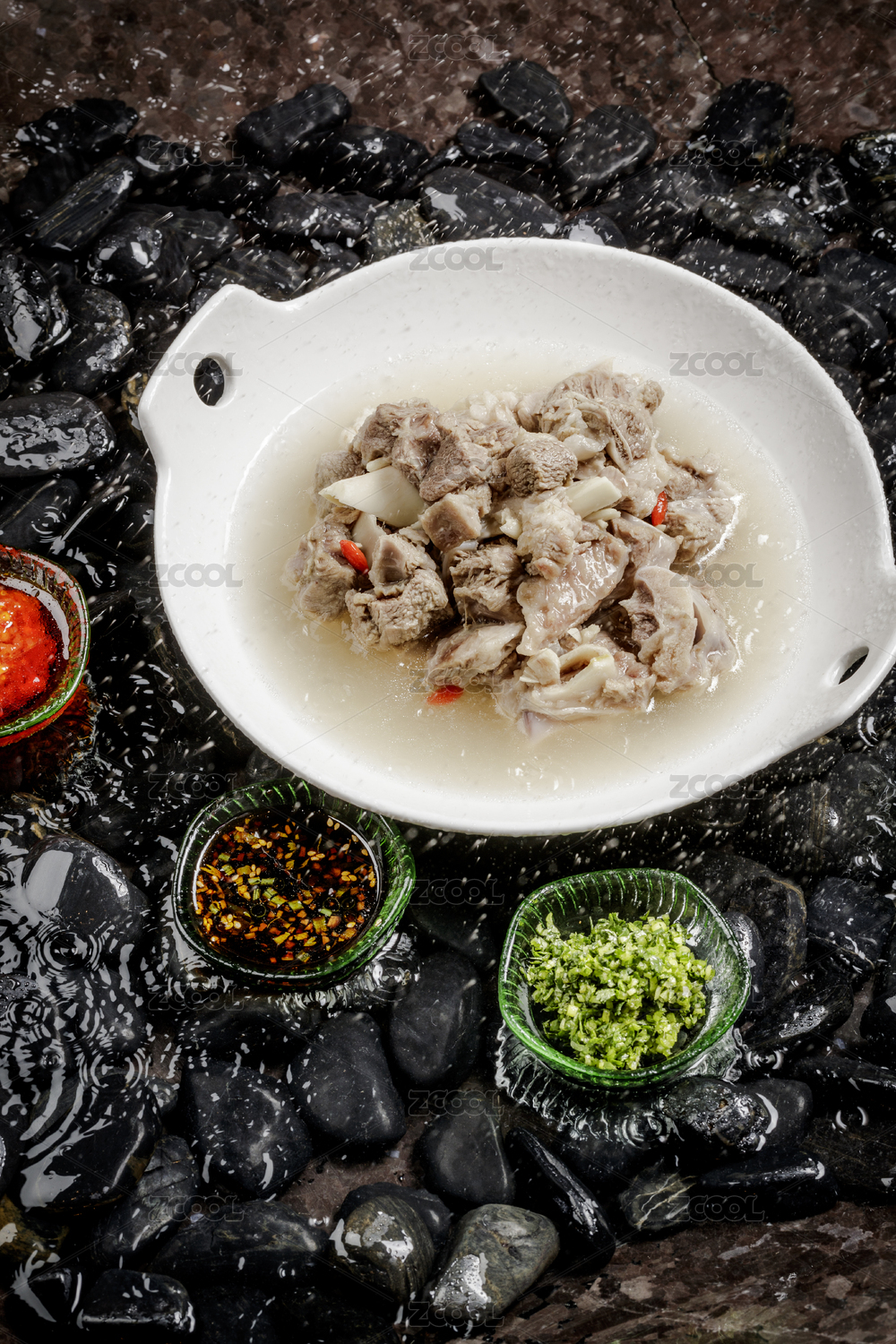 香噴噴的清水羊肉擺放在布滿鵝卵石的清水中