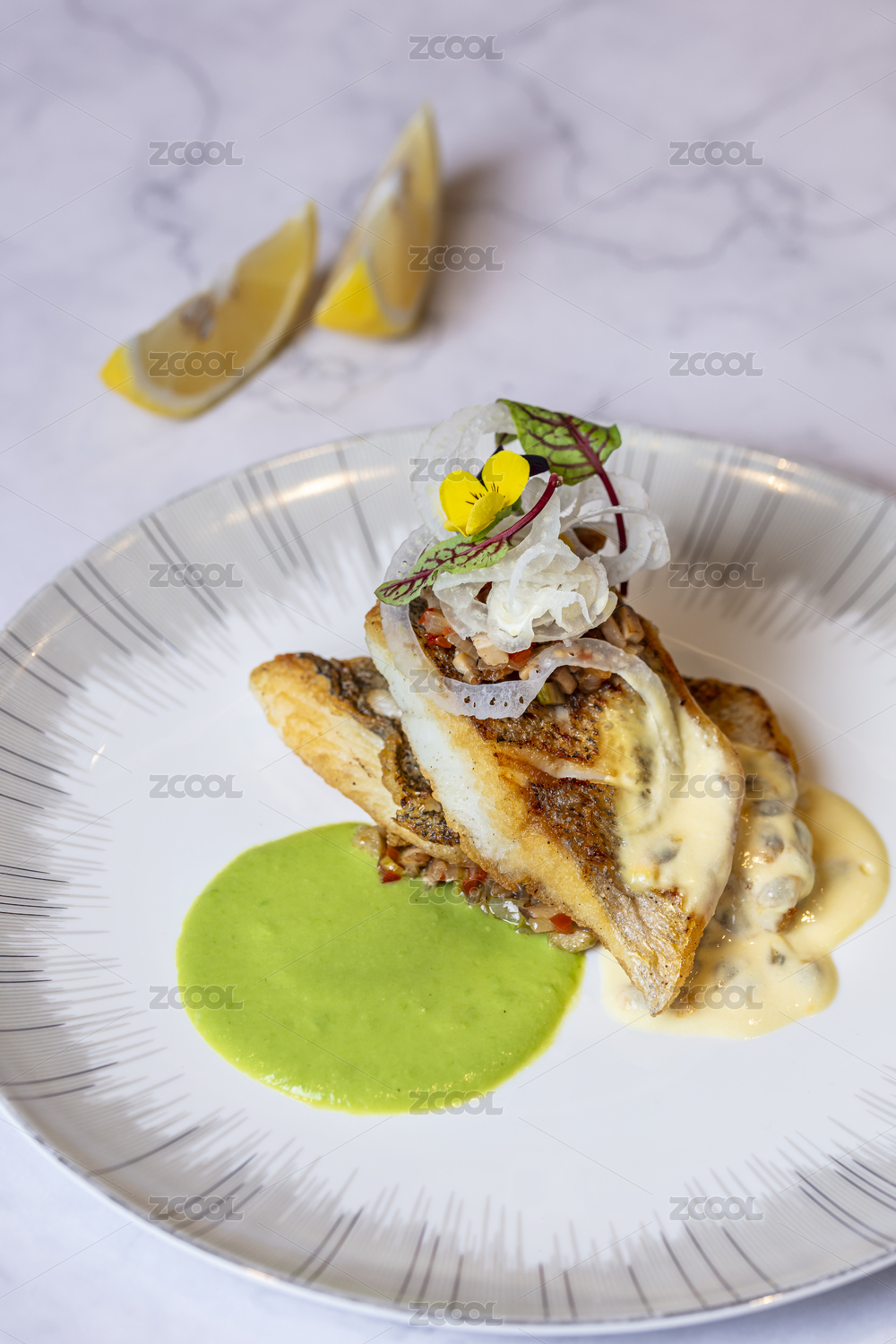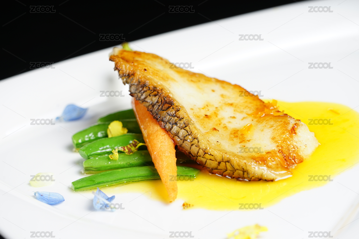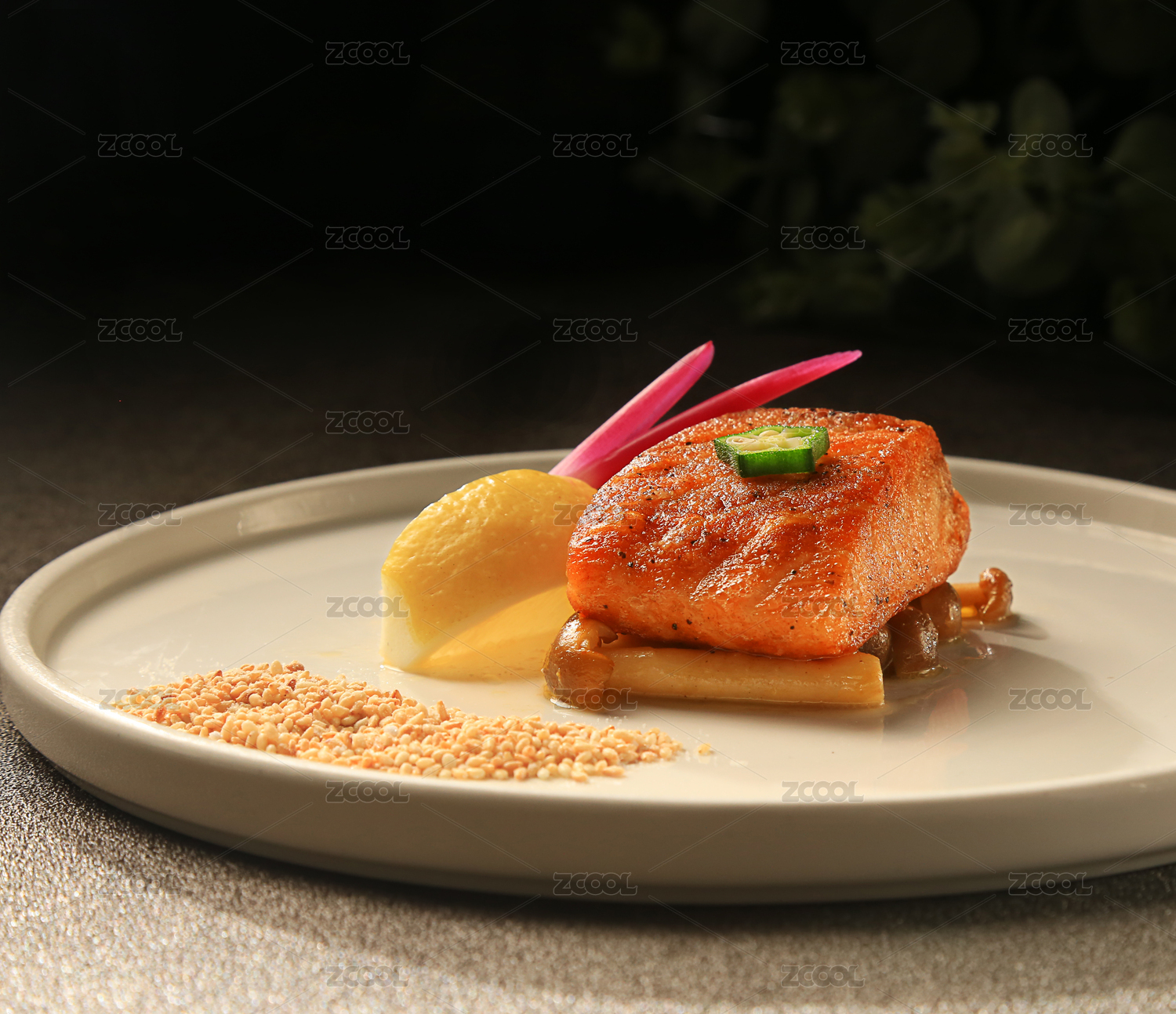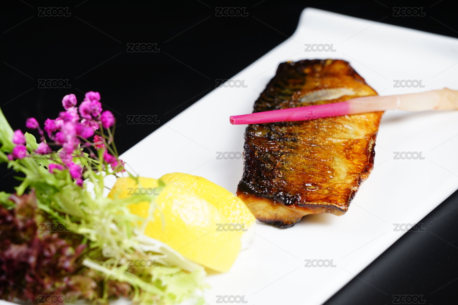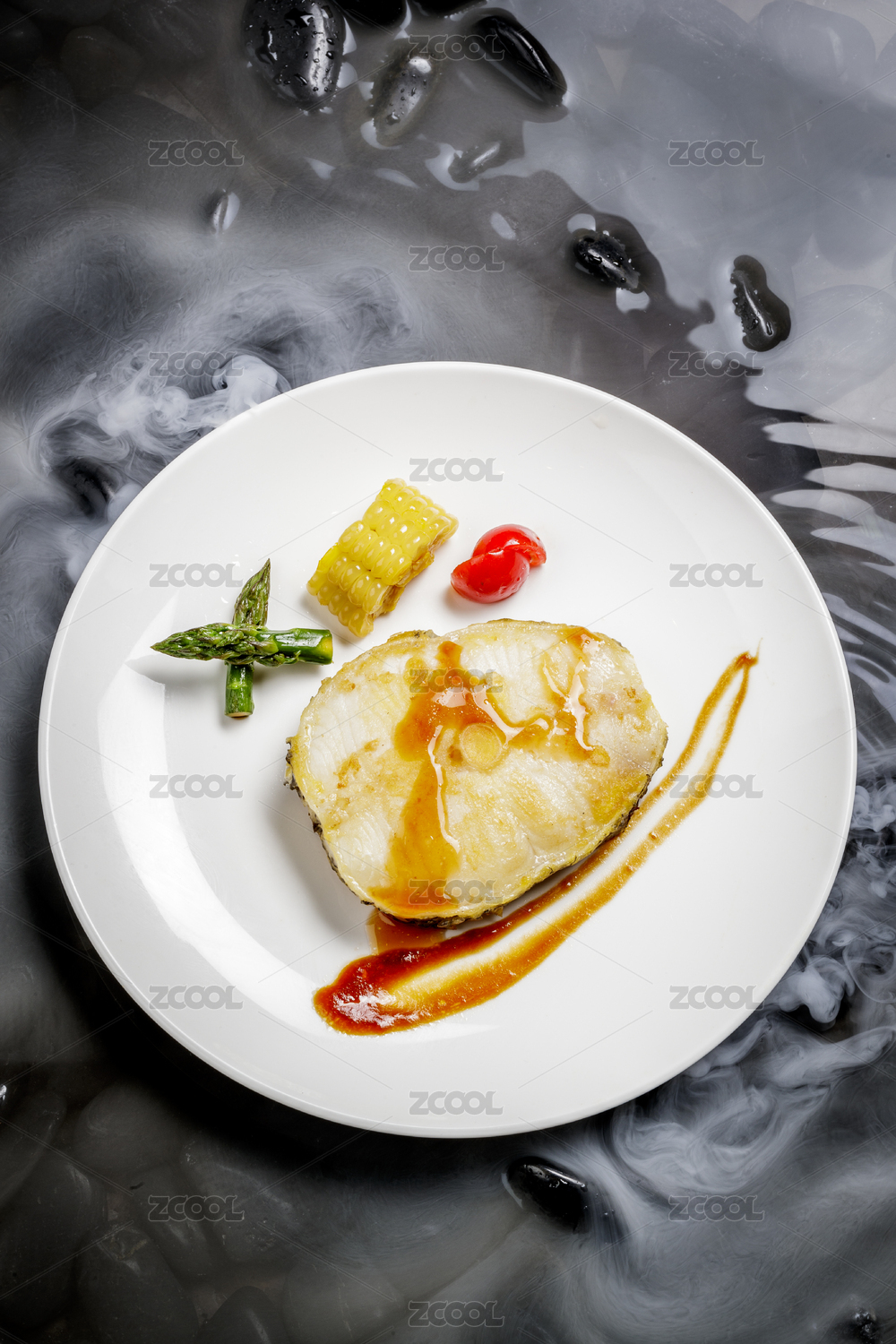 香煎銀鱈魚擺放在干冰繚繞的水中