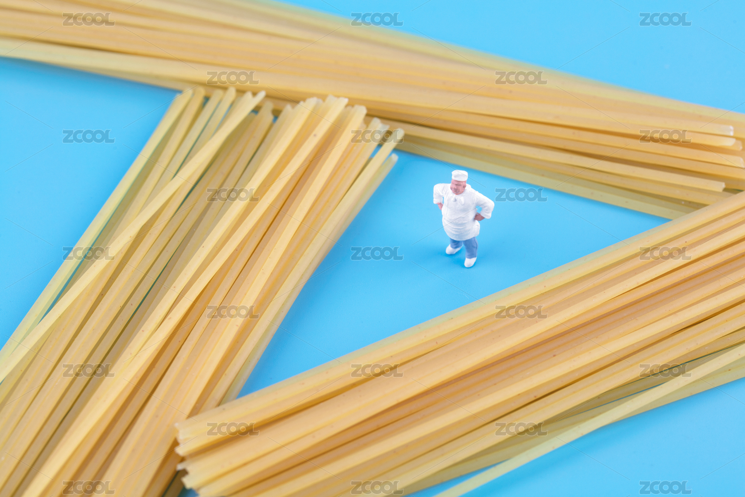 意大利面和一個(gè)廚師人偶在藍(lán)背景上