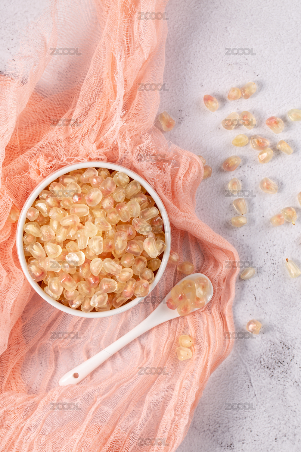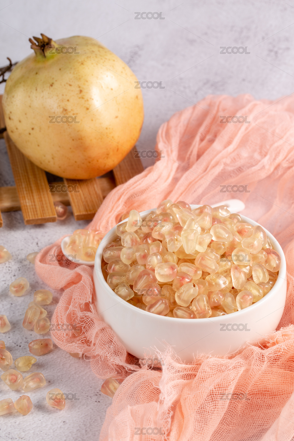 白色背景粉色布上滿滿一碗石榴果肉