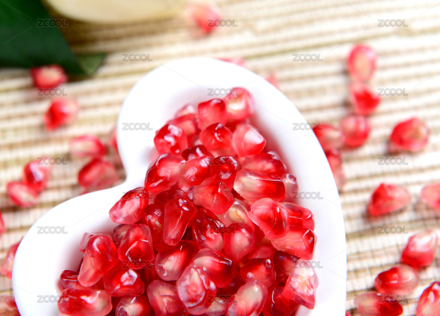淺色背景下心形盤中剝開的石榴果肉