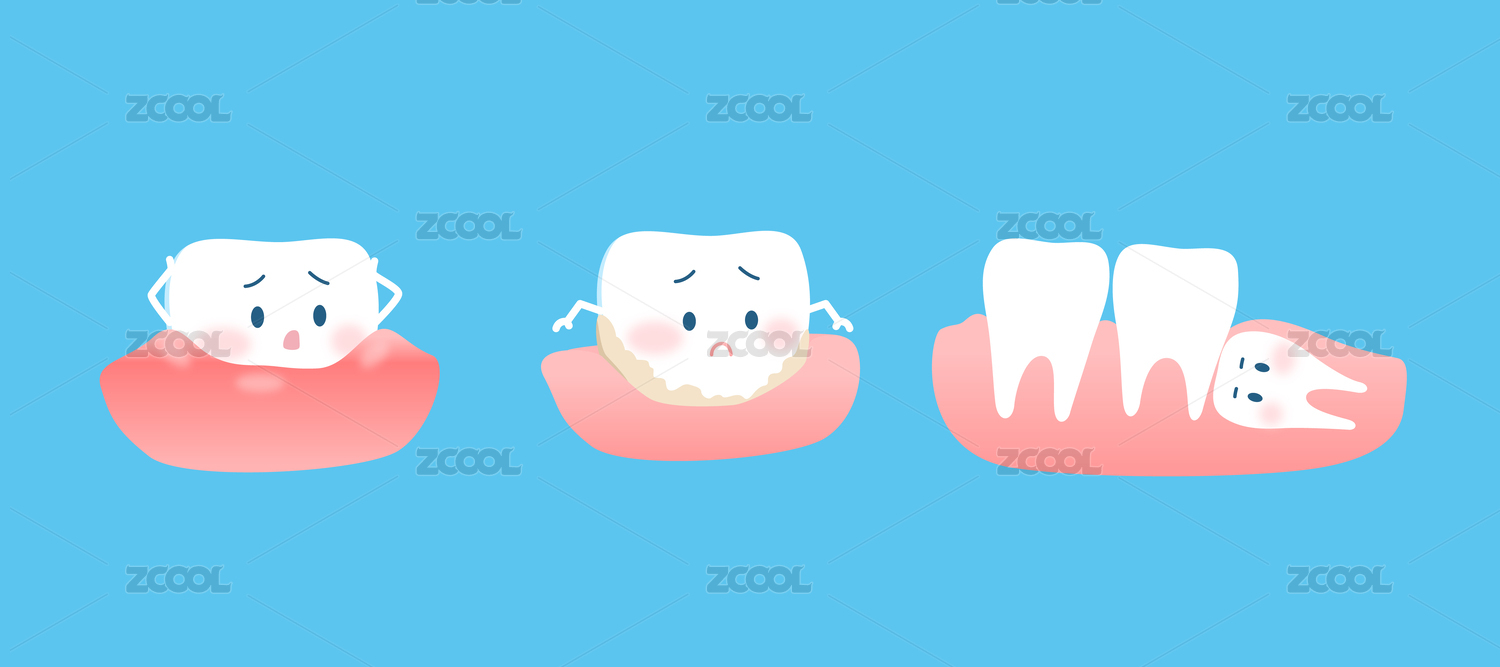 智齒牙齦紅腫等問(wèn)題的擬人矢量牙齒插畫(huà)