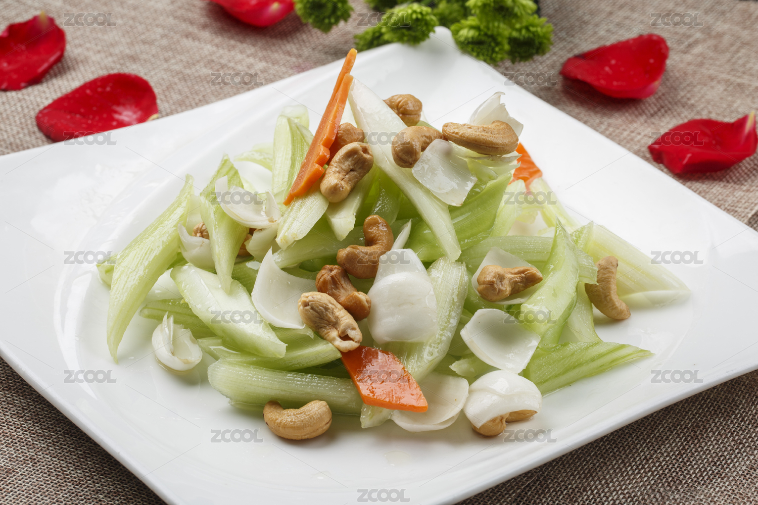 白色方瓷盤裝的腰果西芹炒百合
