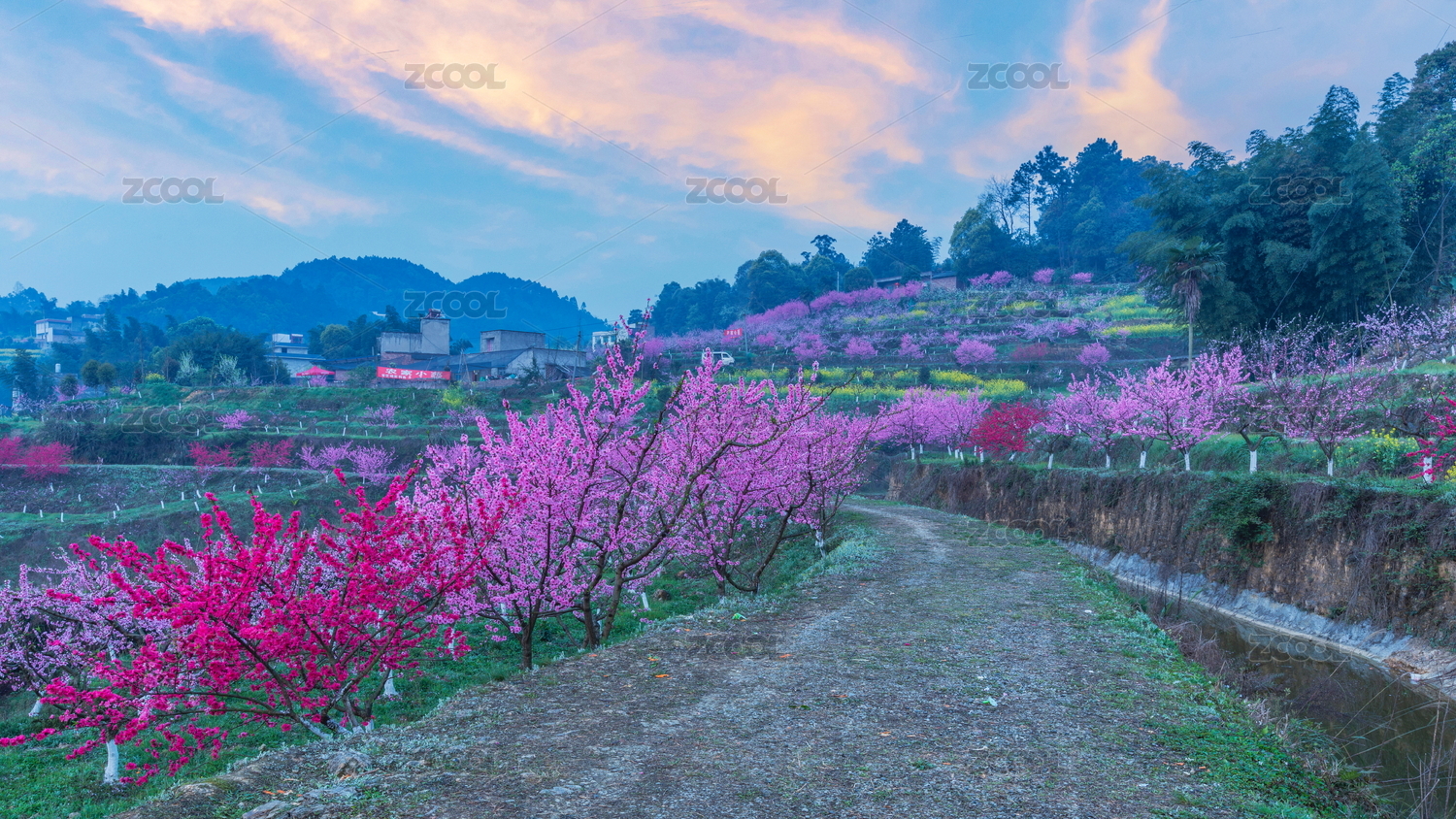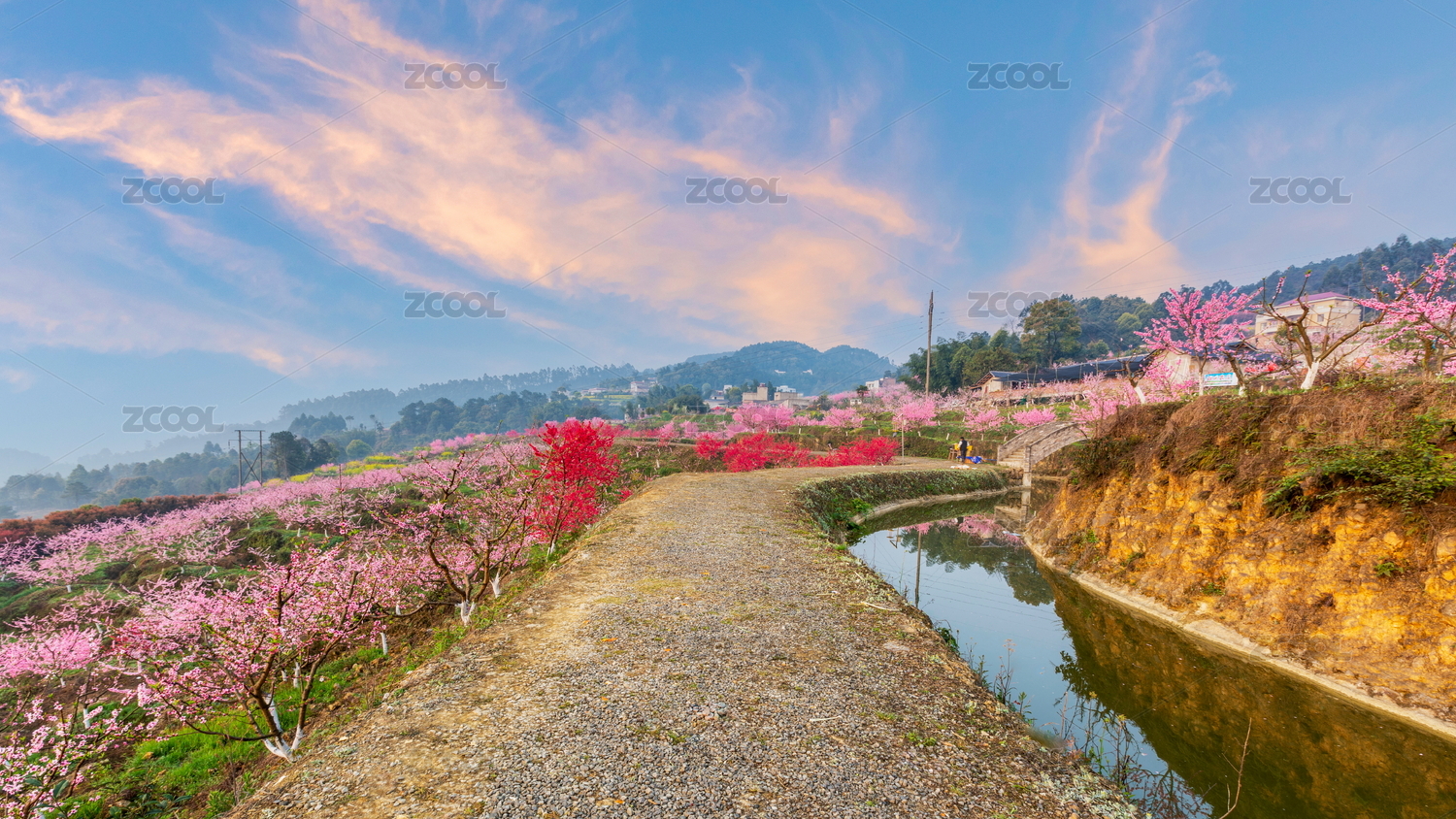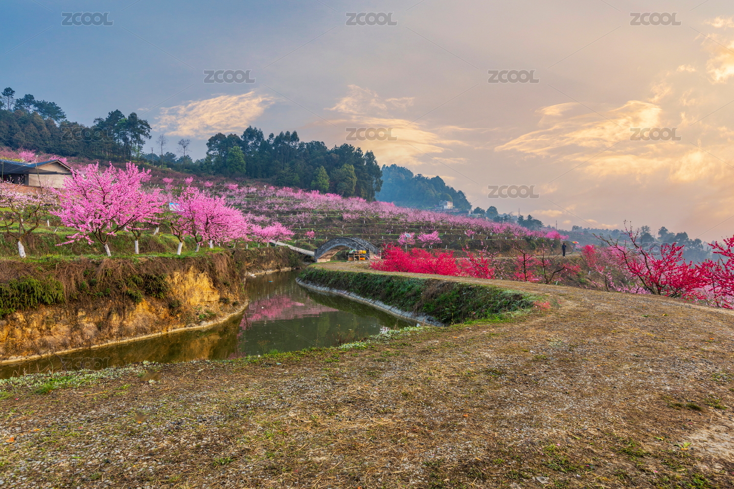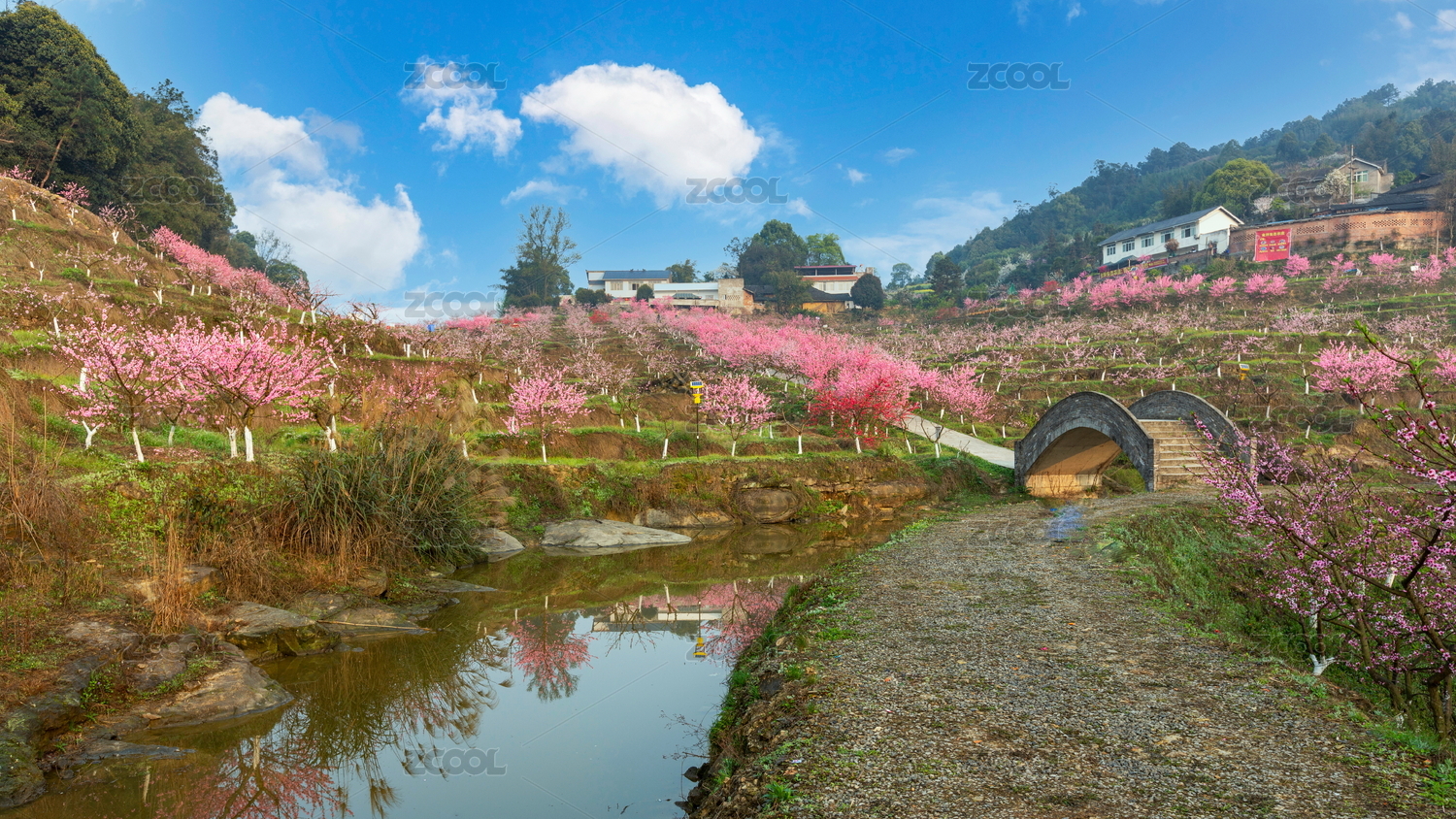 四川宜賓七星山小橋流水與盛開的桃花