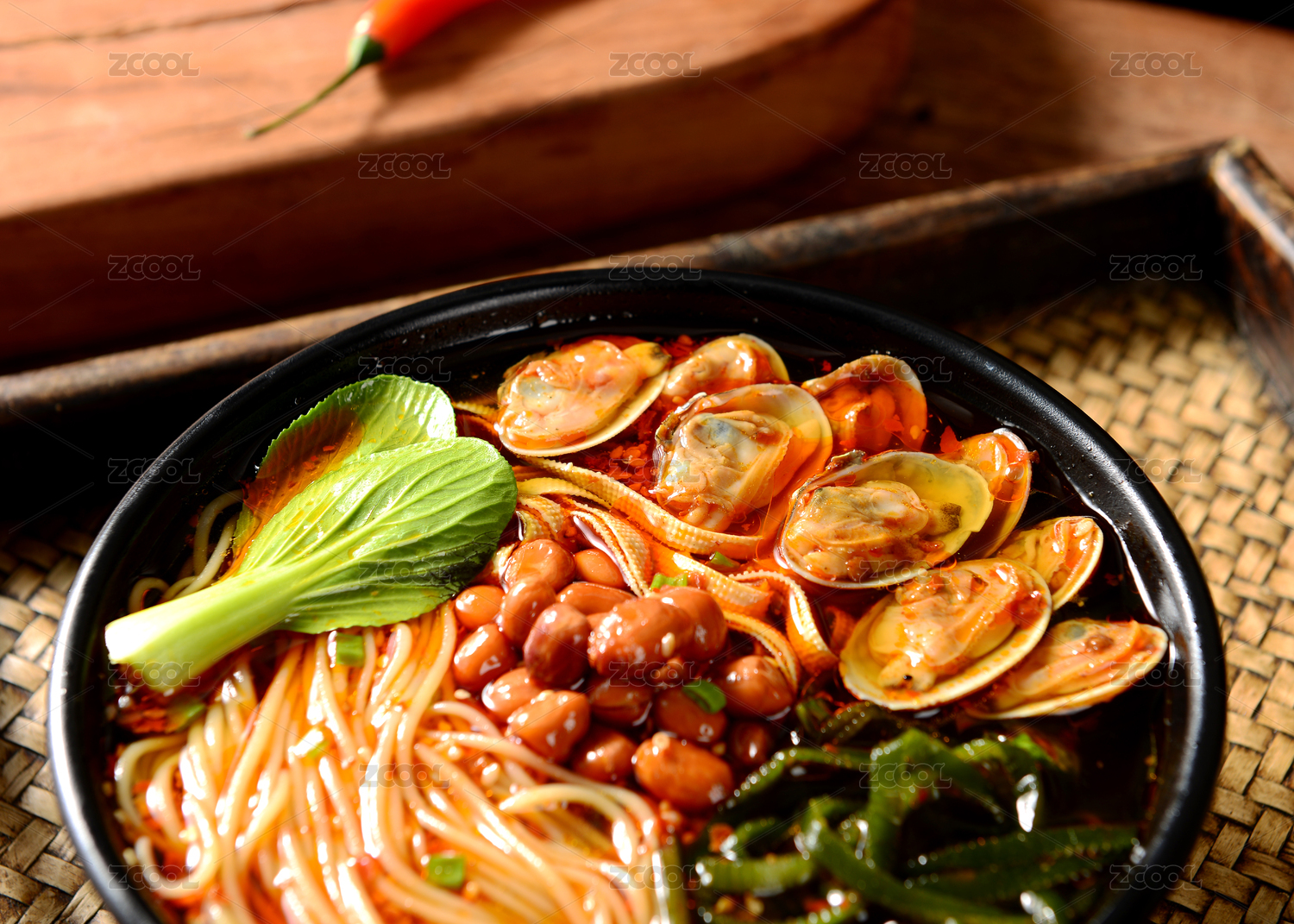 黑色碗里的花甲大蝦麻辣海鮮米線(xiàn)