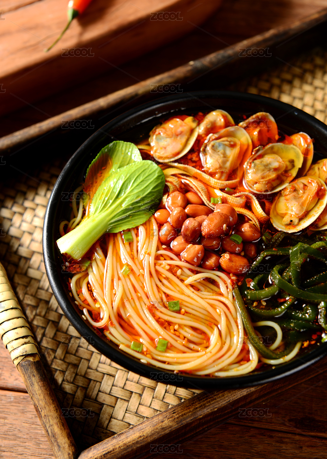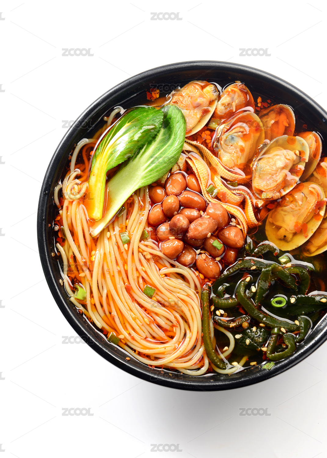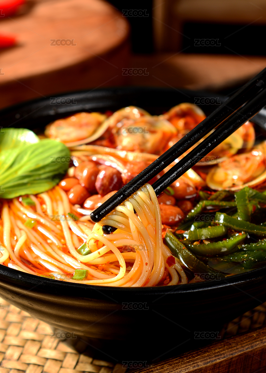 黑色碗里的麻辣鮮蝦海鮮米線(xiàn)