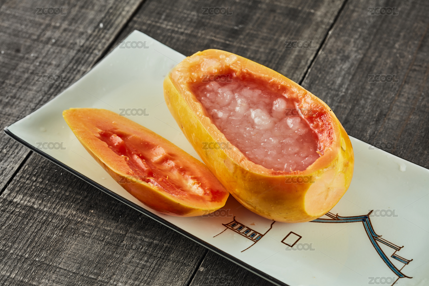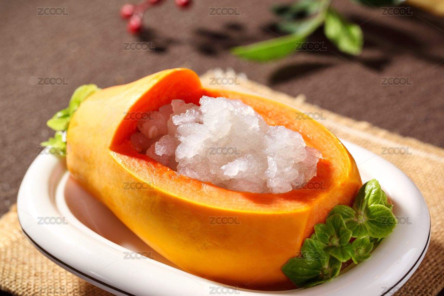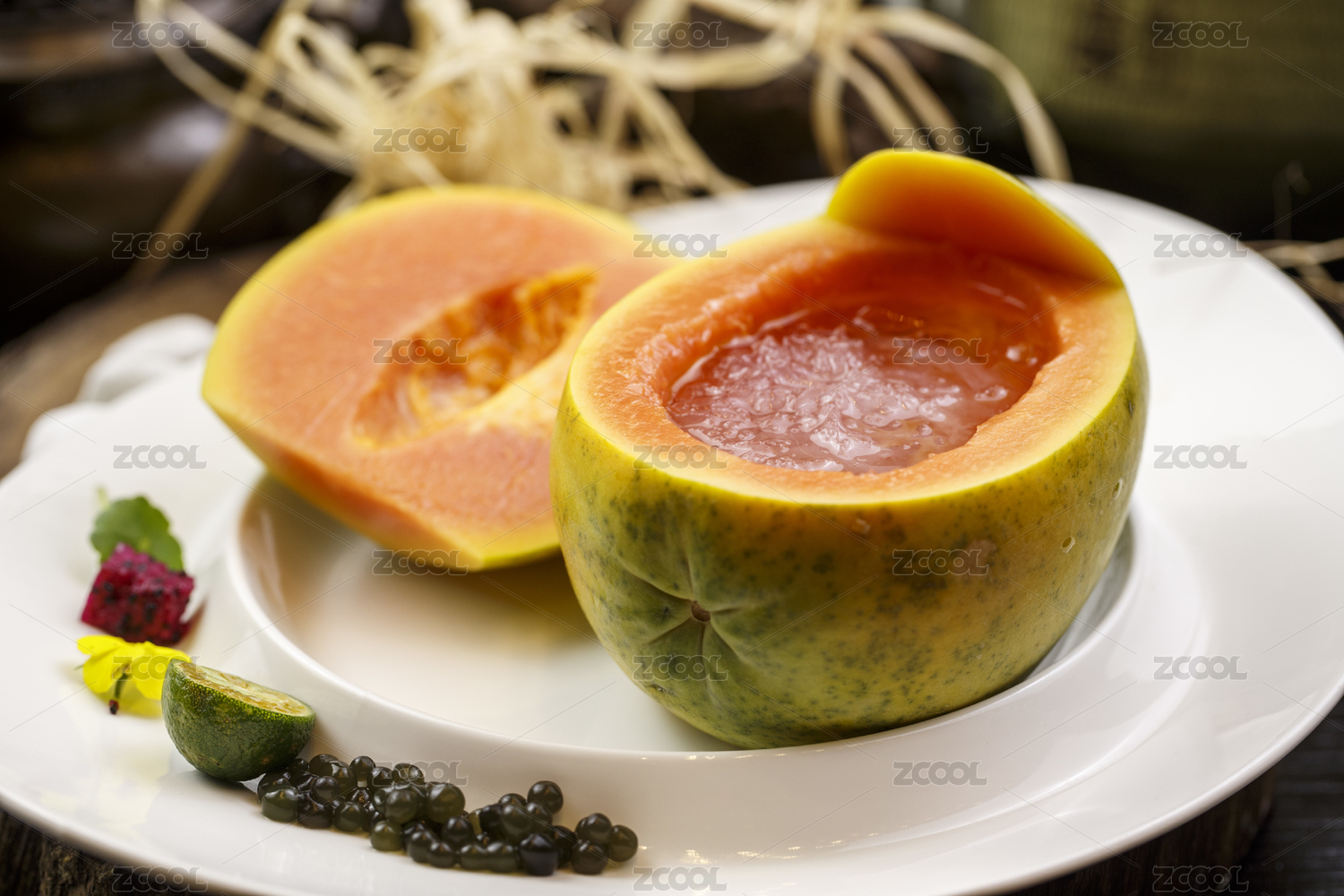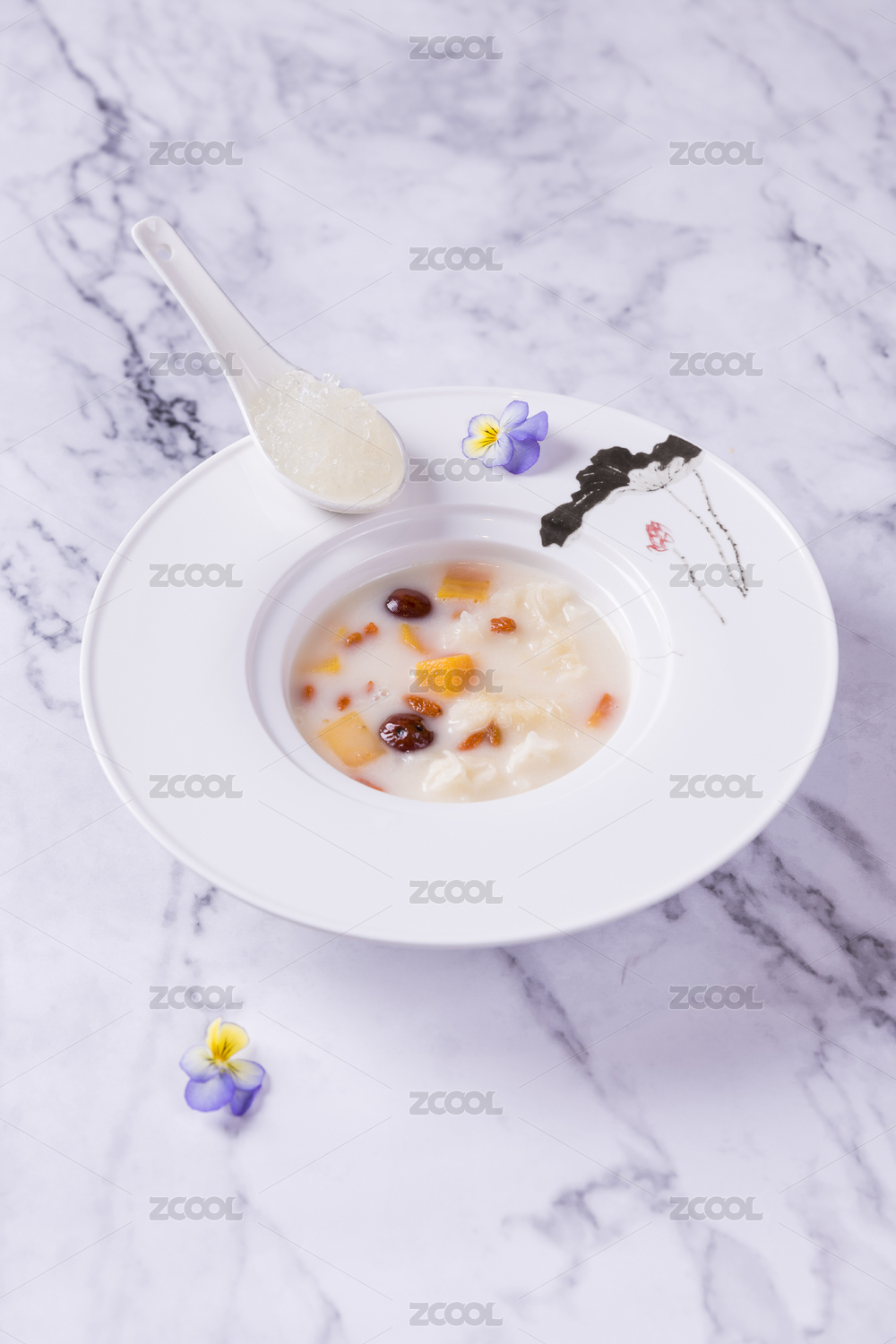 白色瓷盤(pán)裝的銀耳木瓜燉雪蛤擺放在砧板上