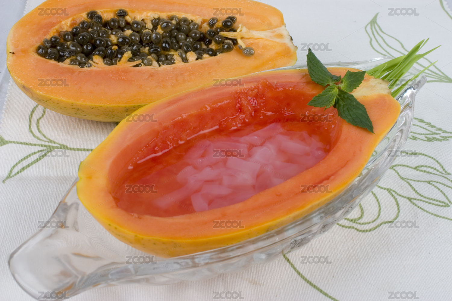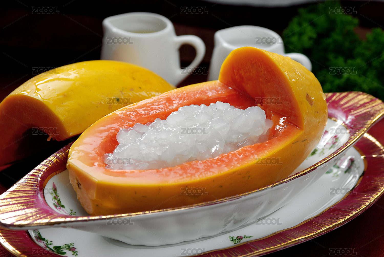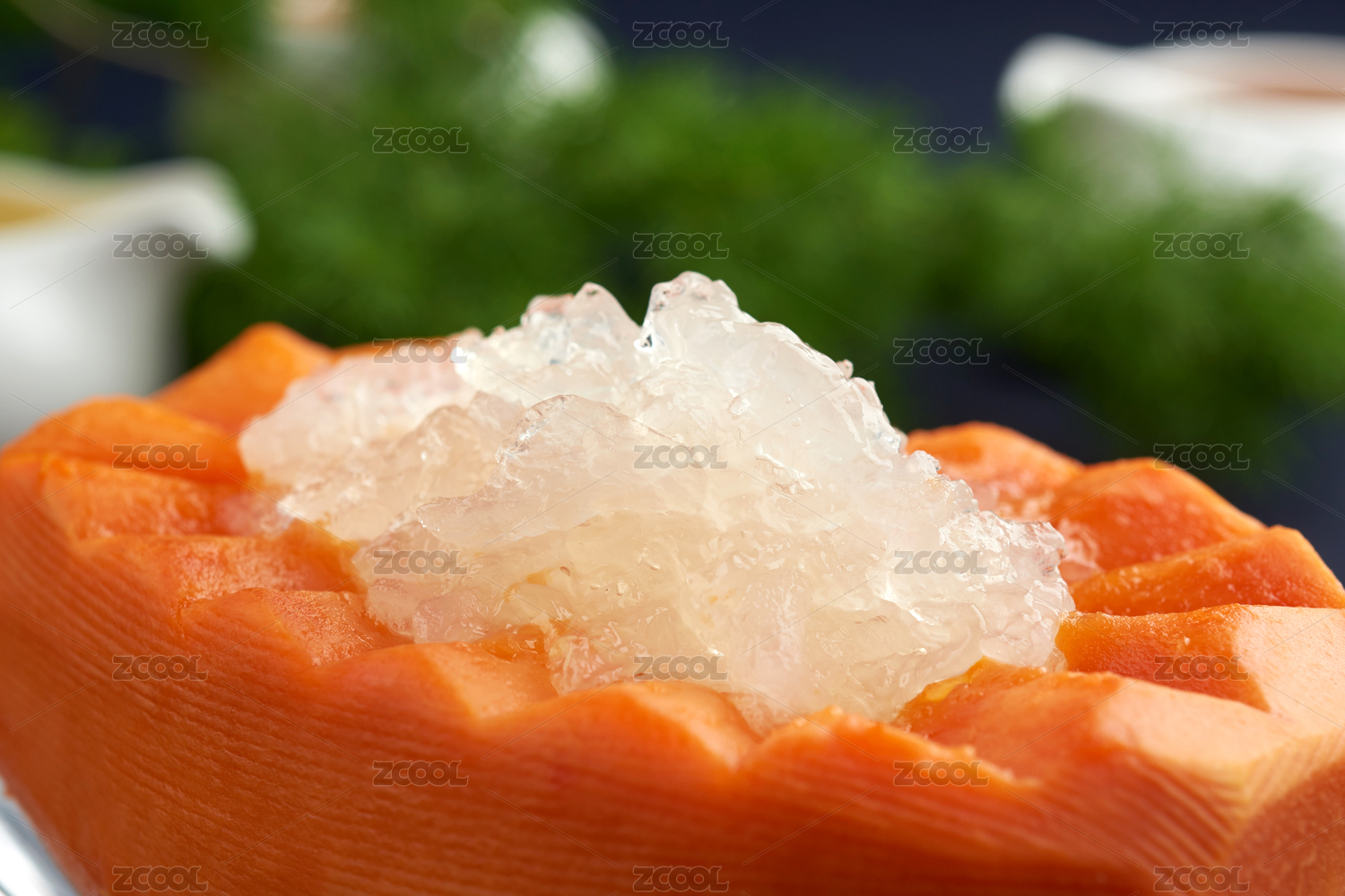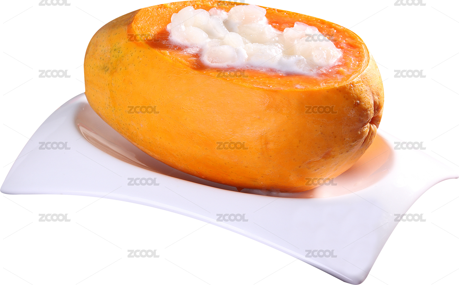白色瓷盤(pán)裝的銀耳木瓜燉雪蛤擺放在砧板上