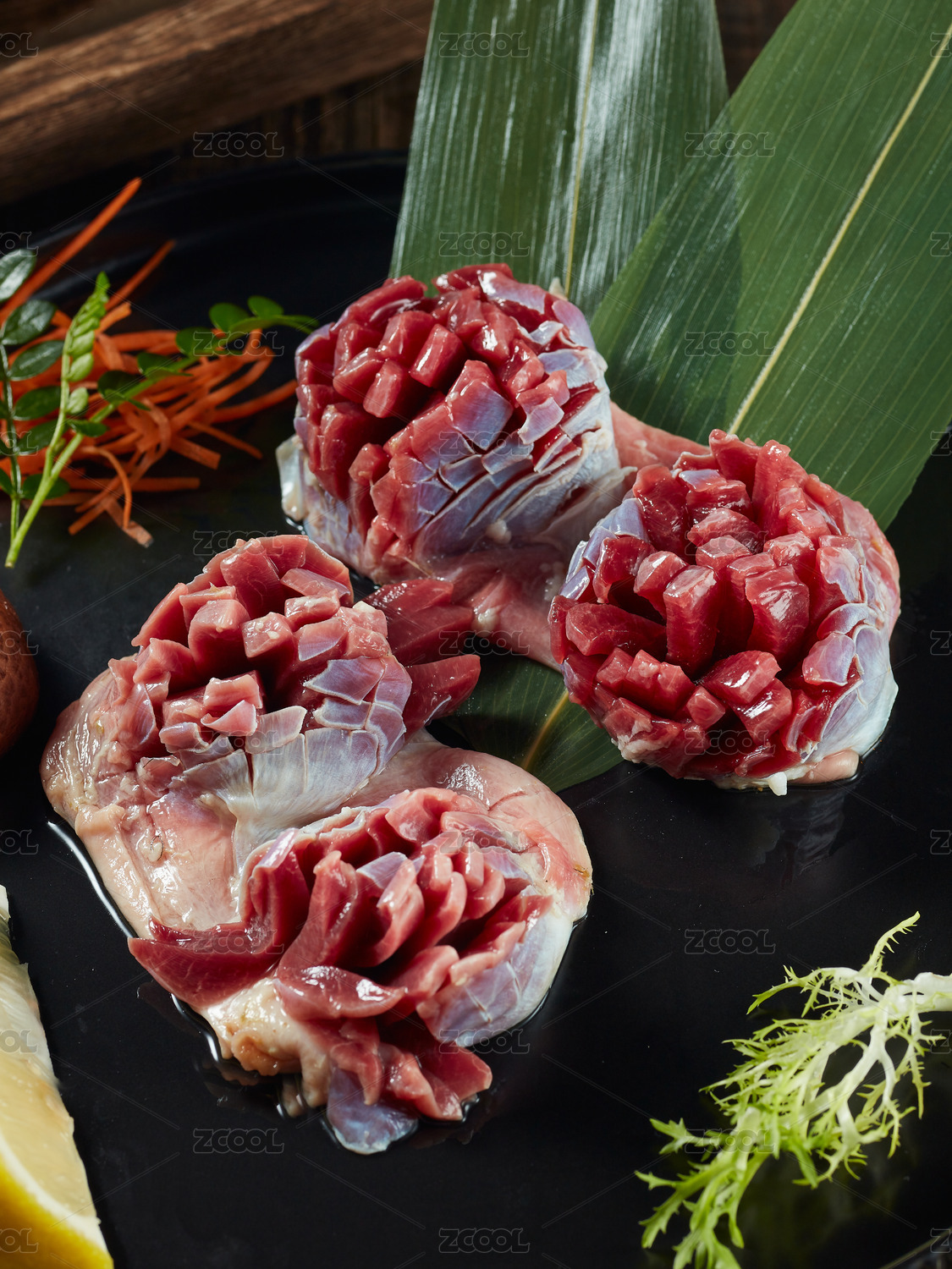 木桌上白盤里的重慶火鍋菜品雞胗郡花