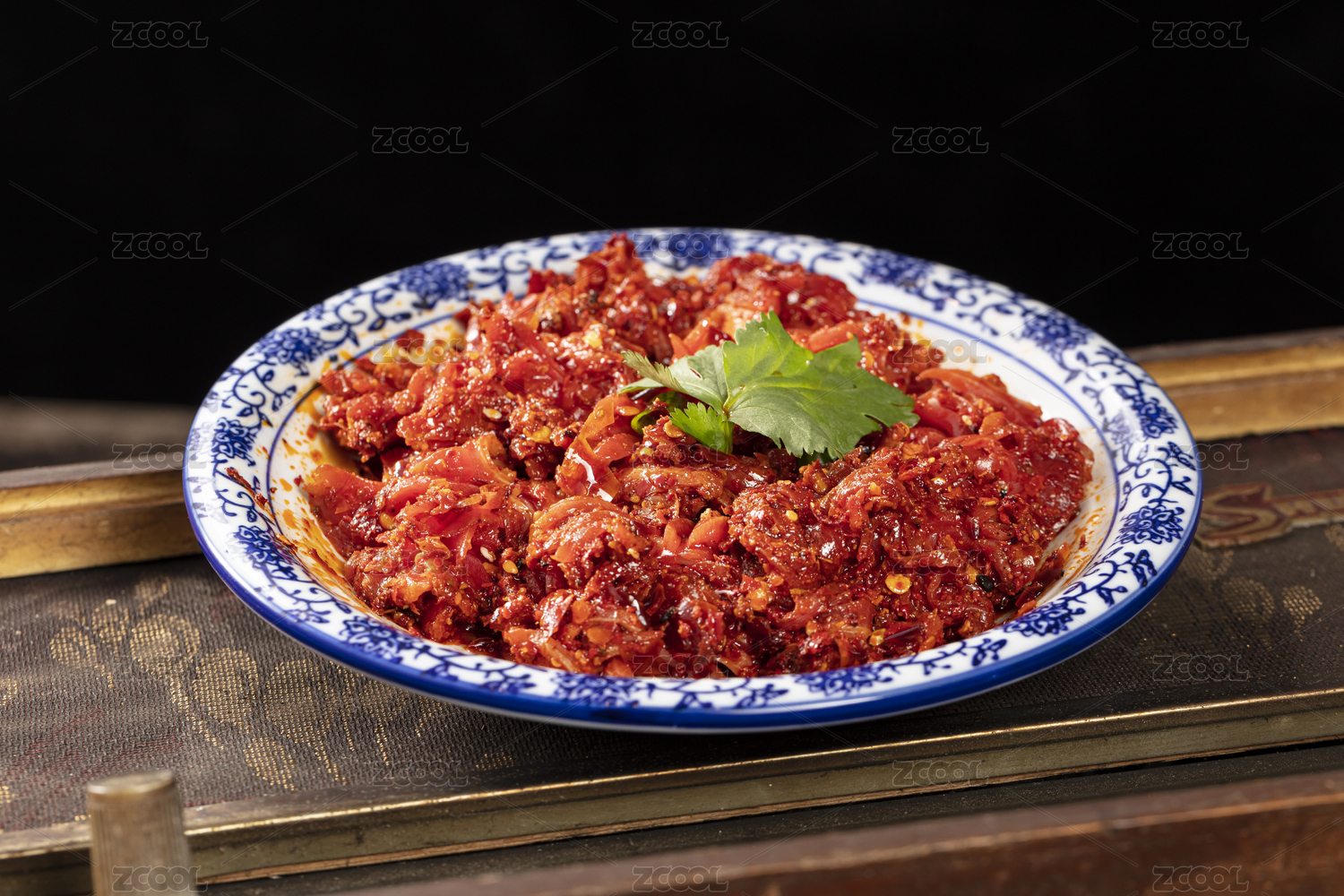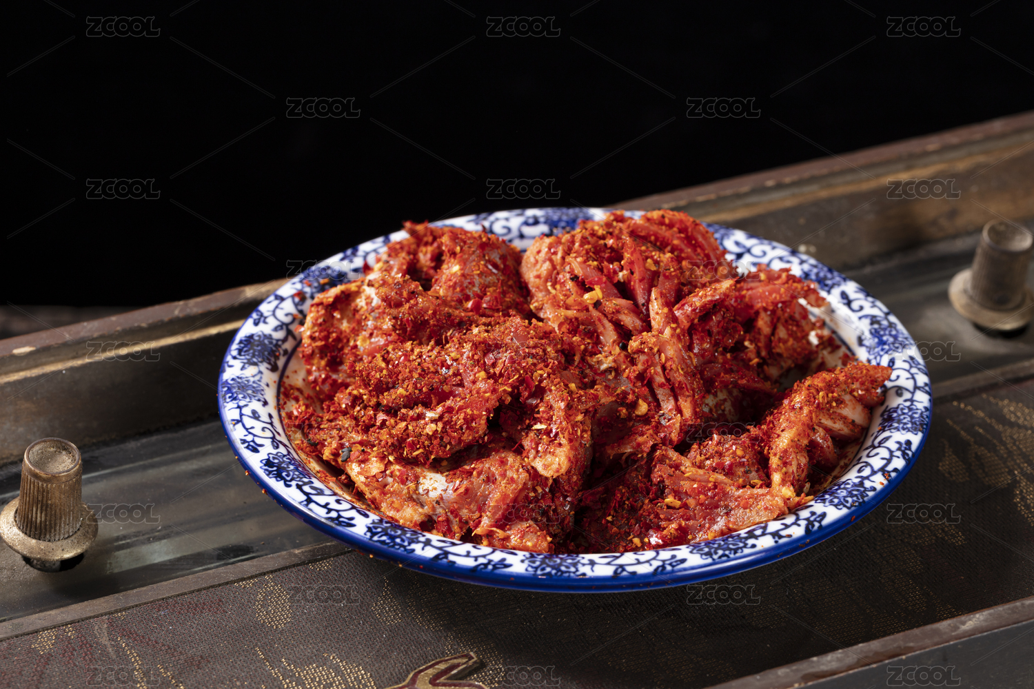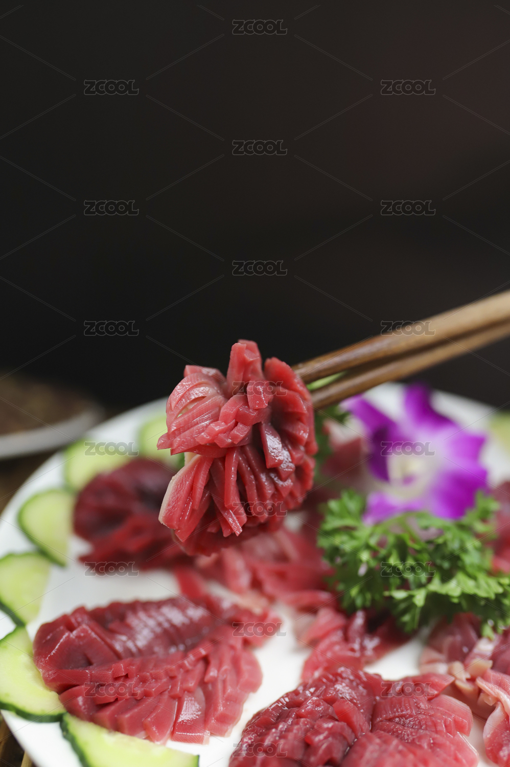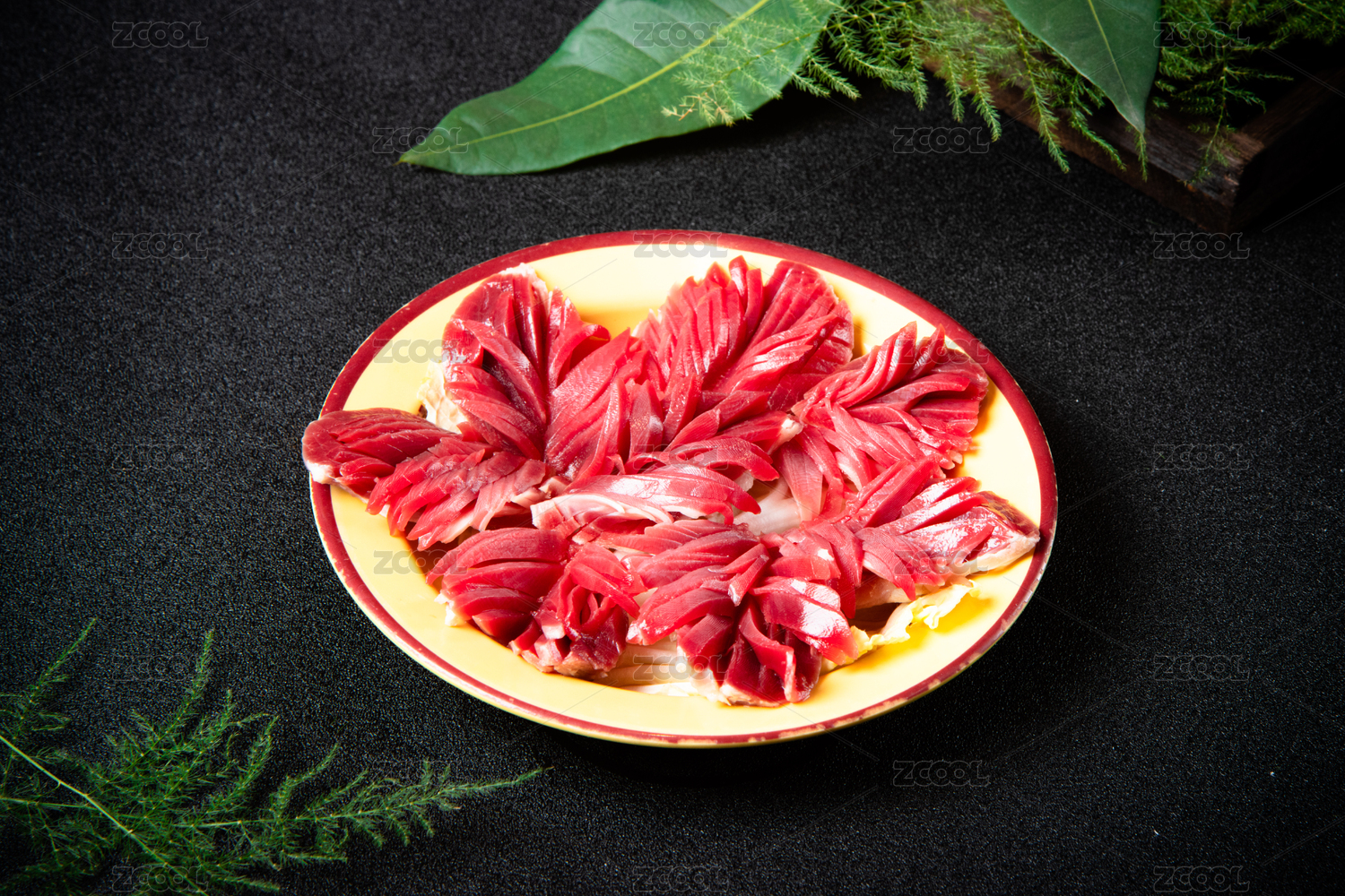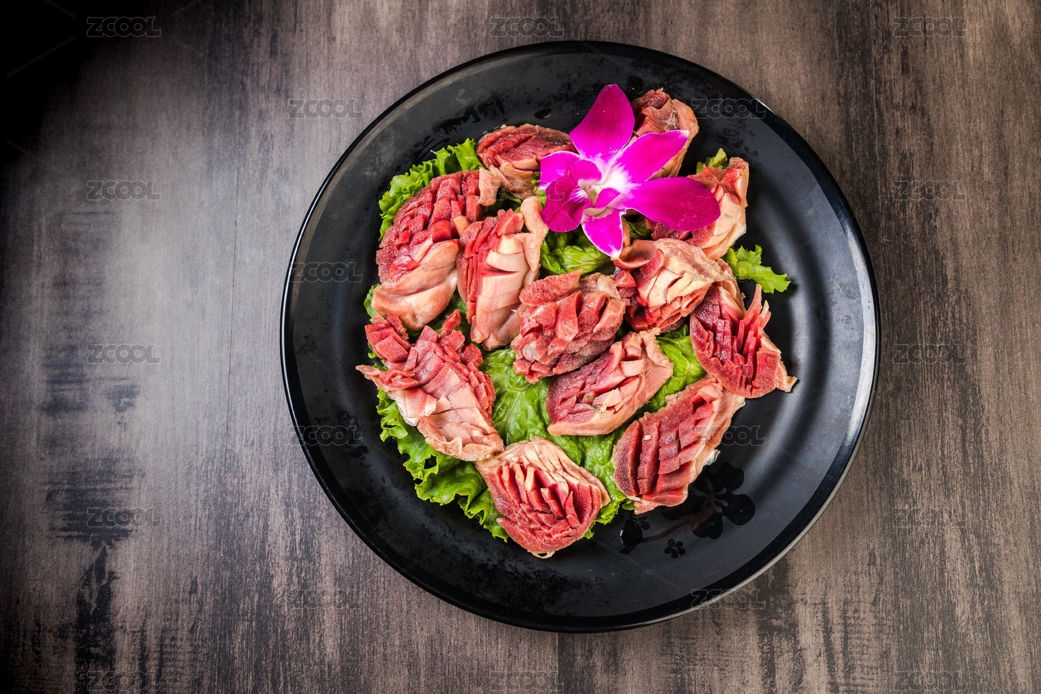 木桌上白盤里的重慶火鍋菜品郡花雞胗鴨郡