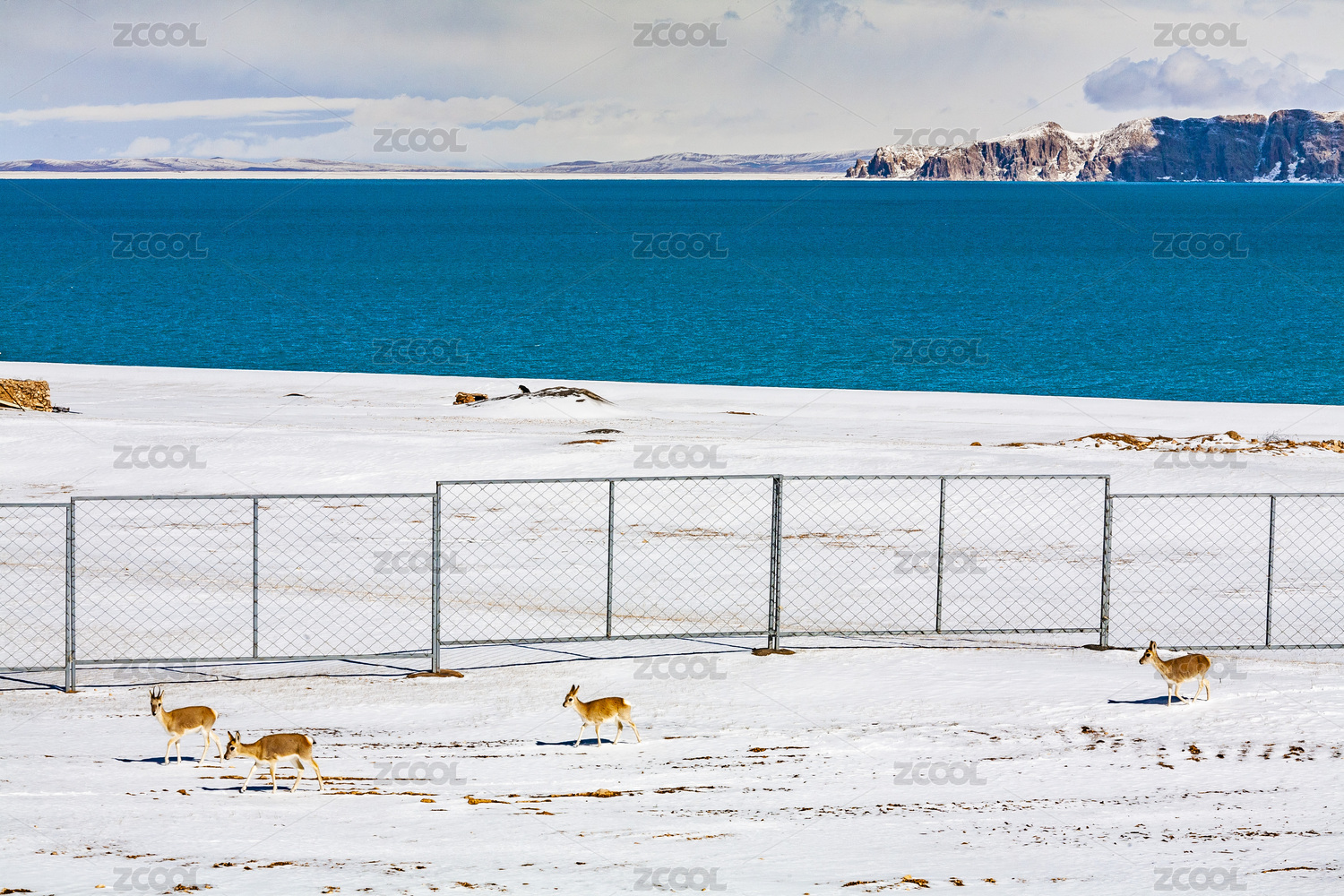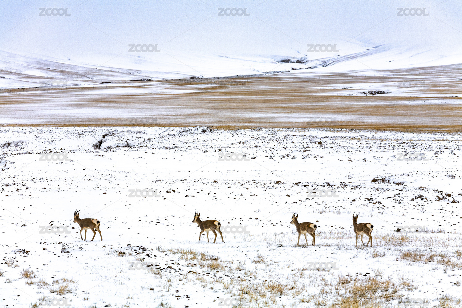中國西藏那曲地區(qū)317國道邊的雪原里藏羚