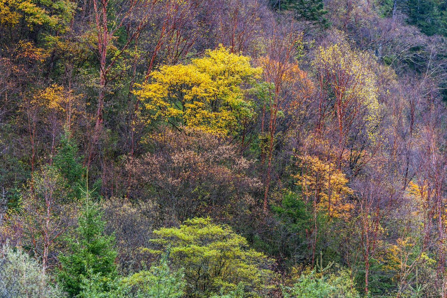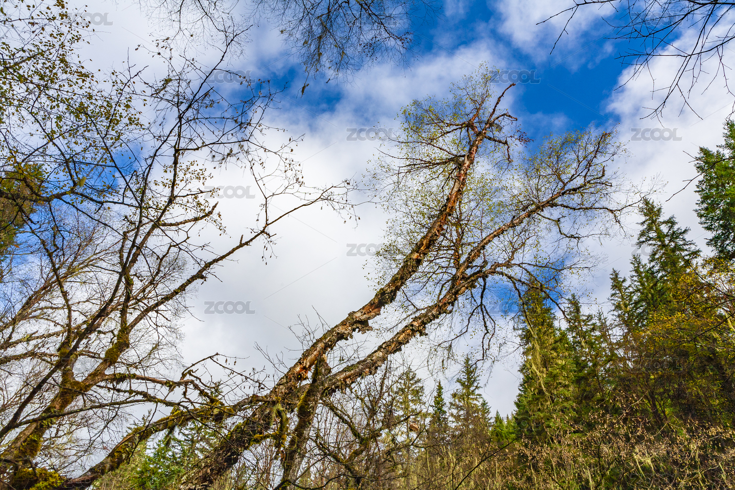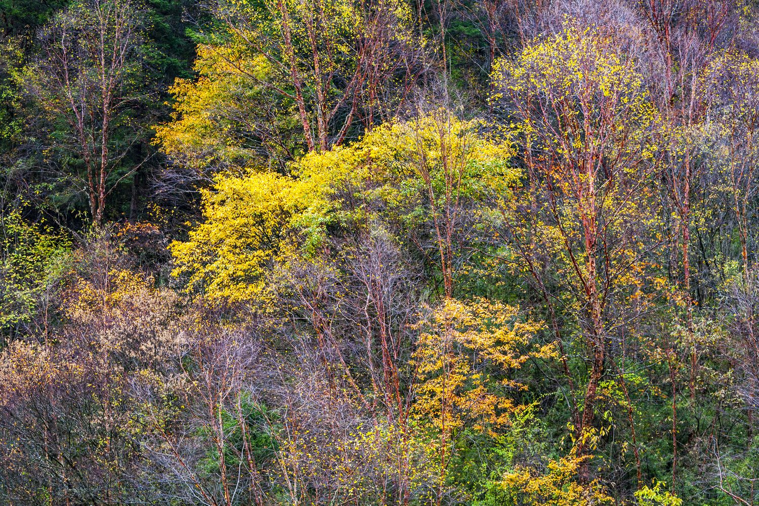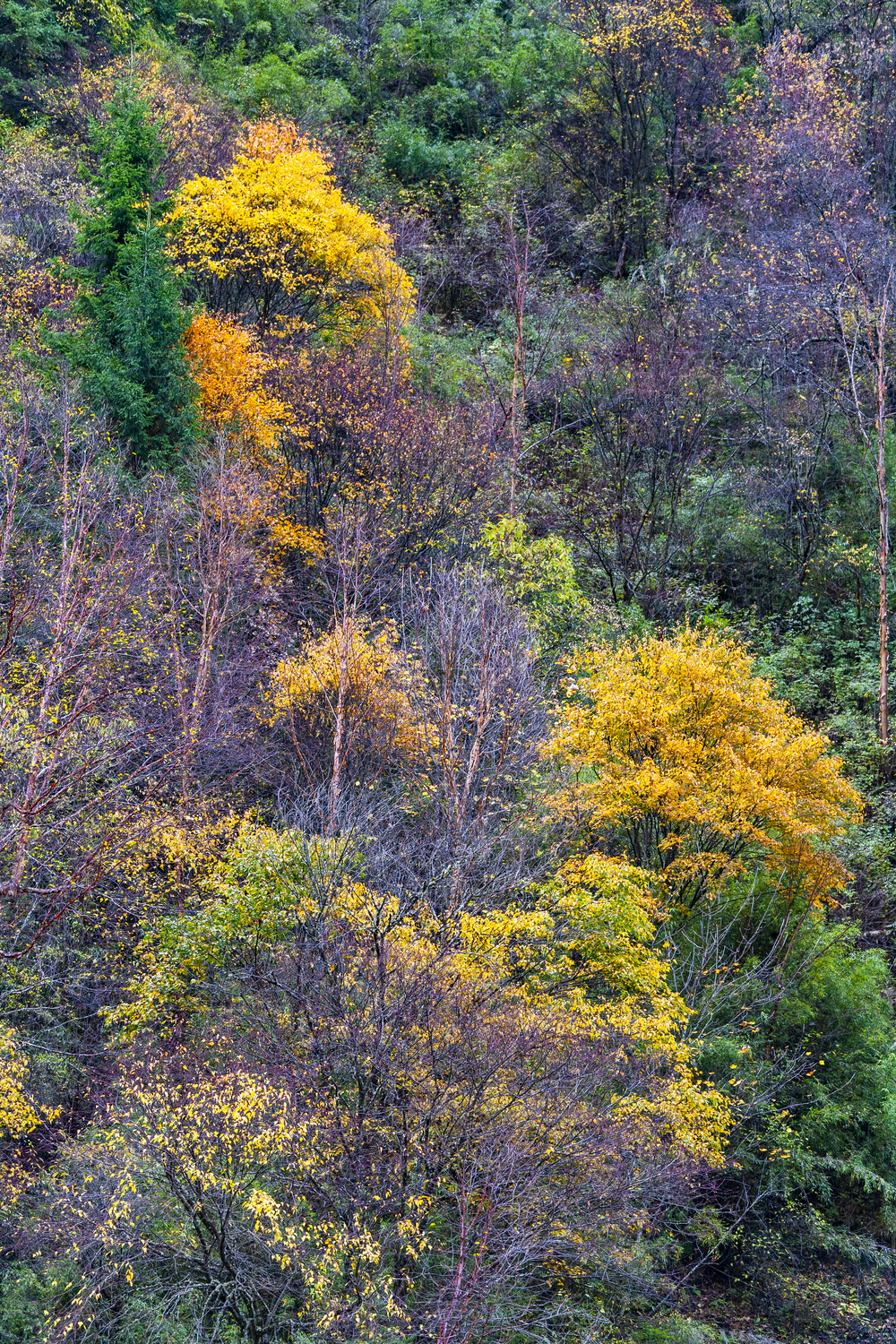 中國(guó)四川黑水縣卡龍溝秋天斑駁的大樹(shù)