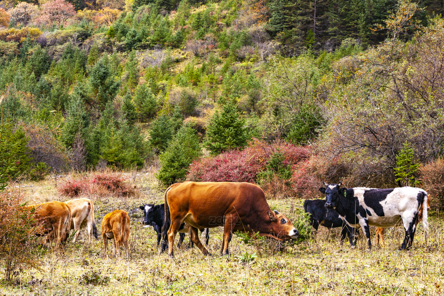 中國(guó)四川黑水縣卡龍溝秋天的彩林牧場(chǎng)和牛