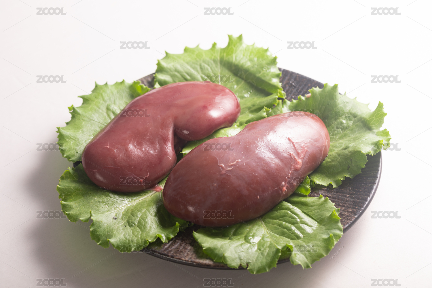 中式場(chǎng)景中放在生菜上的兩個(gè)新鮮豬腰子