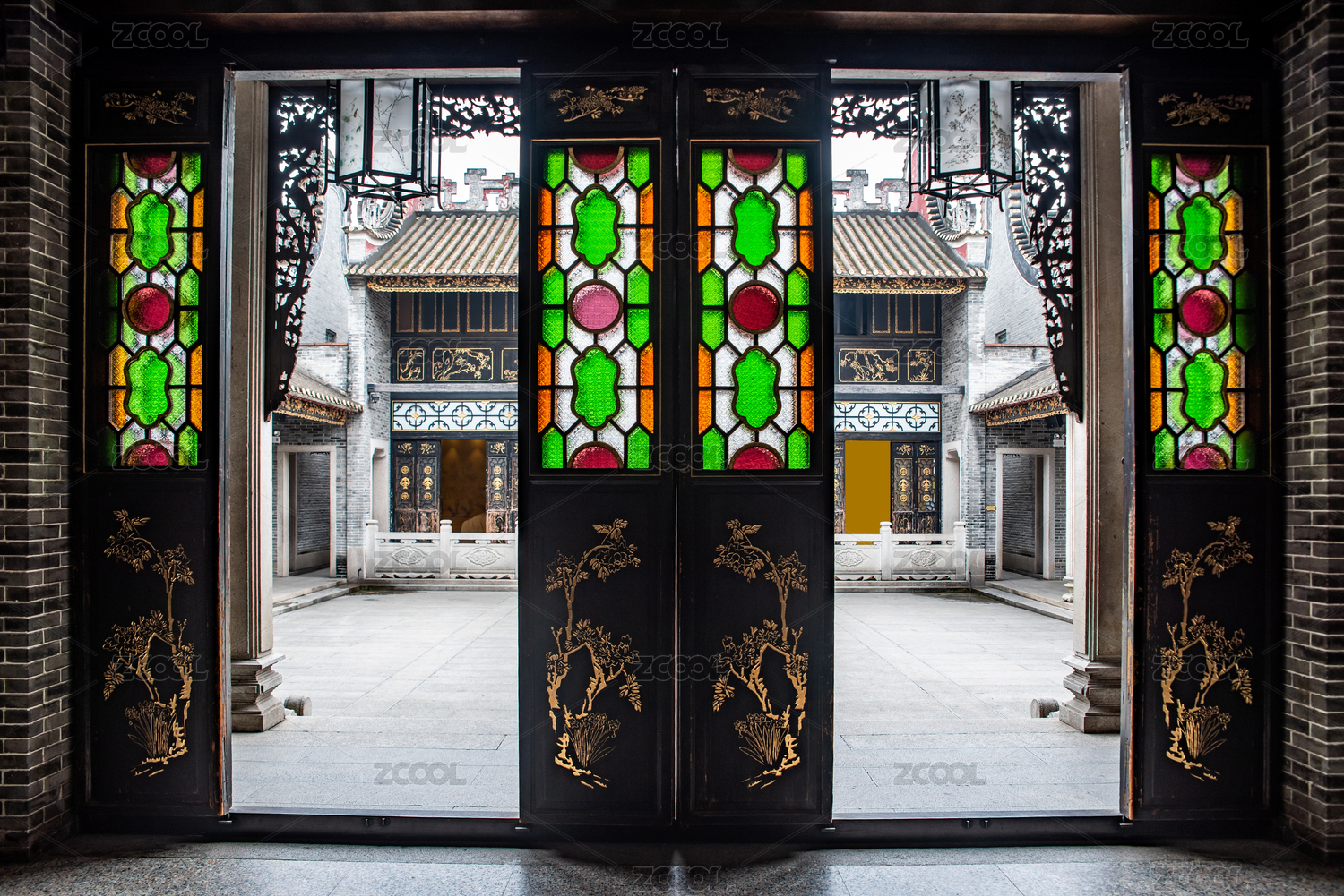 中國廣東省佛山祖廟嶺南古建筑庭院的隔扇門