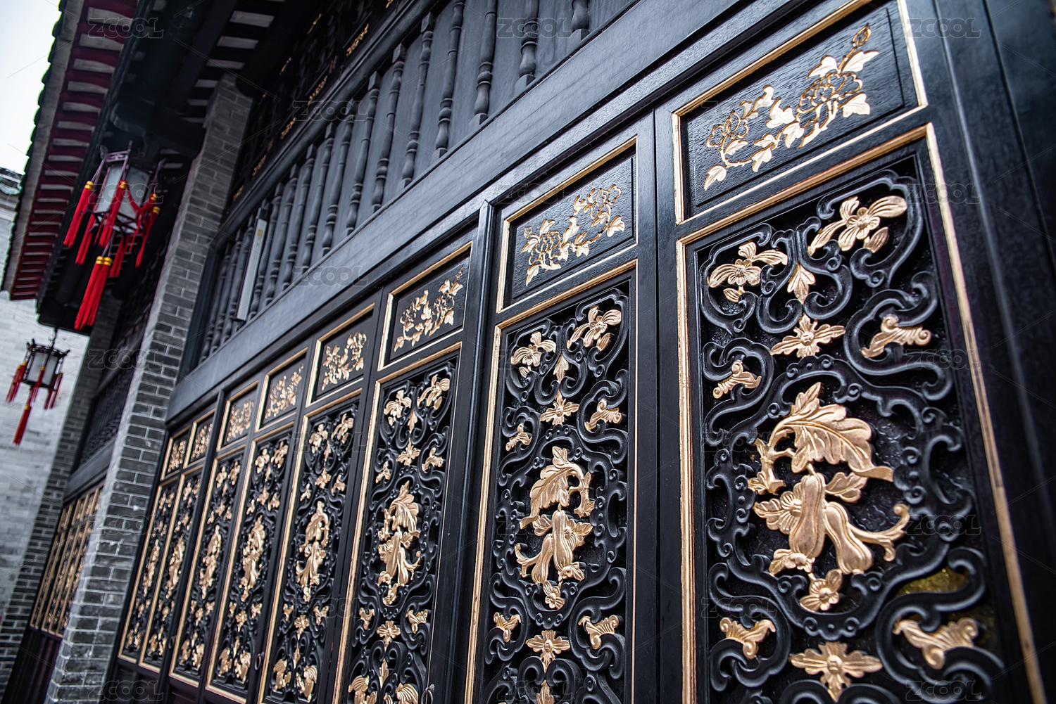 中國廣東省佛山祖廟嶺南古建筑庭院的黑金漆木雕絲瓜花卉隔扇門木板門