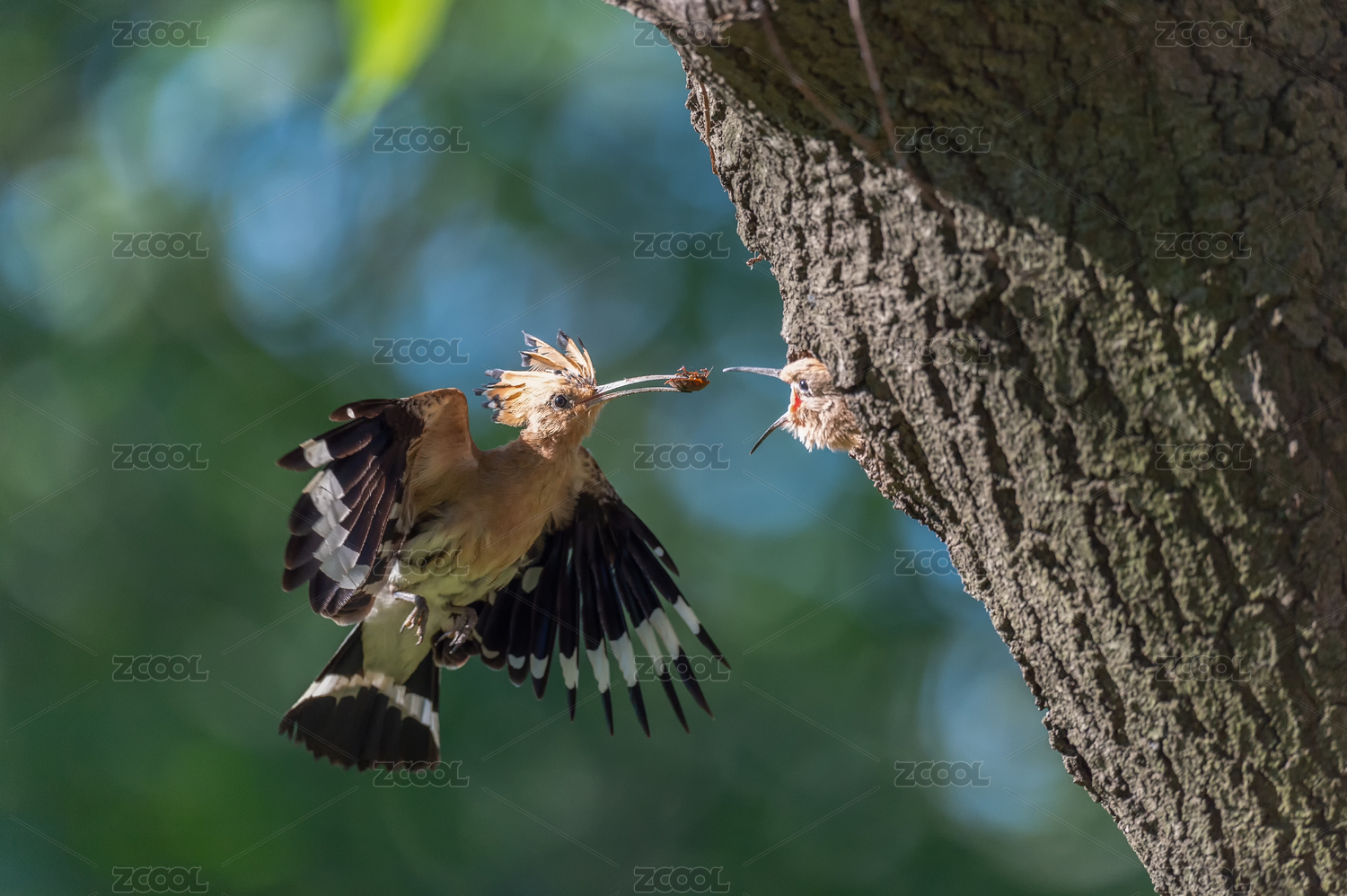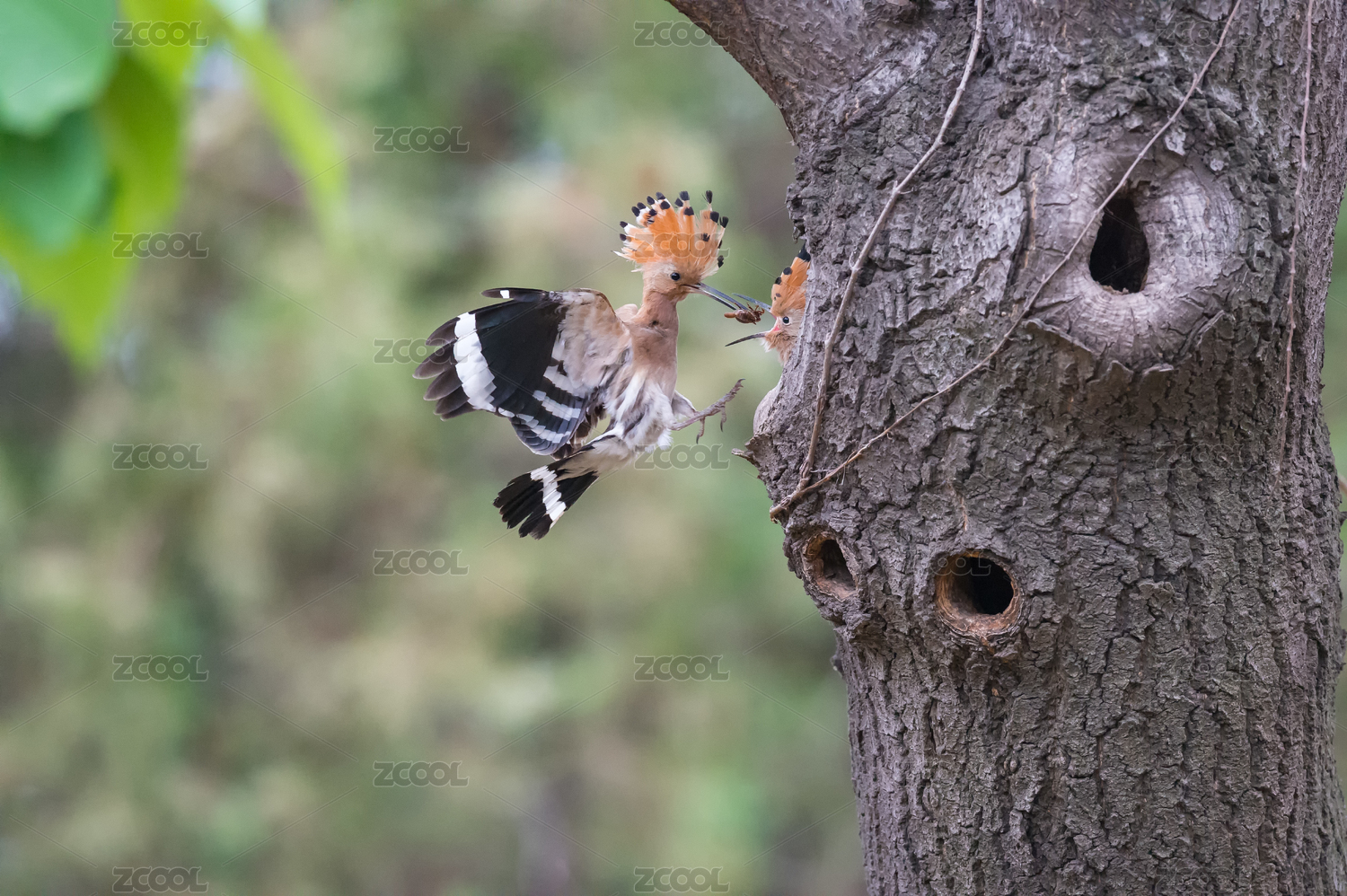 樹洞口一只戴勝親鳥在給小鳥喂食