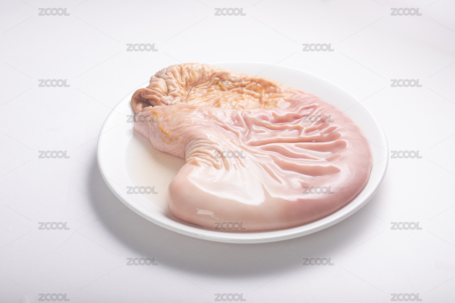 桌子上裝在白色盤(pán)子里的一個(gè)新鮮豬肚食材