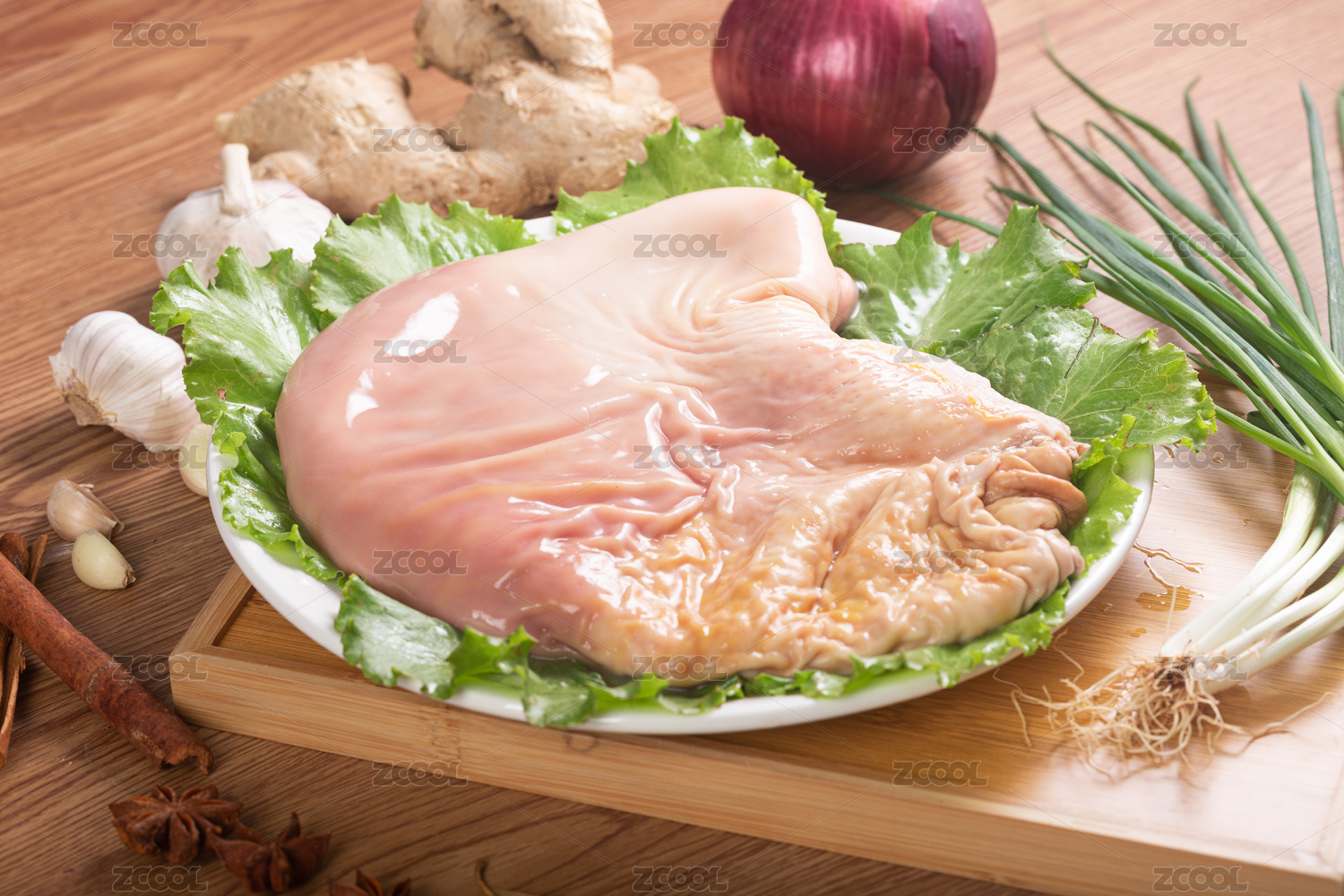 木桌上裝在白色盤(pán)子里的新鮮豬肚食材
