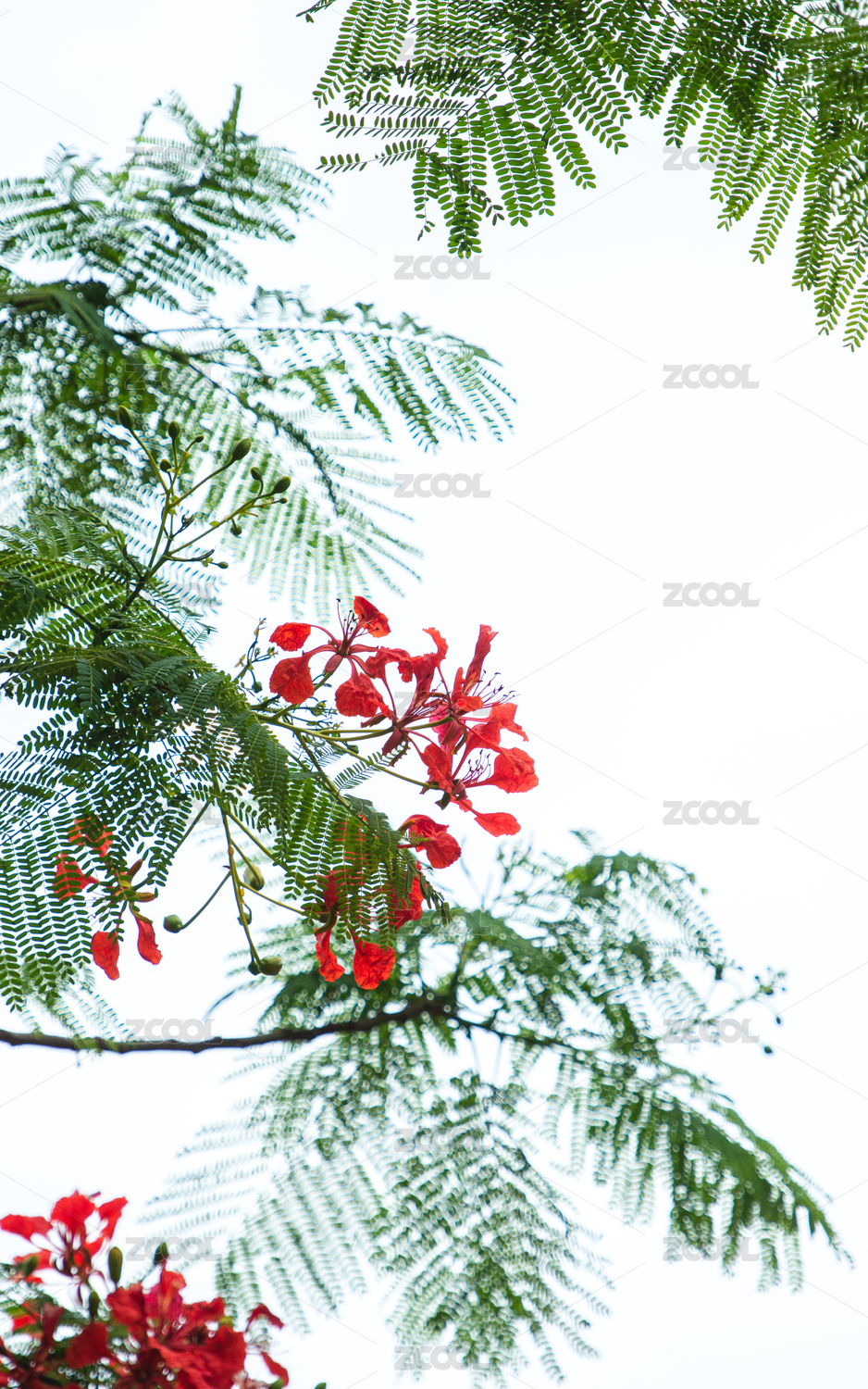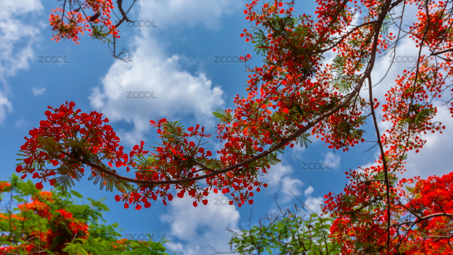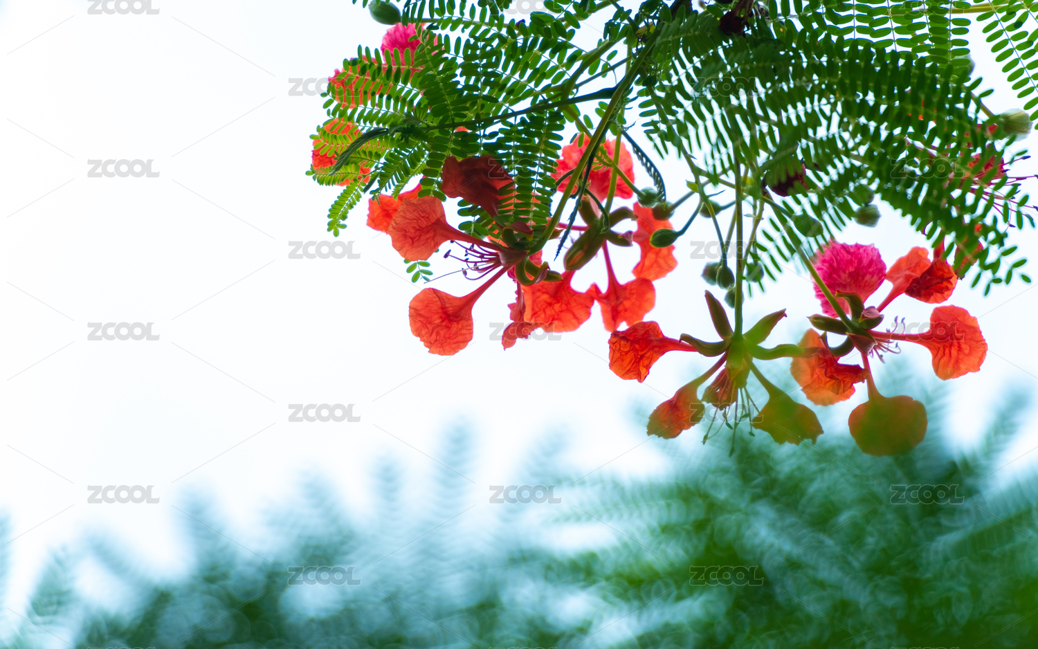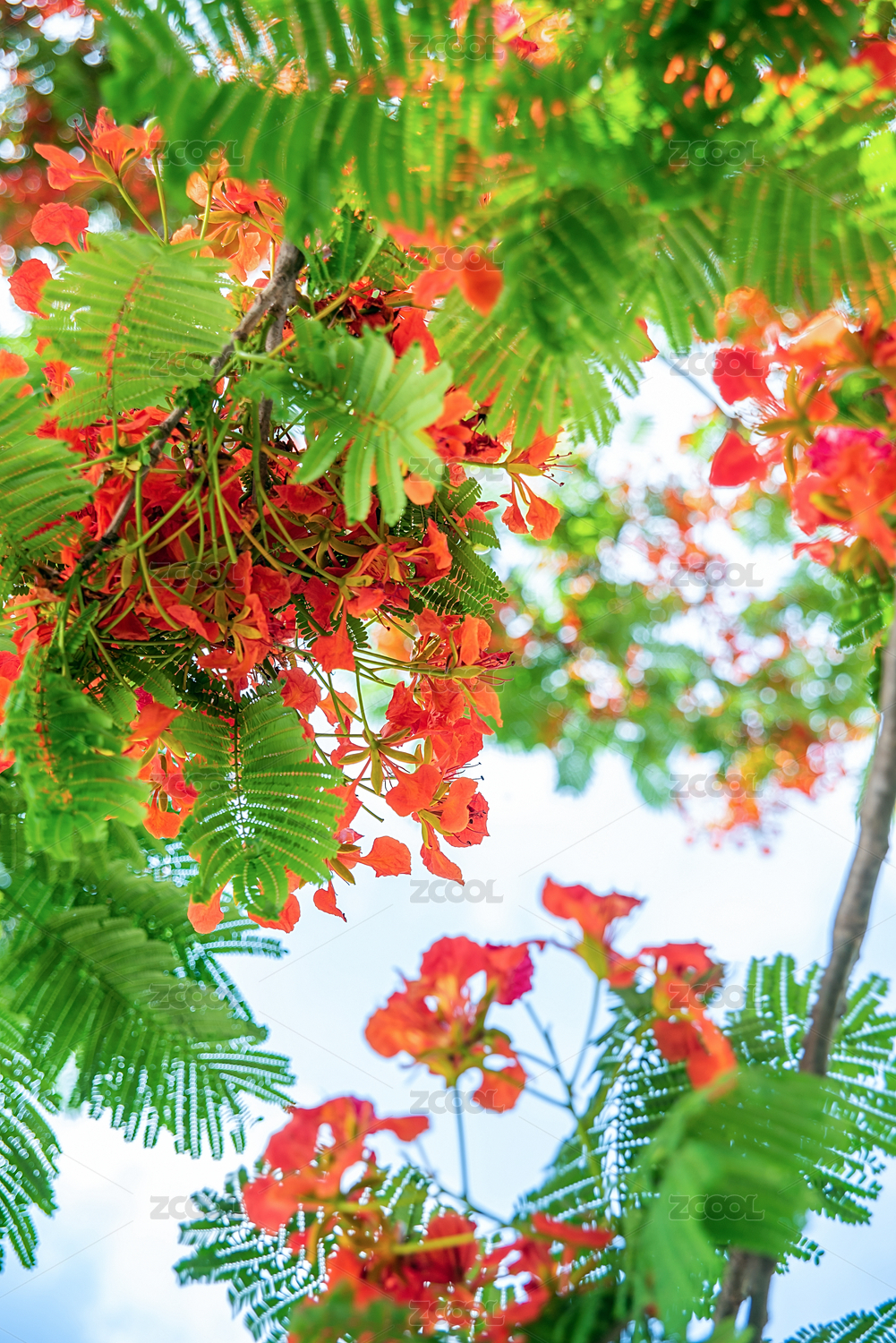 夏天盛開的紅艷艷的鳳凰花和綠葉背景